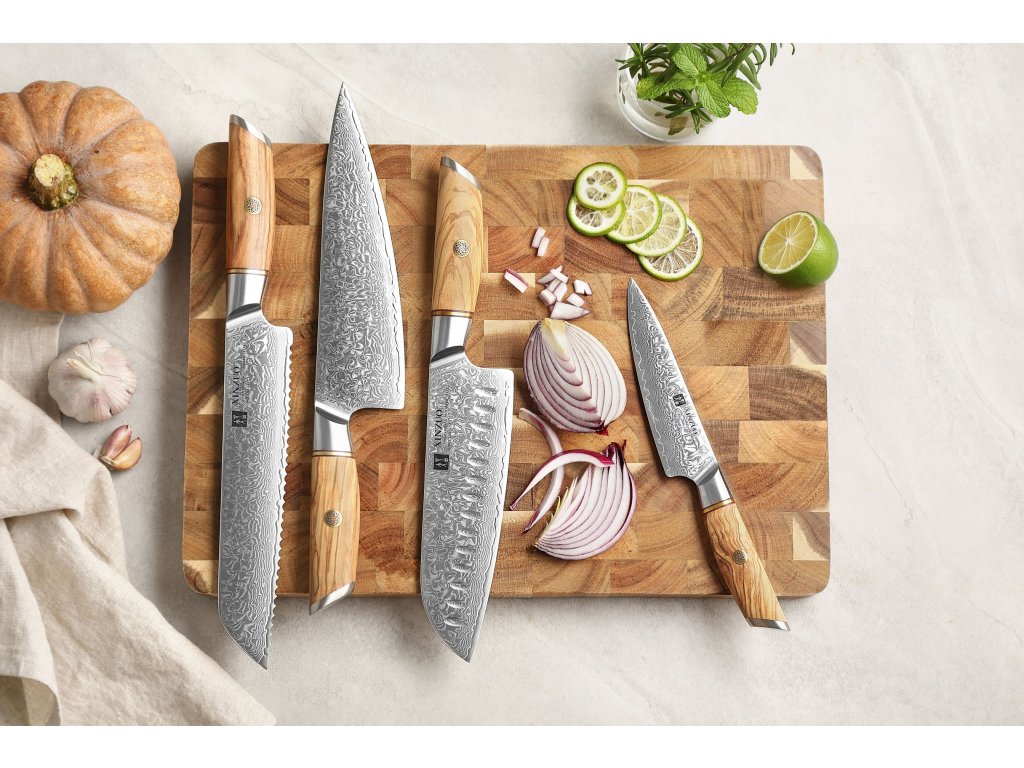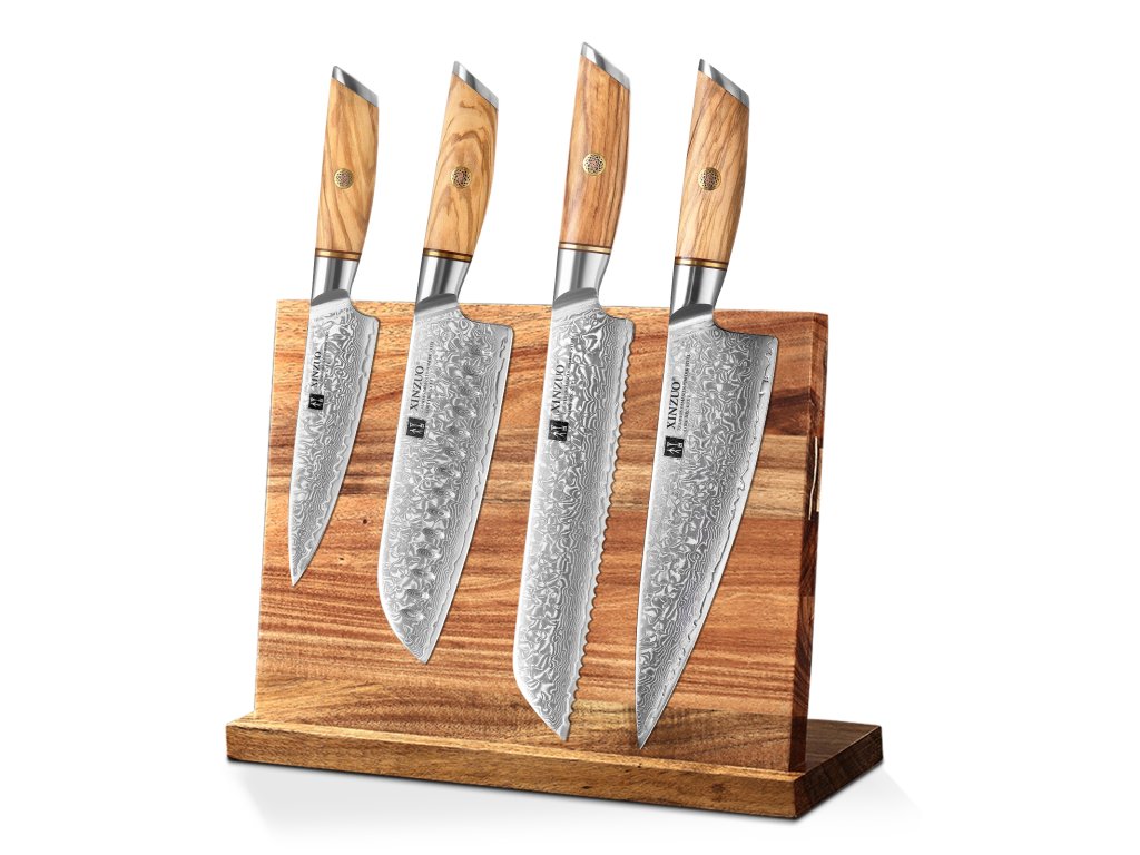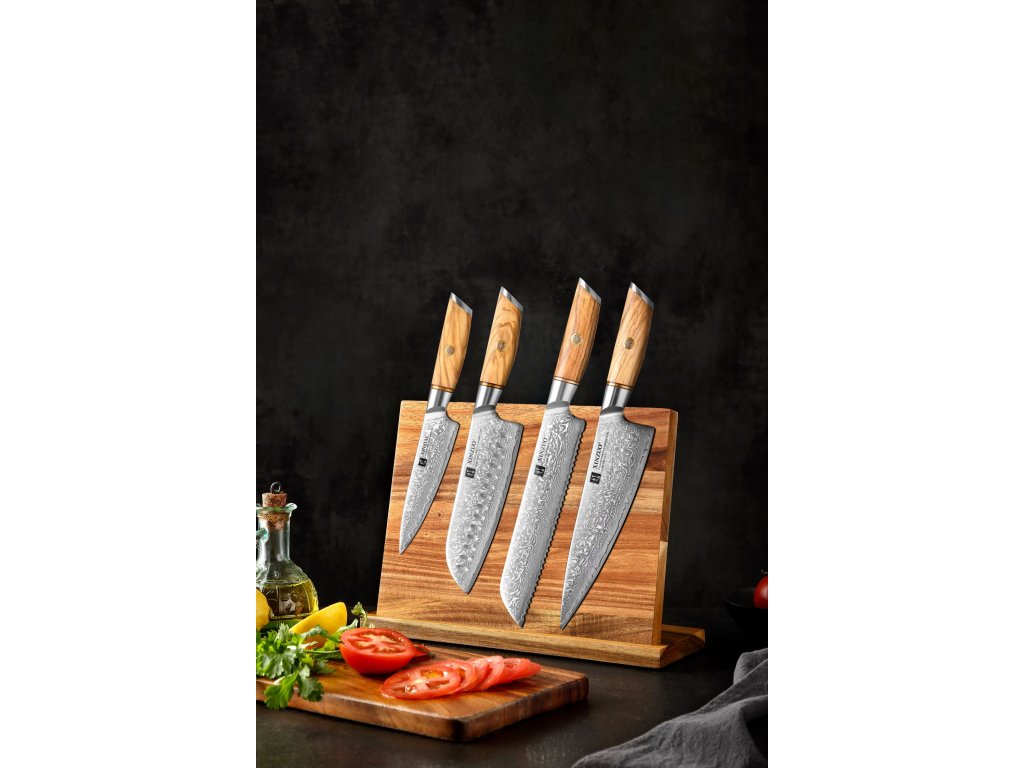 Ein Set aus vier Messern XinZuo Lan B37 aus Damaszener Stahl mit Olivenholzgriff und einem Magnet-Messerblock. Dieses Set enthält die meistverwendeten Messer für die Zubereitung der österreichischen Küche.