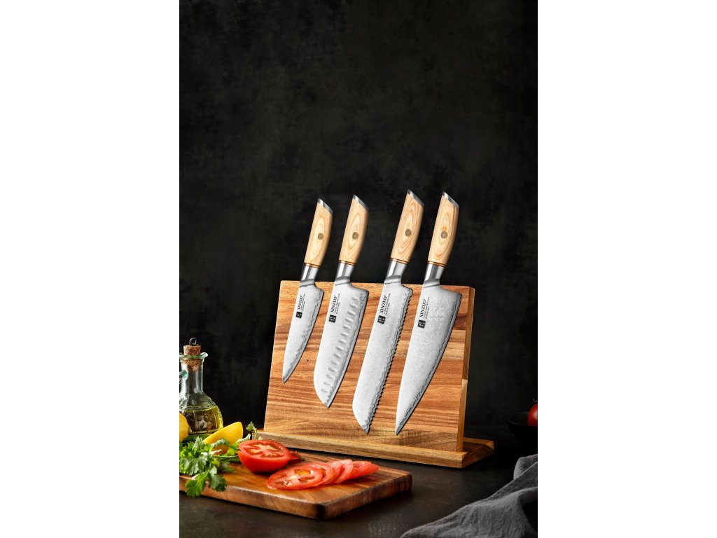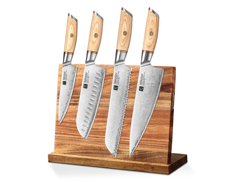Ein Messerset mit 4 Messern XinZuo Lan B37S aus Verbundstahl mit Griff aus Pakkaholz und einem modernem´n Magnet-Messerblock. Dieses Set enthält die meistverwendeten Messer für die Zubereitung der österreichischen Küche.