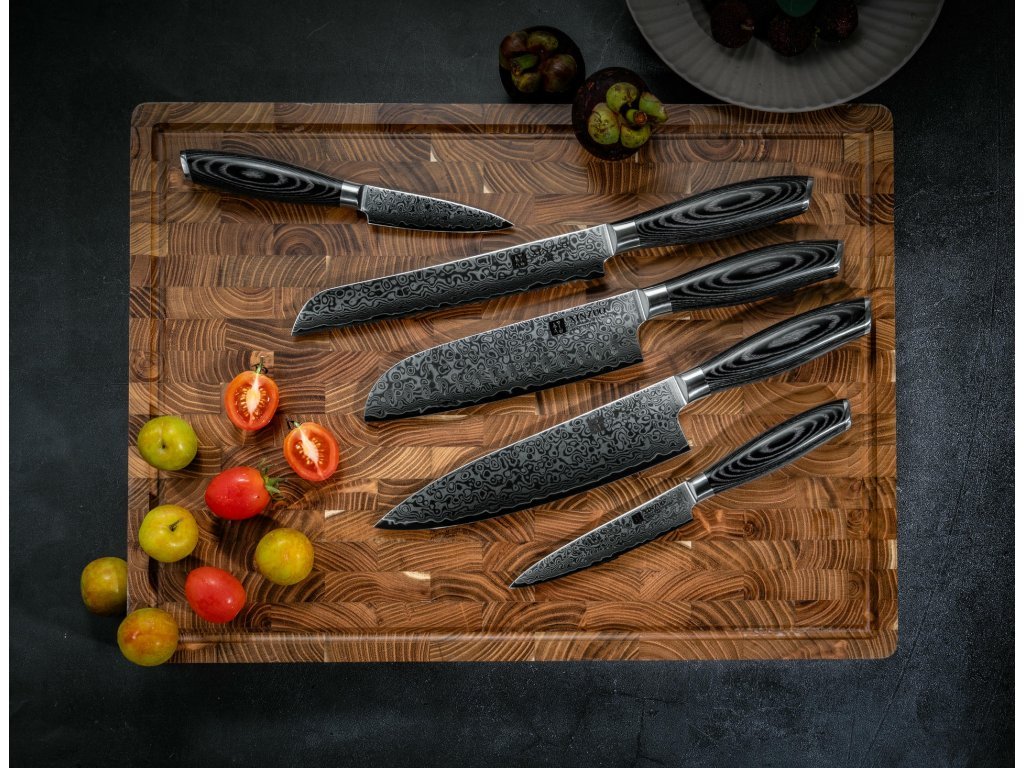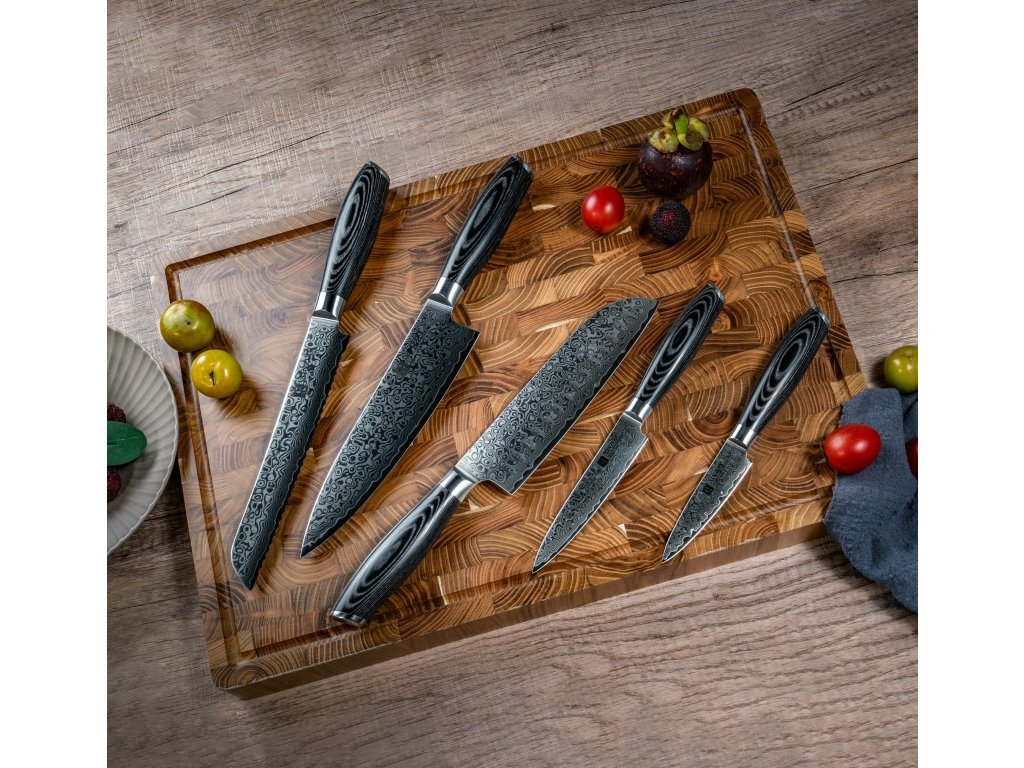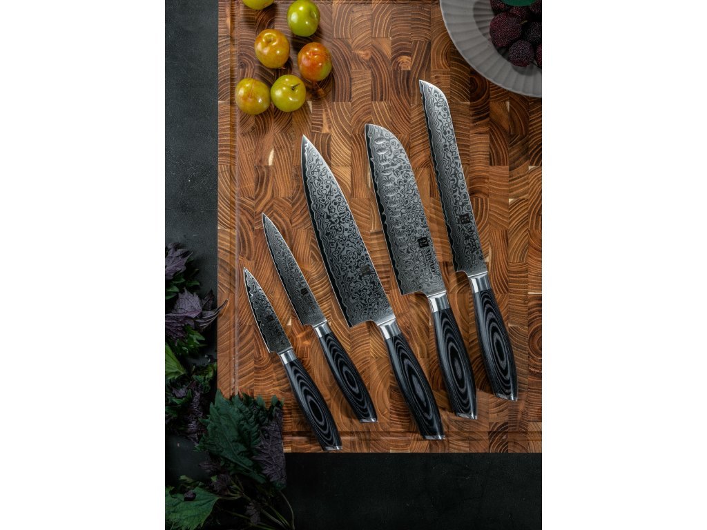 | Messer im Set: | Santoku, Kochmesser, Gemüsemesser, Schälmesser, Brotmesser |