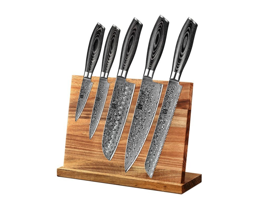 In diesem Set sind die Messer aus hochwertigem Damaszener Stahl gefertigt, der für die Herstellung der besten Messer verwendet wird. Deren Messerklinge mit einer Härte von 60±2 Rockwell besteht aus 67 Schichten. Hochwertiger Stahl in einer Kombination von traditioneller Herstellung garantiert eine lange Lebensdauer des Messers. Die Oberfläche des Messers bietet beim Schneiden Komfort, ohne dass es reibt oder dass die Zutaten an die Klinge pappen. Der Messergriff besteht aus wartungsfreiem Material, das mit der Zeit weder weicher wird noch Geruch annimmt. Dank seiner perfekten Form und Länge wird das Schneiden zum Vergnügen und außerdem liegt das Messer gut in der Hand. Aufgrund des natürlichen Griff-Designs kann die Farbe und das Design leicht von den Produktbildern abweichen, da der Griff aus einem anderen Holzstück gefertigt wurde oder da das Alter des Holzes unterschiedlich ist. Der Farbton des Musters auf der Klinge kann von den Produktfotos abweichen, da jedes Messer durch das Stahlschichten einzigartig ist. Das Set enthält einen Magnet-Messerblock aus Akazienholz mit Gummifüßen, die das Verrutschen verhindern.