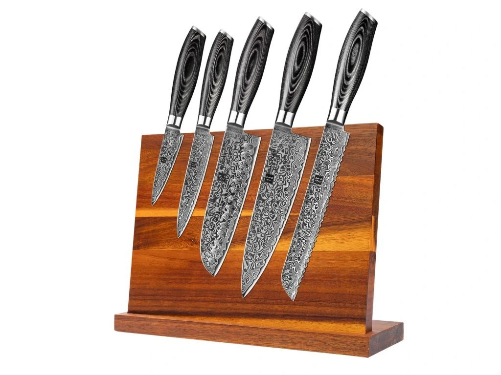 Das Messerset XinZuo Ya B20 mit einem Magnet-Messerblock enthält fünf Messer, darunter das beliebte Brotmesser. Die Klinge ist manuell und aus Damaszener Stahl gefertigt.
