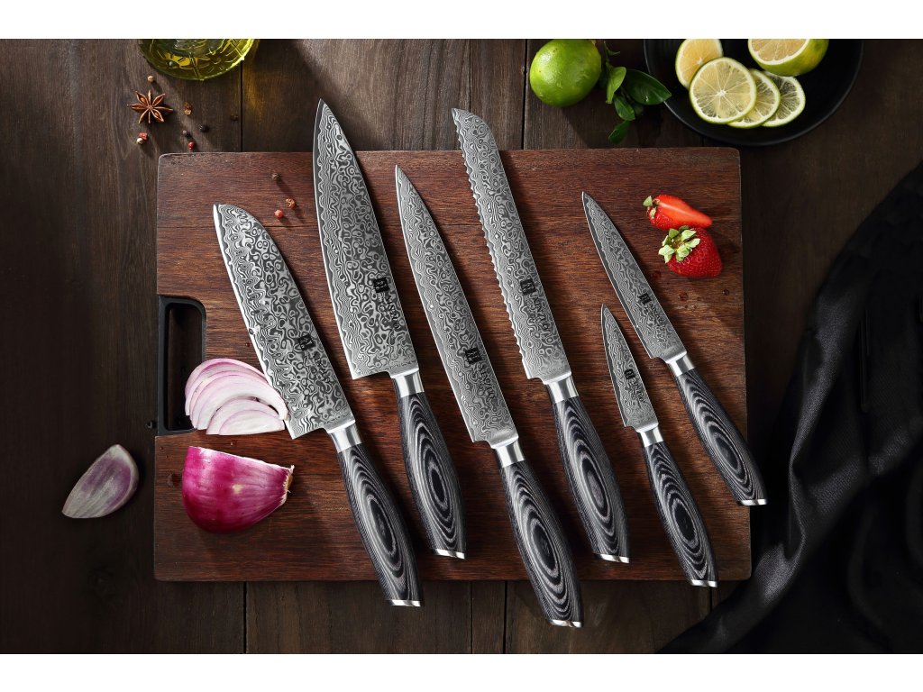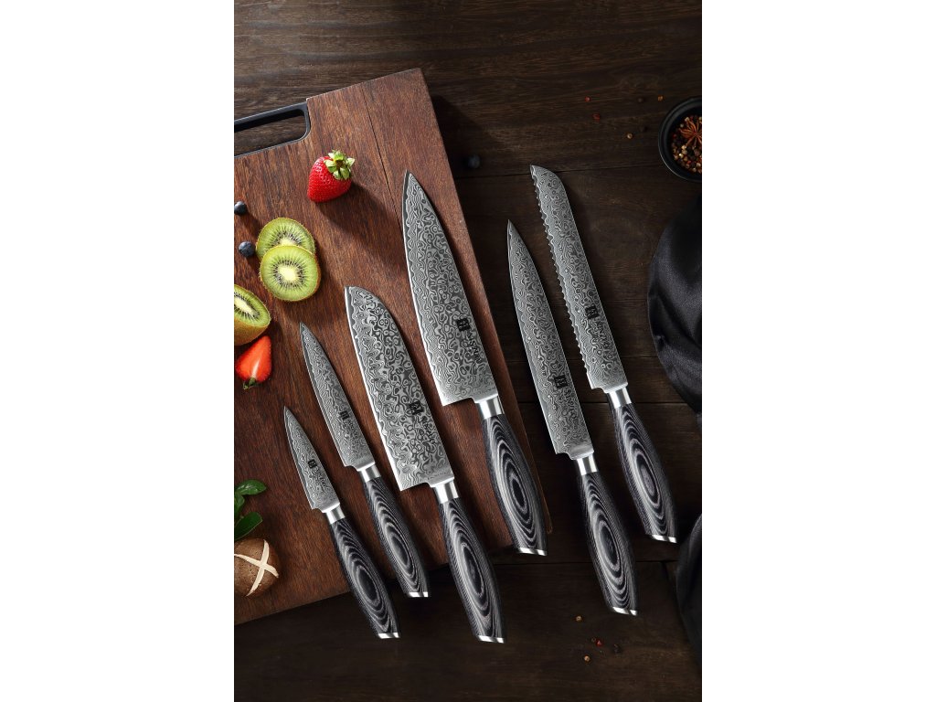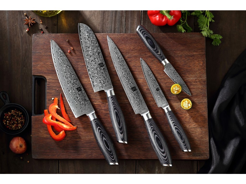 | Messer im Set: | Santoku, Kochmesser, Gemüsemesser, Schälmesser, Brotmesser |
