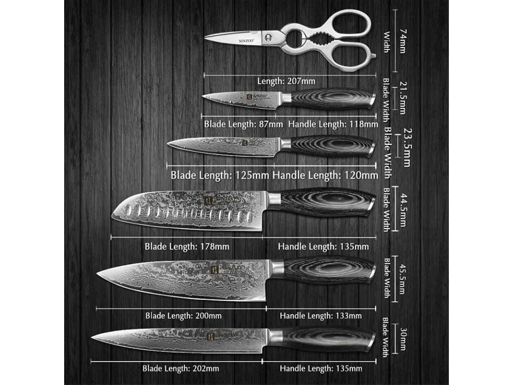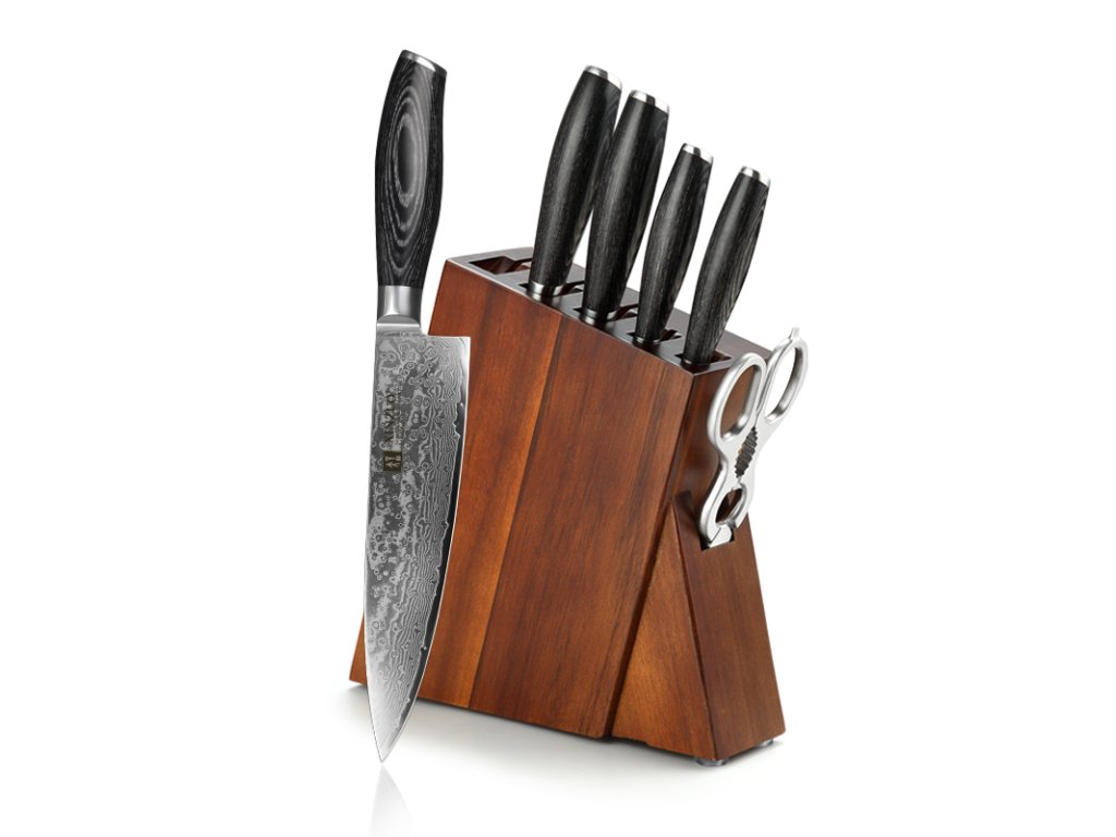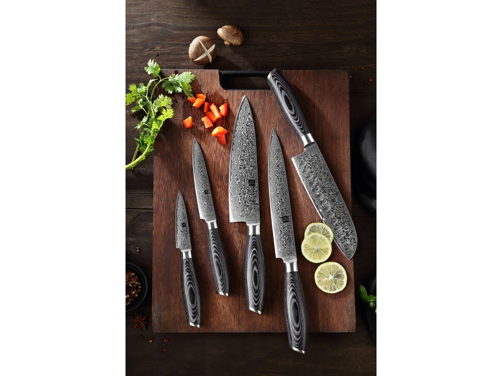 In diesem Set sind die Messer aus hochwertigem Damaszener Stahl gefertigt, der für die Herstellung der besten Messer verwendet wird. Deren Messerklinge mit einer Härte von 60±2 Rockwell besteht aus 67 Schichten. Hochwertiger Stahl in einer Kombination von traditioneller Herstellung garantiert eine lange Lebensdauer des Messers. Die Oberfläche des Messers bietet beim Schneiden Komfort, ohne dass es reibt oder dass die Zutaten an die Klinge pappen. Der Messergriff besteht aus wartungsfreiem Material, das mit der Zeit weder weicher wird noch Geruch annimmt. Dank seiner perfekten Form und Länge wird das Schneiden zum Vergnügen und außerdem liegt das Messer gut in der Hand. Aufgrund des natürlichen Griff-Designs kann die Farbe und das Design leicht von den Produktbildern abweichen, da der Griff aus einem anderen Holzstück gefertigt wurde oder da das Alter des Holzes unterschiedlich ist. Der Farbton des Musters auf der Klinge kann von den Produktfotos abweichen, da jedes Messer durch das Stahlschichten einzigartig ist. Das Set enthält außerdem einen Holzblock und eine Geflügelschere aus Edelstahl 3Cr14.