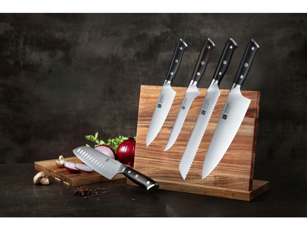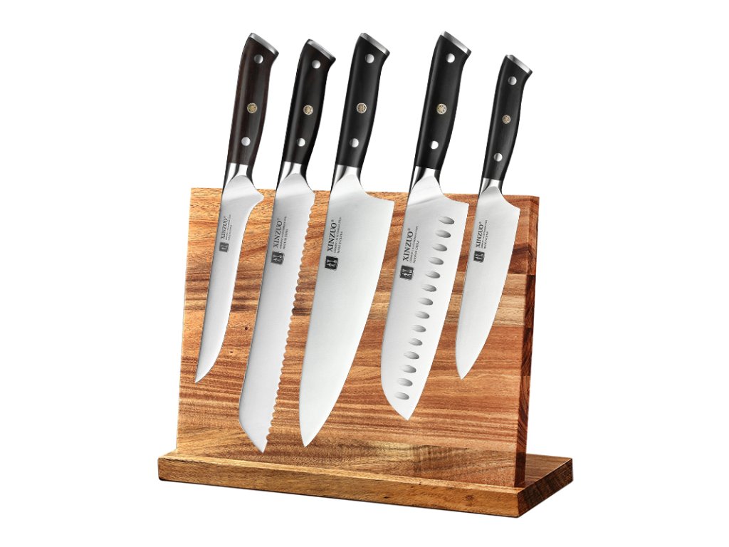 Hochwertiges Messerset XinZuo Yu B13S mit 5 Messern aus deutschem Stahl und Griffen aus Ebenholz kommt mit einem klassischen Messerblock aus Akazienholz.