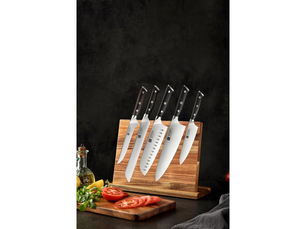 Die Messer in diesem Set sind aus hochwertigem deutschem Stahl gefertigt - dieser wird für die Herstellung erstklassiger Messer verwendet. Seine Klinge ist eben aus diesem Stahl mit einer Härte von 56-58 Rockwell gefertigt. Hochwertiger Stahl in einer Kombination von traditioneller Herstellung garantiert eine lange Lebensdauer des Messers. Die Oberfläche des Messers bietet beim Schneiden Komfort, ohne dass es reibt oder dass die Zutaten an die Klinge pappen. Der Messergriff ist aus hochwertigem Ebenholz gefertigt, das mit der Zeit weder weicher wird noch einen Geruch annimmt. Dank seiner perfekten Form und Länge wird das Schneiden zum Vergnügen und außerdem liegt das Messer gut in der Hand. Aufgrund des natürlichen Griff-Designs kann die Farbe und das Design leicht von den Produktbildern abweichen, da der Griff aus einem anderen Holzstück gefertigt wurde oder da das Alter des Holzes unterschiedlich ist. Das Set enthält einen Magnet-Messerblock aus Akazienholz mit Gummifüßen, die das Verrutschen verhindern.