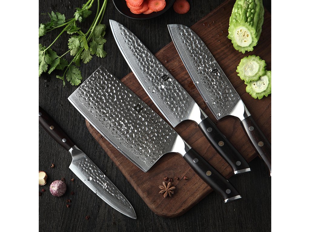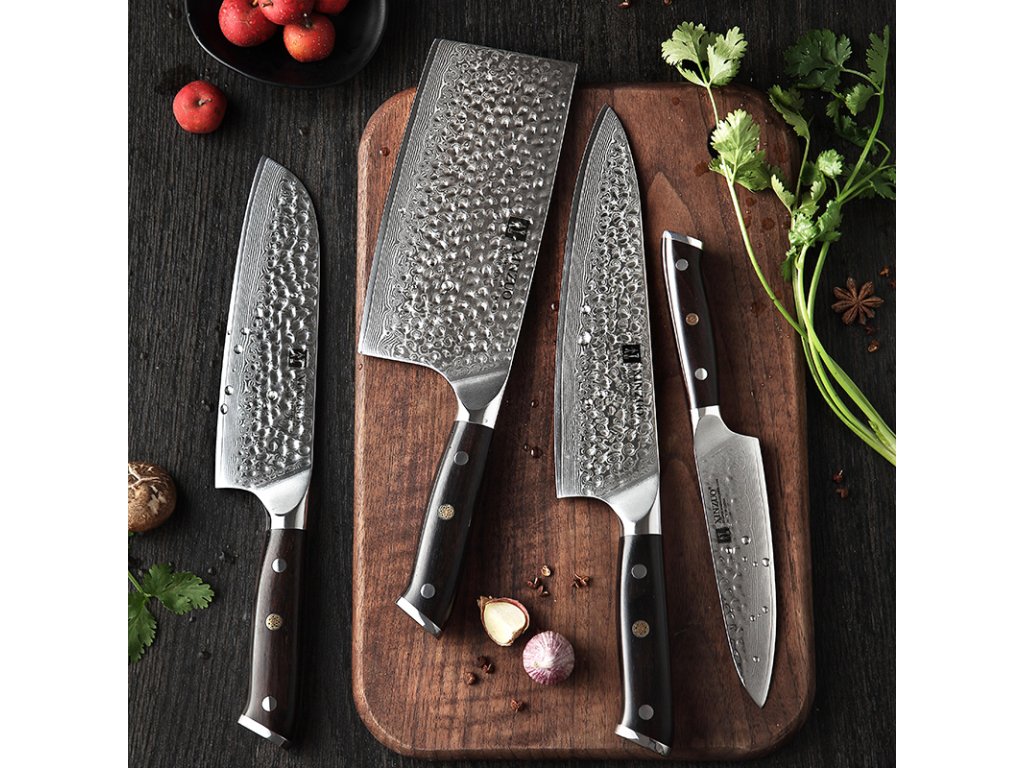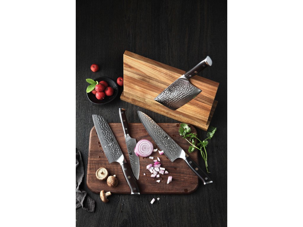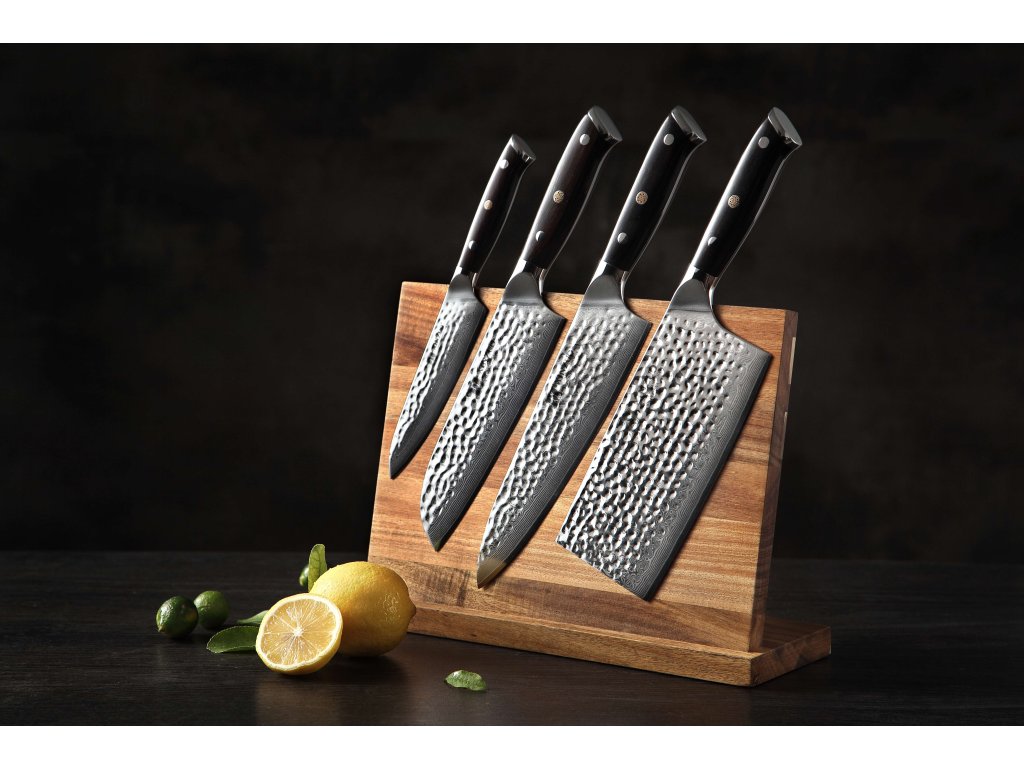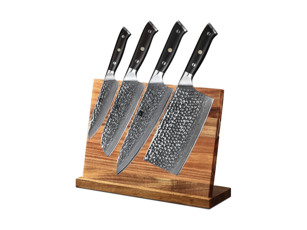 Das Messerset XinZuo Yu B13H besteht aus vier praktischen Messern aus hochwertigem Damaszener Stahl mit handgeschliffenen Klingen und einem Magnet-Messerblock aus Akazienholz.