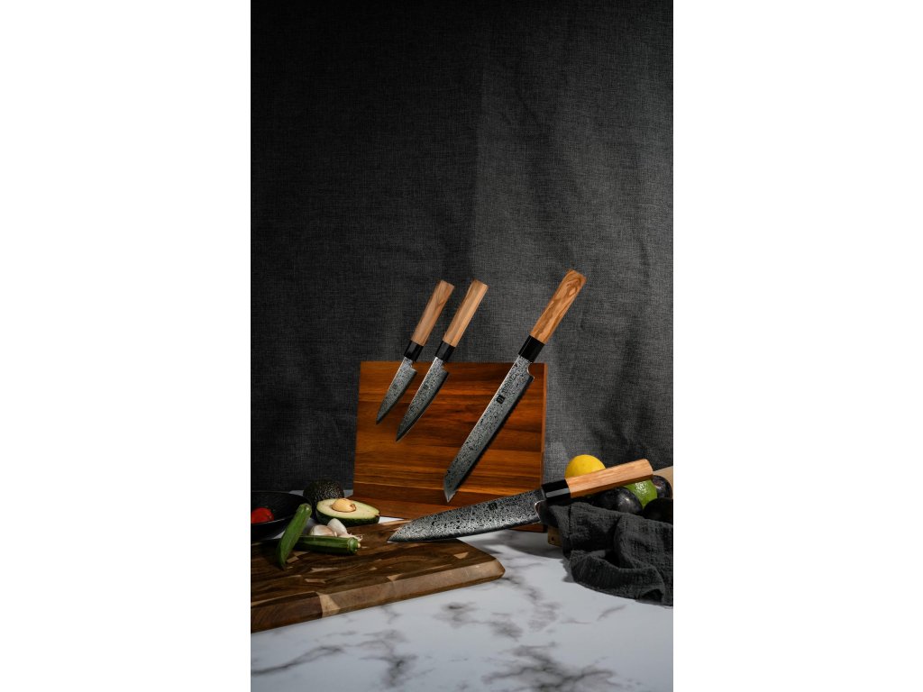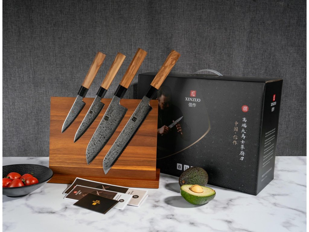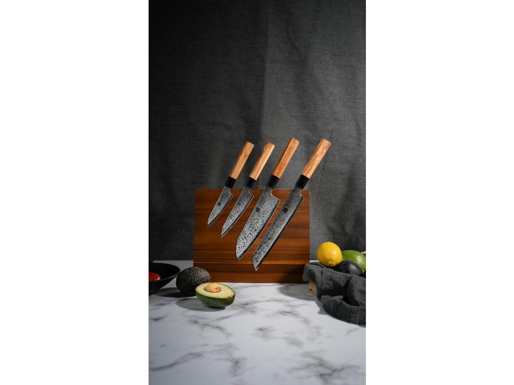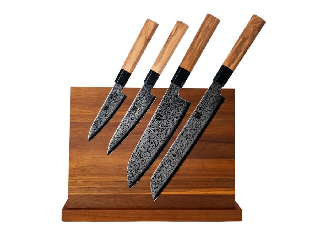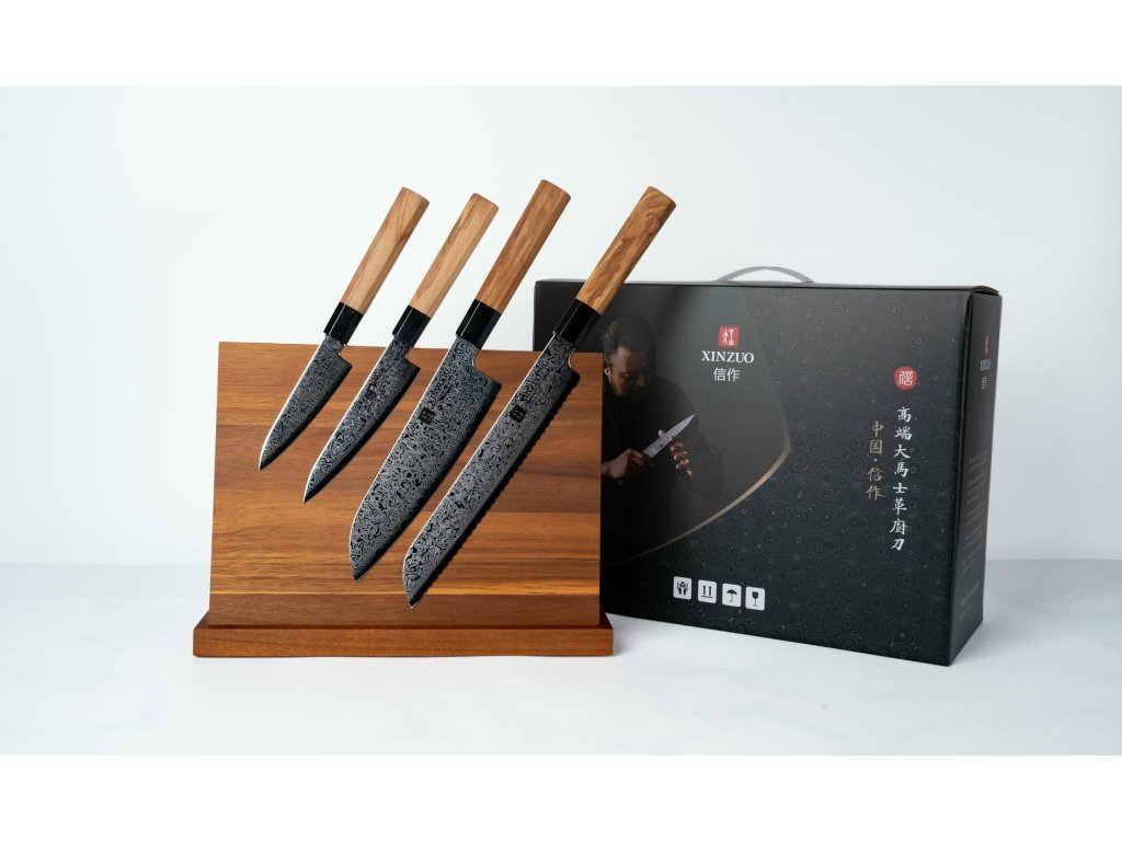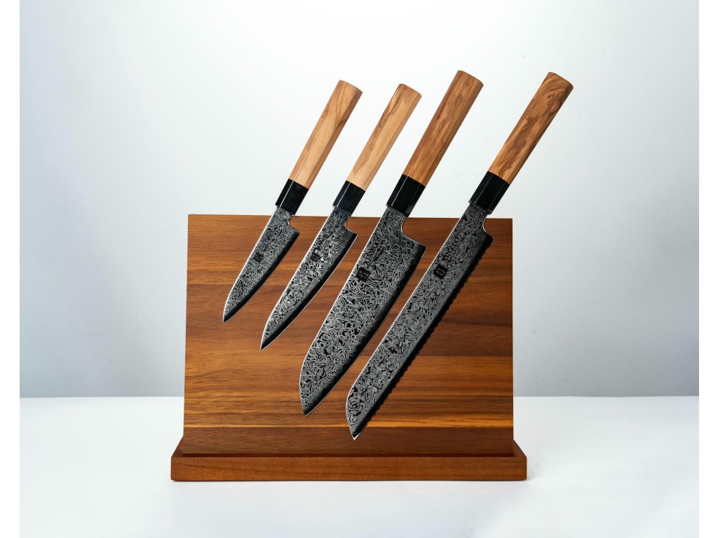 Messerset mit 4 Messern XinZuo Zhen PM8O aus Damaszener Stahl mit einem Magnet-Messerblock. Die Messer haben einen traditionellen japanischen Olivenholzgriff mit einem Wasserbüffelhorn.