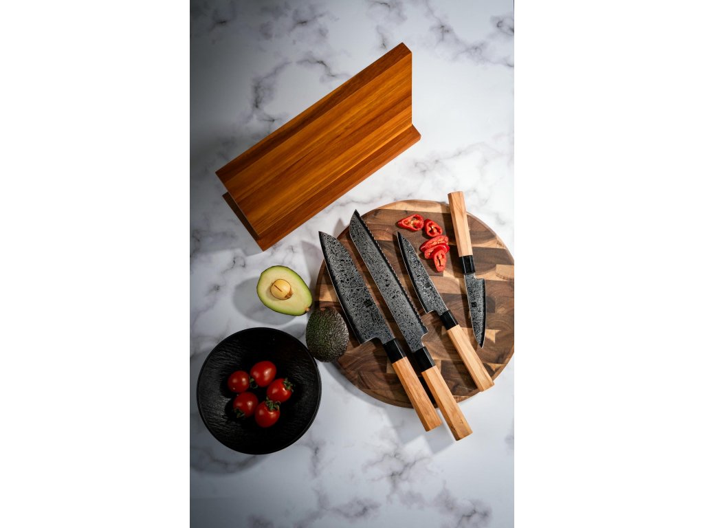 In diesem Set sind die Messer aus hochwertigem Damaszener Stahl gefertigt, der für die Herstellung der besten Messer verwendet wird. Deren Messerklinge mit einer Härte von 60±2 Rockwell besteht aus 67 Schichten. Der hochwertige Stahl in einer Kombination von traditioneller Herstellung garantiert eine lange Lebensdauer des Messers. Die Oberfläche des Messers bietet Komfort beim Schneiden, ohne dass es reibt oder dass die Zutaten an die Klinge pappen. Der Farbton des Musters auf der Klinge kann unterschiedlich sein, da jedes Messer durch das Stahlschichten einzigartig ist. Das Set enthält einen Magnet-Messerblock aus Akazienholz mit Gummifüßen, die das Verrutschen verhindern.