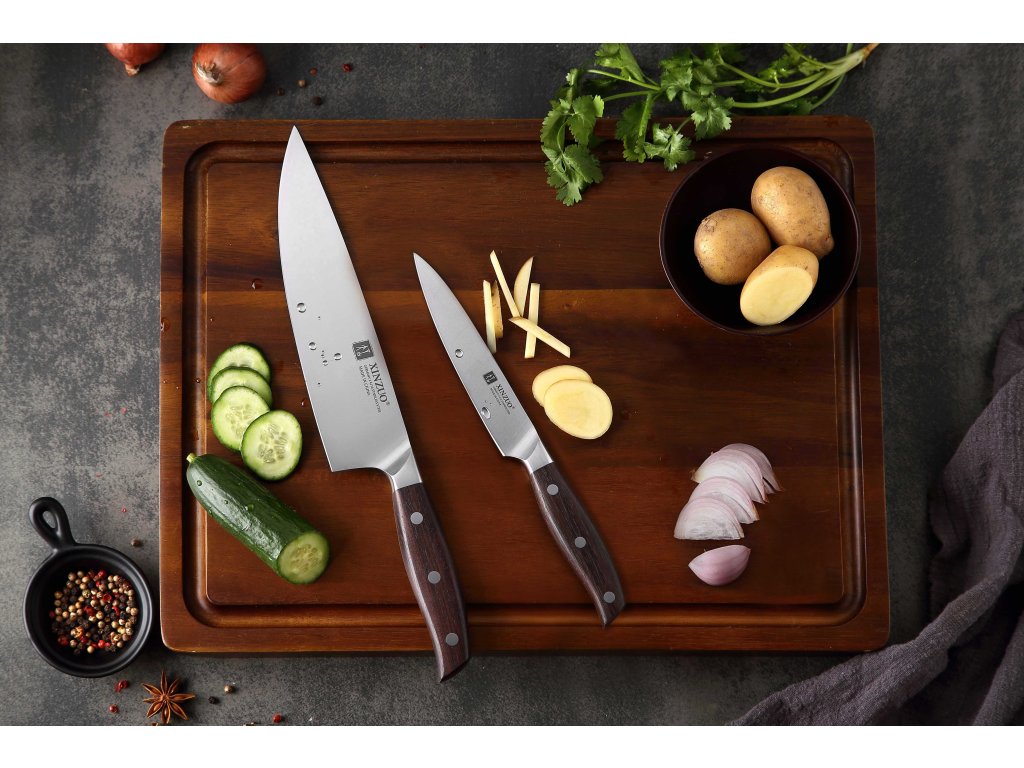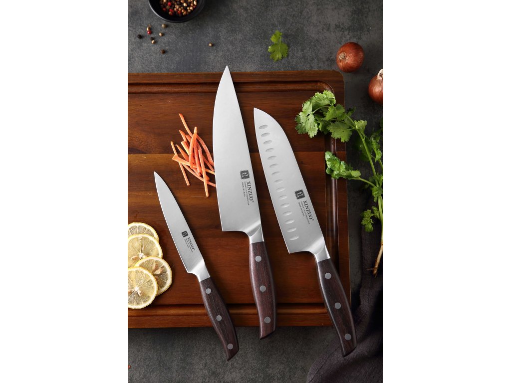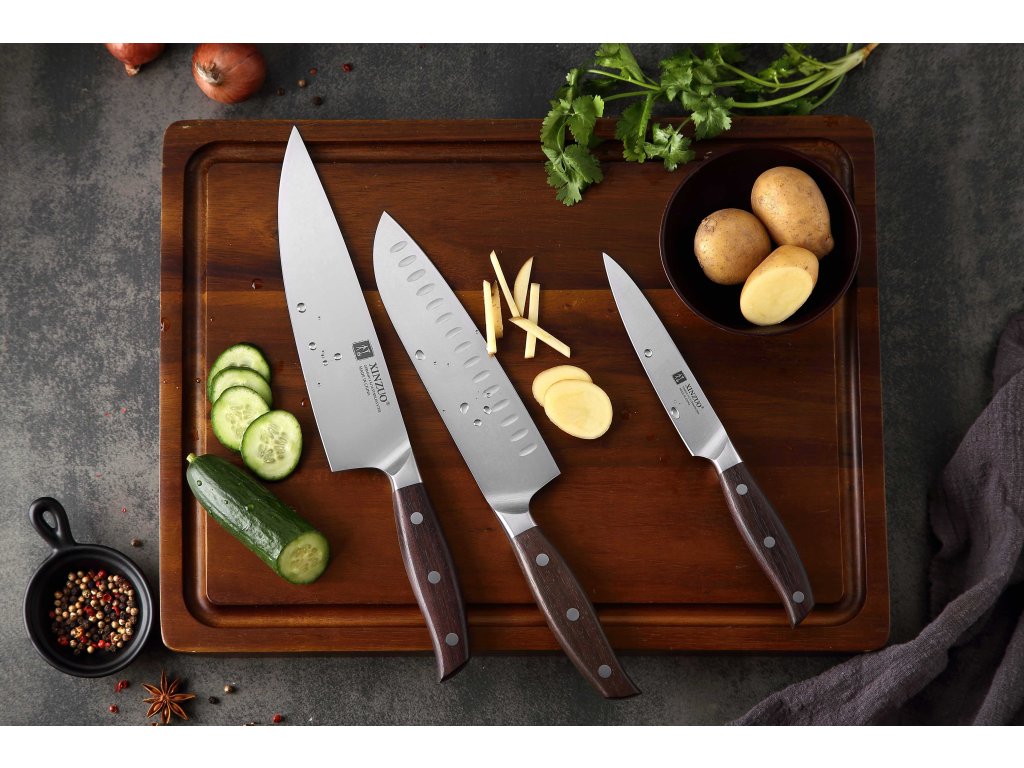 Die Messer in diesem Set sind aus hochwertigem deutschem Stahl gefertigt - dieser wird für die Herstellung erstklassiger Messer verwendet. Seine Klinge ist eben aus diesem Stahl mit einer Härte von 56-58 Rockwell gefertigt. Hochwertiger Stahl in einer Kombination von traditioneller Herstellung garantiert eine lange Lebensdauer des Messers. Die Oberfläche des Messers bietet beim Schneiden Komfort, ohne dass es reibt oder dass die Zutaten an die Klinge pappen. Der Messergriff ist aus hochwertigem Sandelholz gefertigt, das mit der Zeit weder weicher wird noch einen Geruch annimmt. Dank seiner perfekten Form und Länge wird das Schneiden zum Vergnügen und außerdem liegt das Messer gut in der Hand. Aufgrund des natürlichen Griff-Designs kann die Farbe und das Aussehen leicht von den Produktbildern abweichen, da der Griff aus einem anderen Holzstück gefertigt wurde oder da das Alter des Holzes unterschiedlich ist.