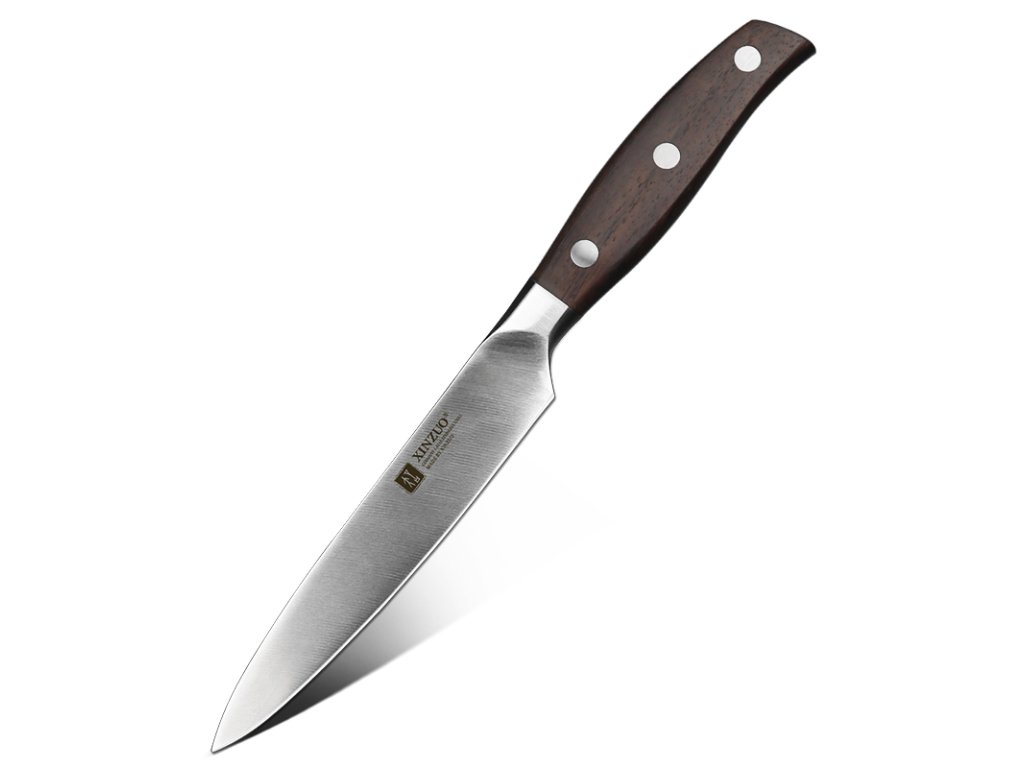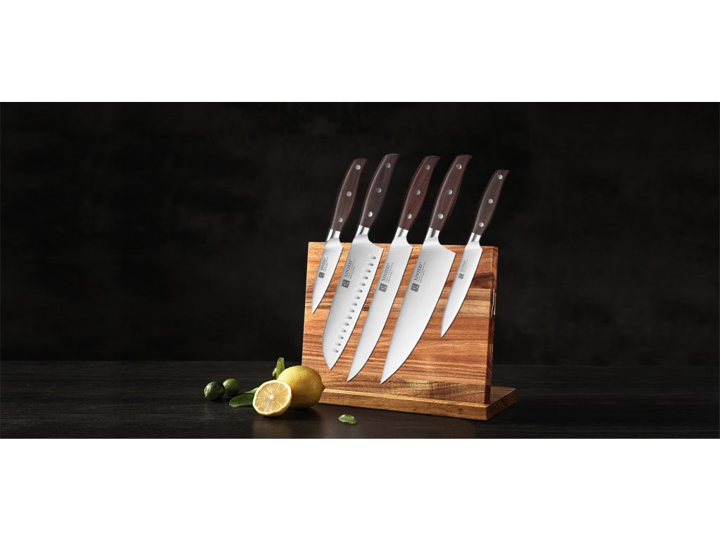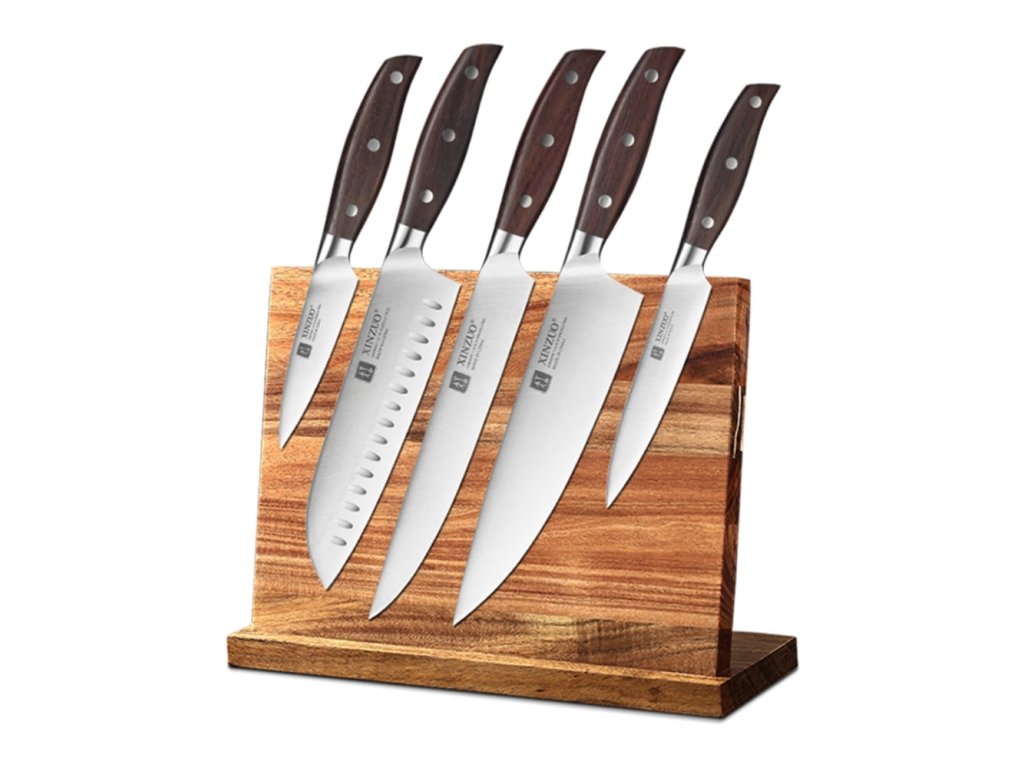 Messerset mit 5 XinZuo Zhi B35 Messern aus hochwertigem deutschem Stahl mit Sandelholzgriff und handgeschliffener Klinge mit perfekter Schärfe, im Set mit einem Magnet-Messerblock.