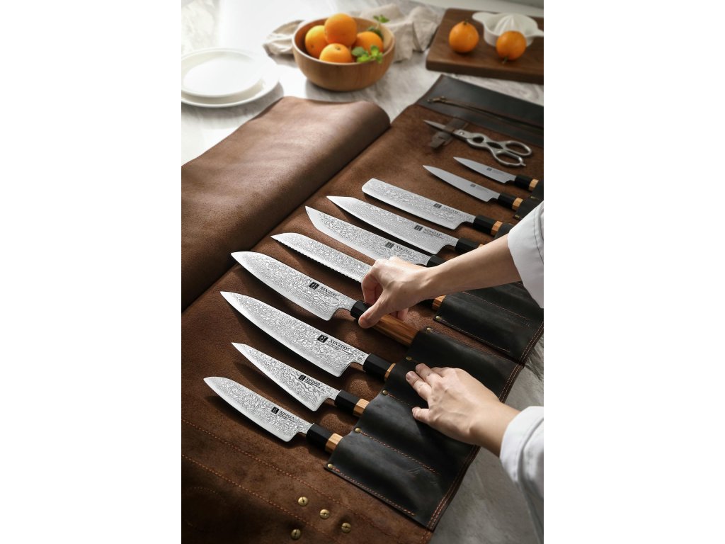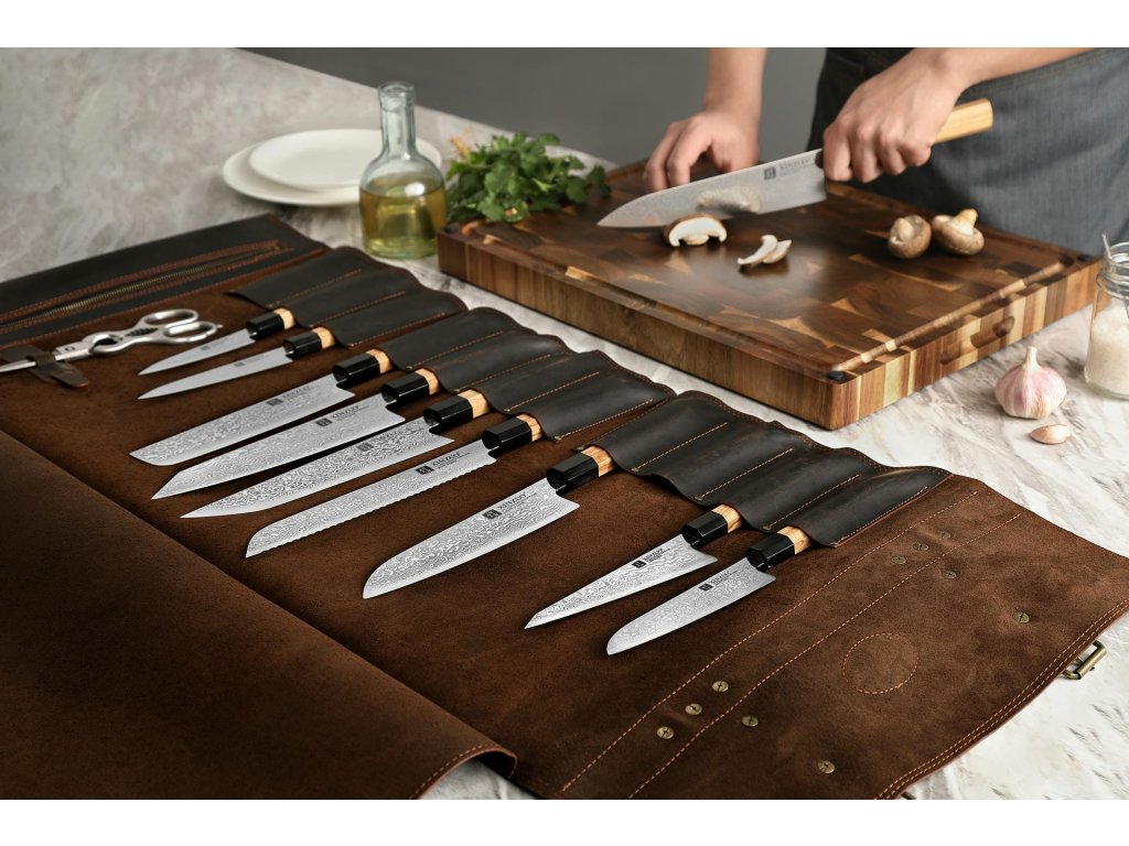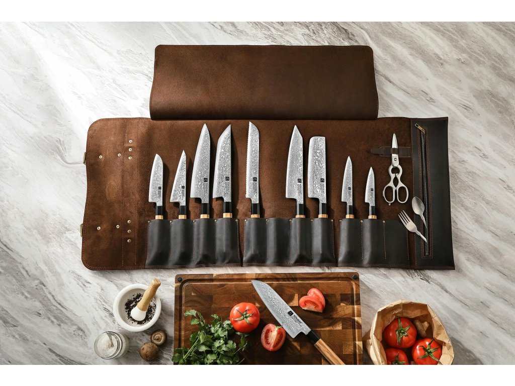Elegante Messertasche von XinZuo aus echtem Leder in schwarzer Ausführung mit 11 Fächern für Küchenmesser, 1 Fach für Zubehör und 1 Reißverschlussfach. Geeignet für professionelle und Hobby-Köche. Mit dieser Tasche sind Ihre Messerklingen sicher und ordentlich verwahrt, ohne dass sie ihre Schärfe verlieren. Diese Tasche wurde in der chinesischen Messerstadt Yangjiang aus hochwertigem Echtleder nach der Methode "Crazy Horse" gefertigt. Sie ist aus echtem Leder, also perfekt zur stilvollen Aufbewahrung von Premium-Messern von XinZuo aus deutschem und Damast Stahl. Das stilvolle Design macht sie zu einem echten Hingucker, ganz gleich, wohin Sie sie mitnehmen. Ein echter Blickfang bei einer Firmen-Party (bei Kundenevents), einer Familienfeier oder einem Grillfest mit Freunden.