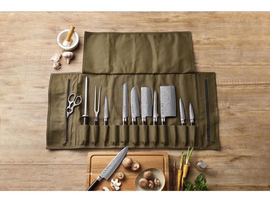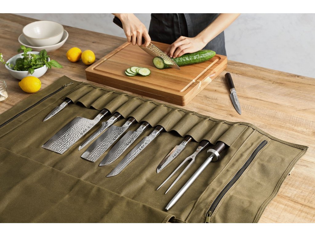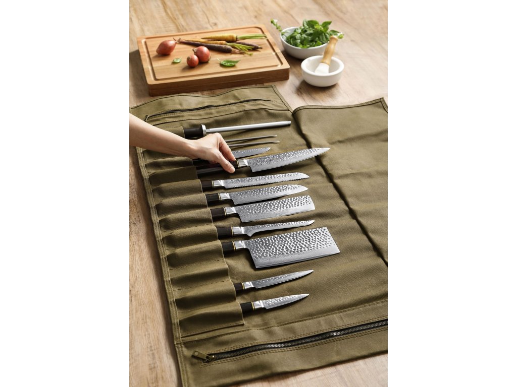 Elegante, grüne Messertasche mit zwölf Fächern für Messer und XinZuo-Zubehör. Geeignet für professionelle und Hobby-Köche.