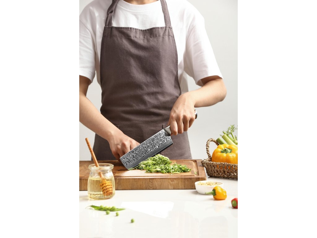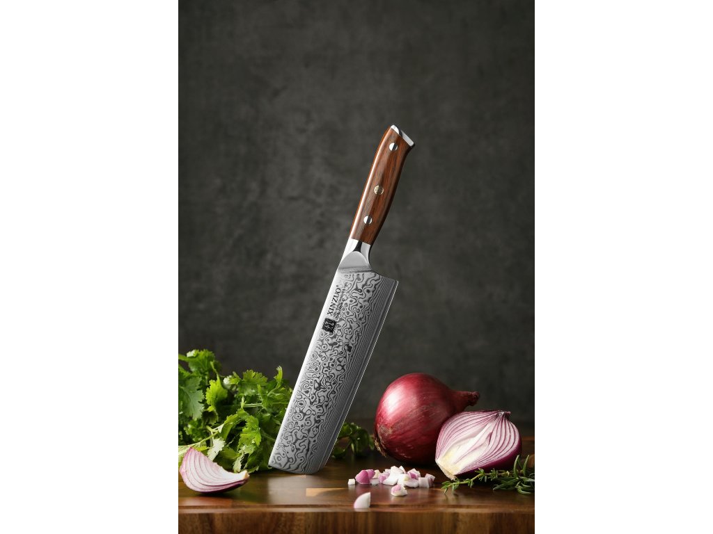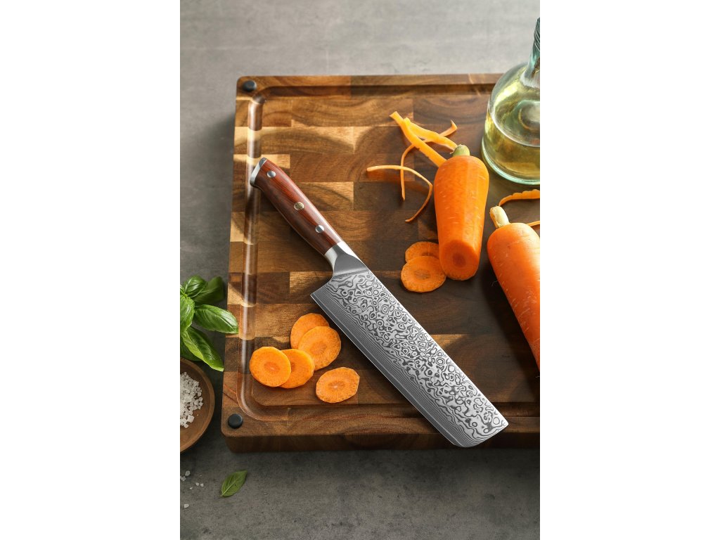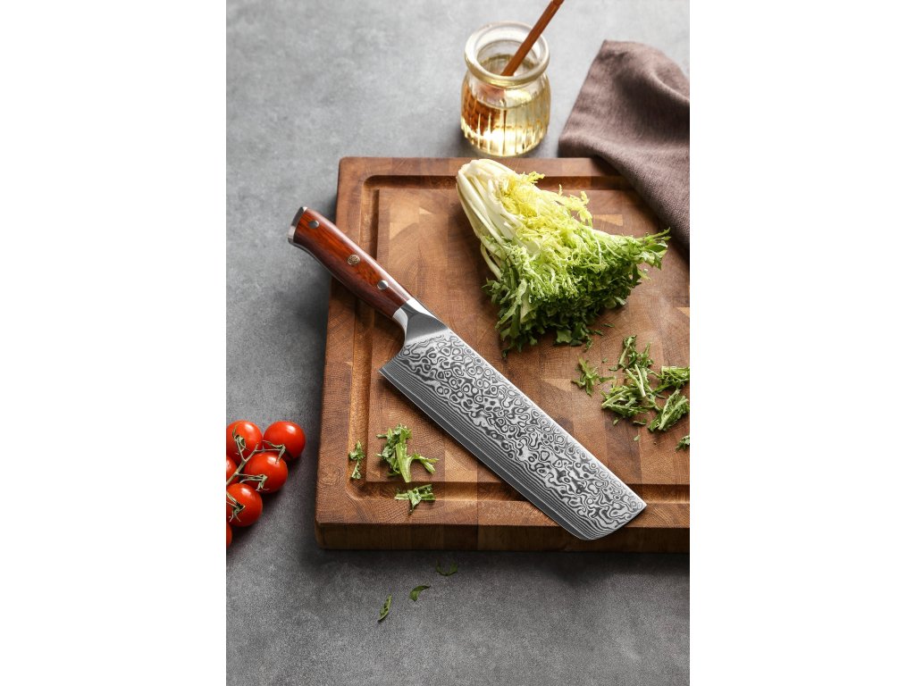 Dieses Nakiri Messer ist aus hochwertigem Damaszener Stahl gefertigt, der für die Herstellung der besten Messer verwendet wird. Die Messerklinge mit einer Härte von 60±2 Rockwell besteht aus 67 Lagen. Hochwertiger Stahl in einer Kombination von traditioneller Herstellung garantiert eine lange Lebensdauer des Messers. Die Oberfläche des Messers bietet beim Schneiden Komfort, ohne dass es reibt oder dass die Zutaten an die Klinge pappen. Der Griff des Messers ist aus Palisanderholz gefertigt, das mit der Zeit weder weicher wird noch einen Geruch annimmt. Dank seiner perfekten Form und Länge wird das Schneiden zum Vergnügen und außerdem liegt das Messer gut in der Hand. Aufgrund des natürlichen Griff-Designs kann die Farbe und das Design leicht von den Produktbildern abweichen, da der Griff aus einem anderen Holzstück gefertigt wurde oder da das Alter des Holzes unterschiedlich ist. Der Farbton des Musters auf der Klinge kann unterschiedlich sein, da jedes Messer durch das Stahlschichten einzigartig ist.