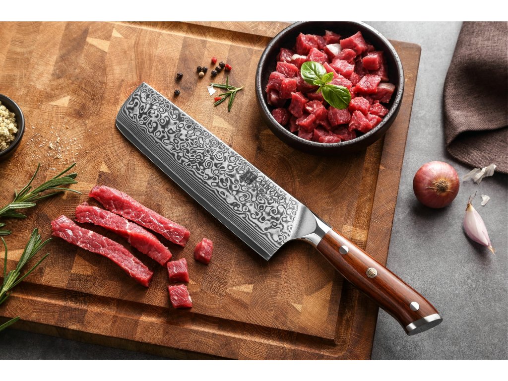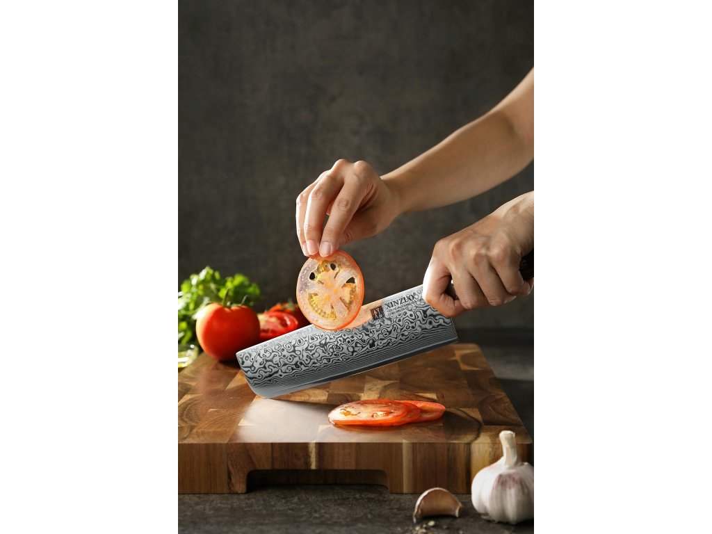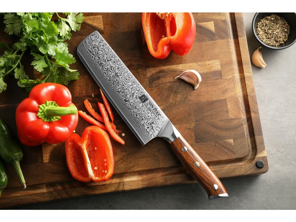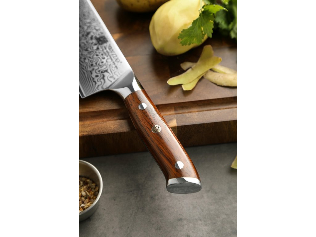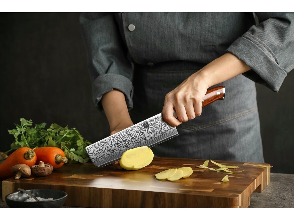 Dieses Nakiri Messer ist aus hochwertigem Damaszener Stahl gefertigt, der für die Herstellung der besten Messer verwendet wird. Die Messerklinge mit einer Härte von 60±2 Rockwell besteht aus 67 Lagen. Hochwertiger Stahl in einer Kombination von traditioneller Herstellung garantiert eine lange Lebensdauer des Messers. Die Oberfläche des Messers bietet beim Schneiden Komfort, ohne dass es reibt oder dass die Zutaten an die Klinge pappen. Der Griff des Messers ist aus Palisanderholz gefertigt, das mit der Zeit weder weicher wird noch einen Geruch annimmt. Dank seiner perfekten Form und Länge wird das Schneiden zum Vergnügen und außerdem liegt das Messer gut in der Hand. Aufgrund des natürlichen Griff-Designs kann die Farbe und das Design leicht von den Produktbildern abweichen, da der Griff aus einem anderen Holzstück gefertigt wurde oder da das Alter des Holzes unterschiedlich ist. Der Farbton des Musters auf der Klinge kann unterschiedlich sein, da jedes Messer durch das Stahlschichten einzigartig ist.