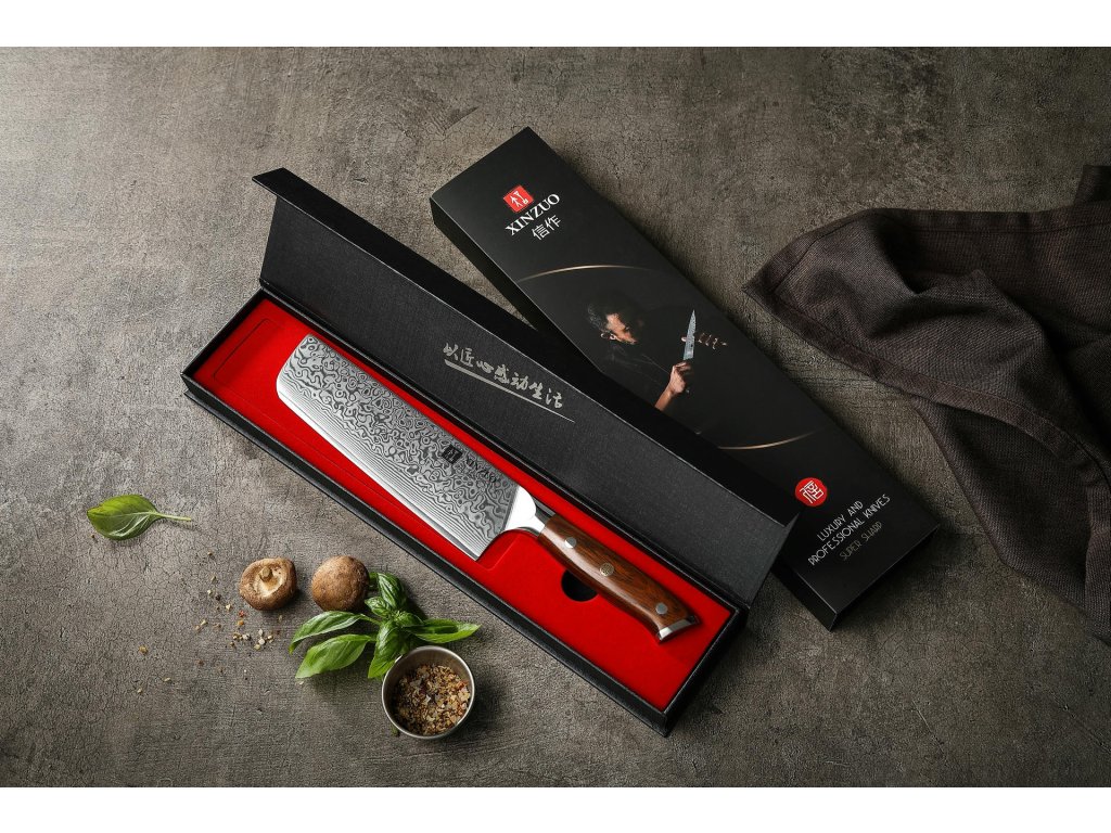 Das Nakiri-Messer XinZuo Yu B13R ist in einer luxuriösen Geschenkbox verpackt und eignet sich somit als ein ideales praktisches Geschenk. Das luxuriöse Design der Geschenkbox und das hochwertige XinZuo Messer im Set wird jeden Beschenkten Freude machen.