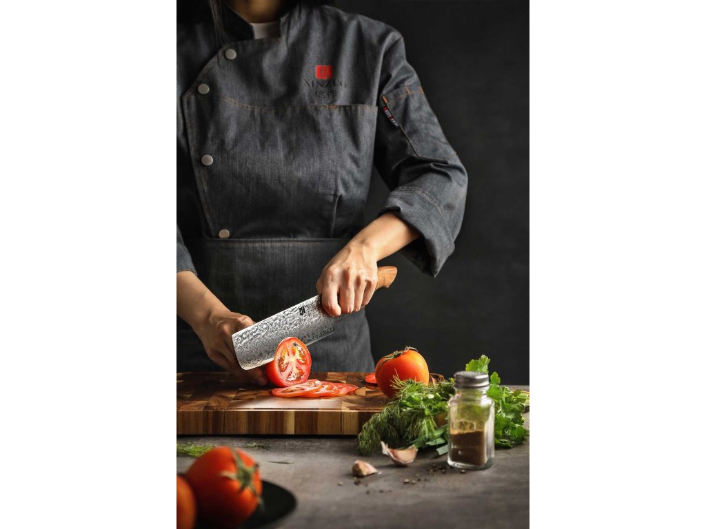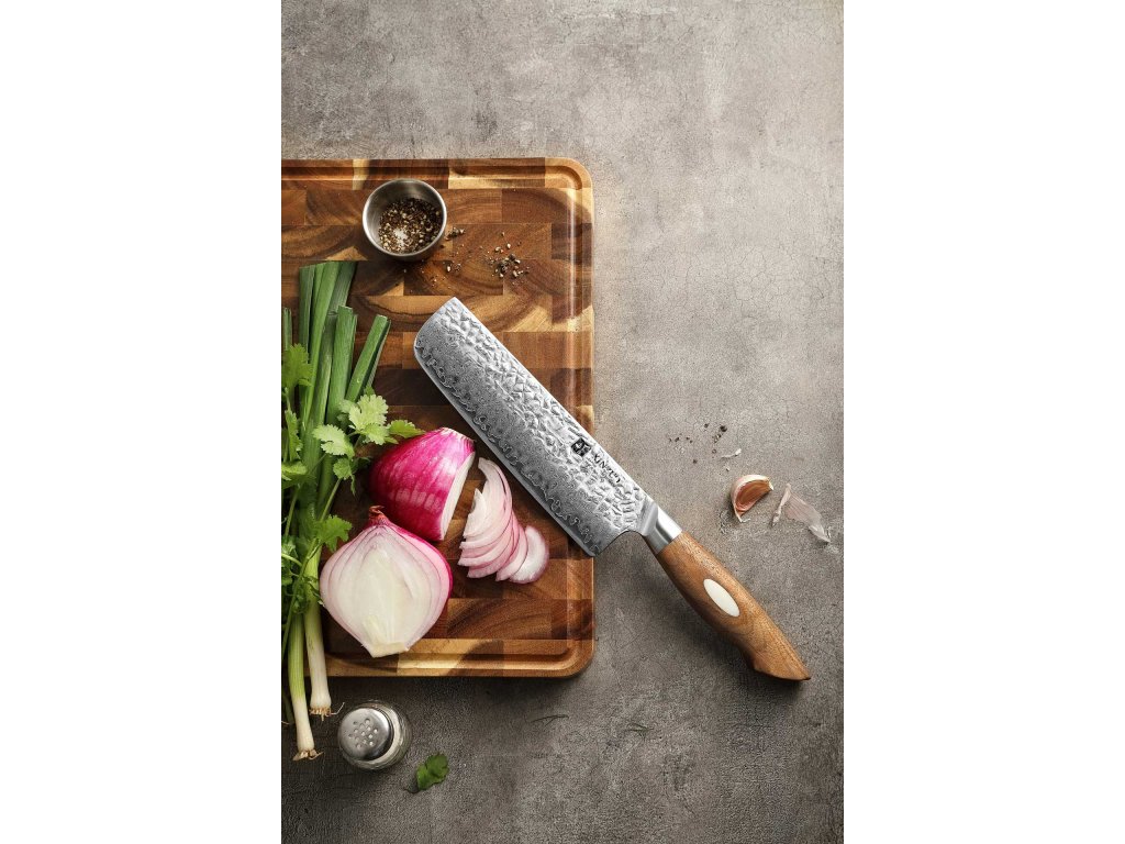 Dieses Nakiri-Messer ist aus hochwertigem AUS10-Damaststahl gefertigt, der von der renommierten Firma Aichi Steel in Japan hergestellt wird. Dieser innovative japanische Stahl zeichnet sich durch seine hohe Schärfe und Haltbarkeit aus. Er hat einen hohen Gehalt von Kohlenstoff (1,10 %) und Chrom (14,50 %), dank dessen er korrosionsbeständig ist. Die Klinge des Messers mit einer Härte von 60±2 Rockwell besteht aus 67 Lagen und wurde einer kryogenen Vakuumbehandlung unterzogen. Der Korrosionsschutz wird durch den äußeren Edelstahl SUS430 gewährleistet, in den der Kern des Messers (aus AUS-10) eingebettet ist. Der Farbton des Musters auf der Klinge kann unterschiedlich sein, da jedes Messer durch das Stahlschichten einzigartig ist.