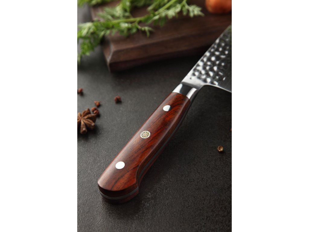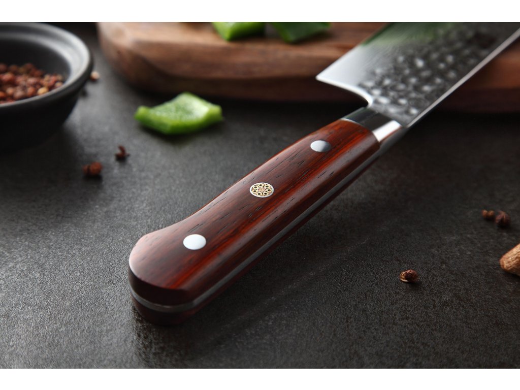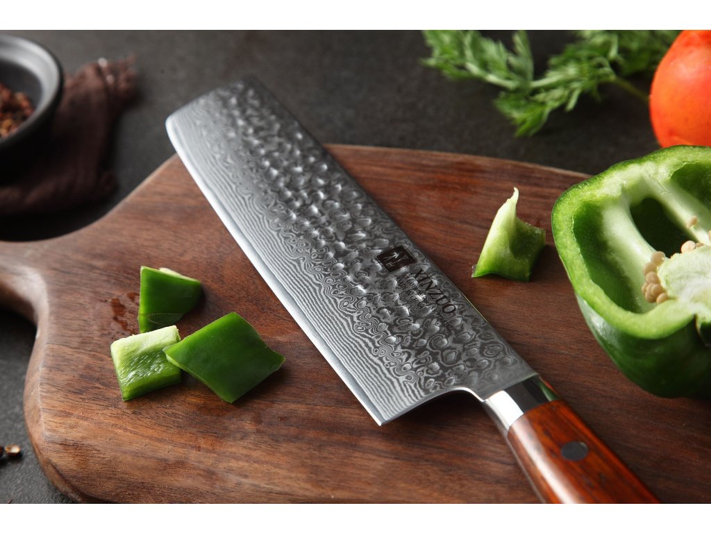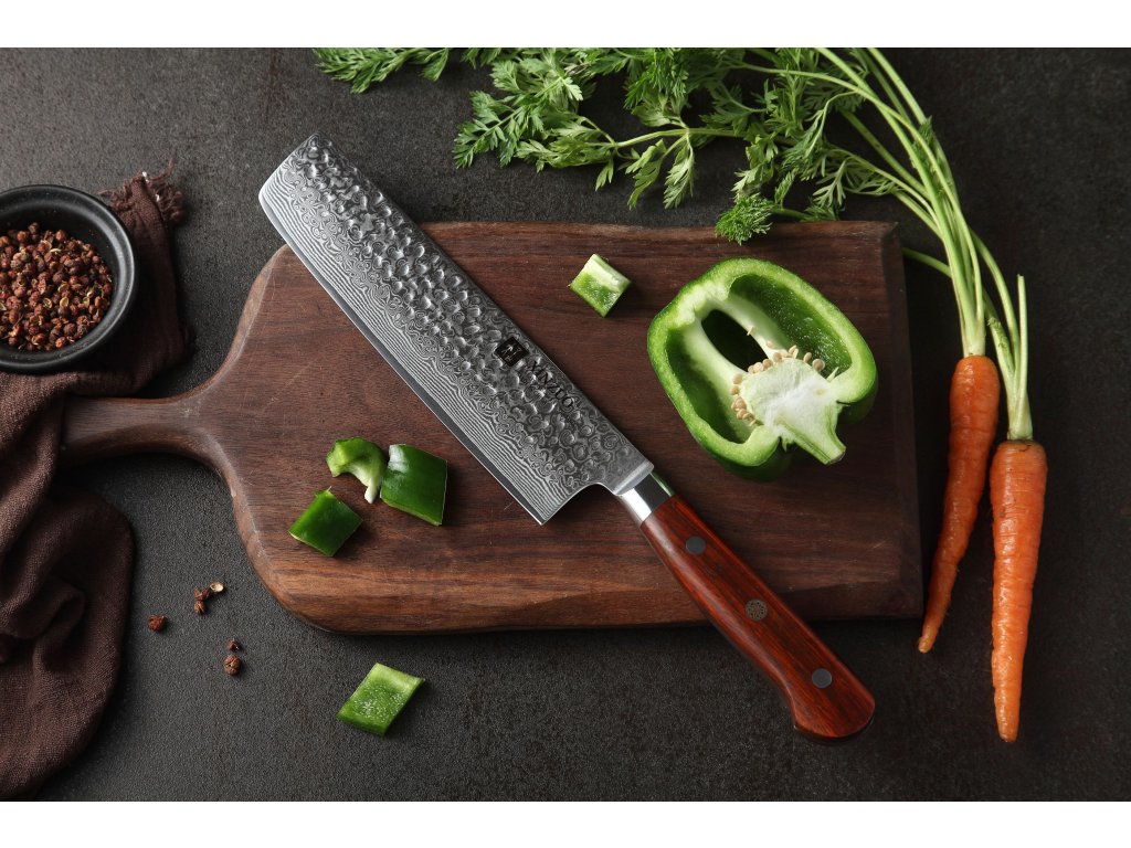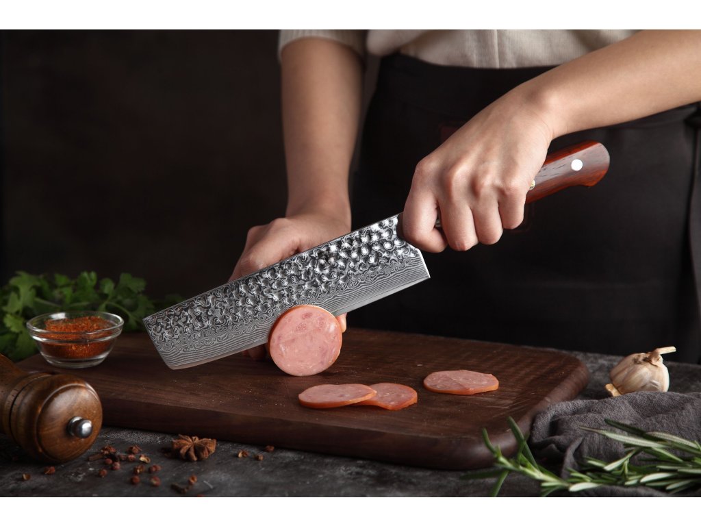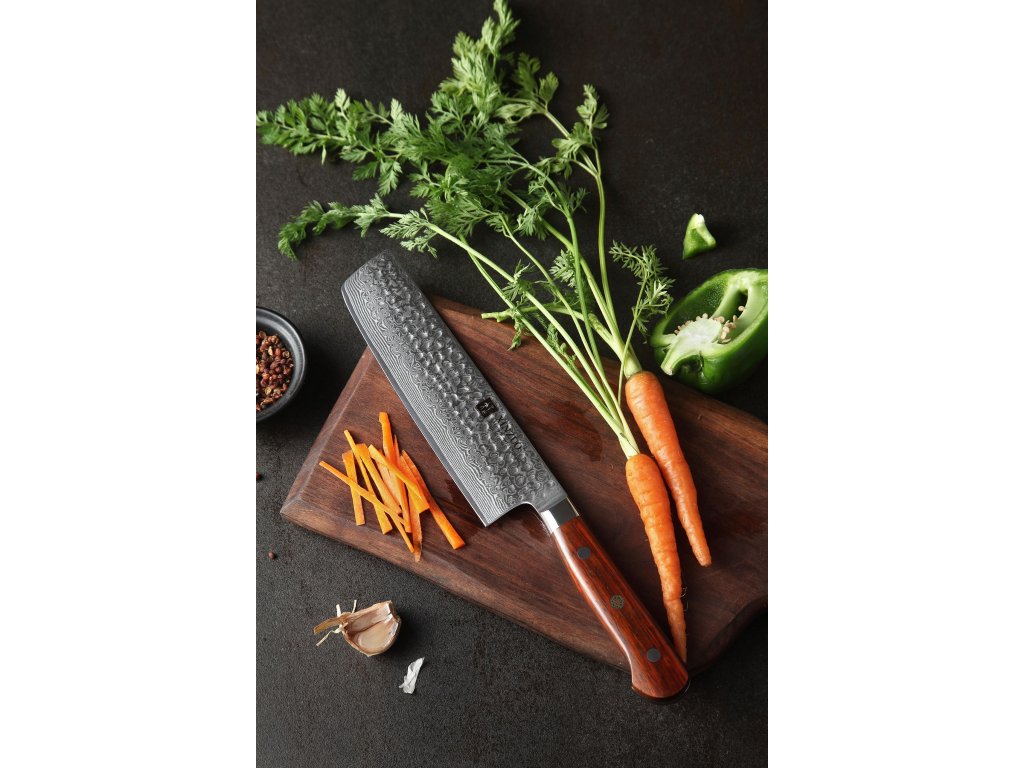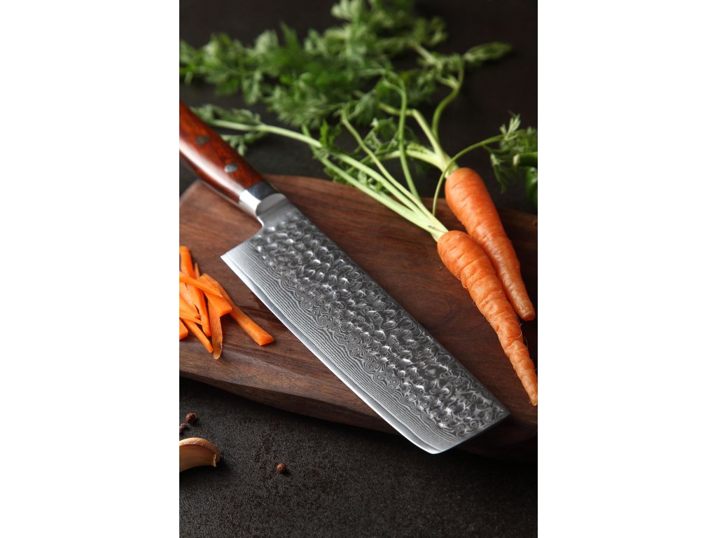 Dieses Nakiri-Messer ist aus hochwertigem Damaszener Stahl gefertigt, der für die Herstellung der besten Messer verwendet wird. Die Messerklinge mit einer Härte von 60±2 Rockwell besteht aus 67 Lagen. Hochwertiger Stahl in einer Kombination von traditioneller Herstellung garantiert eine lange Lebensdauer des Messers. Die Oberfläche des Messers bietet beim Schneiden Komfort, ohne dass es reibt oder dass die Zutaten an die Klinge pappen. Der Messergriff besteht aus Palisanderholz, das mit der Zeit weder weicher wird noch Geruch annimmt. Dank seiner perfekten Form und Länge wird das Schneiden zum Vergnügen und außerdem liegt das Messer gut in der Hand. Aufgrund des natürlichen Griff-Designs kann die Farbe und das Design leicht von den Produktbildern abweichen, da der Griff aus einem anderen Holzstück gefertigt wurde oder da das Alter des Holzes unterschiedlich ist. Der Farbton des Musters auf der Klinge kann unterschiedlich sein, da jedes Messer durch das Stahlschichten einzigartig ist.