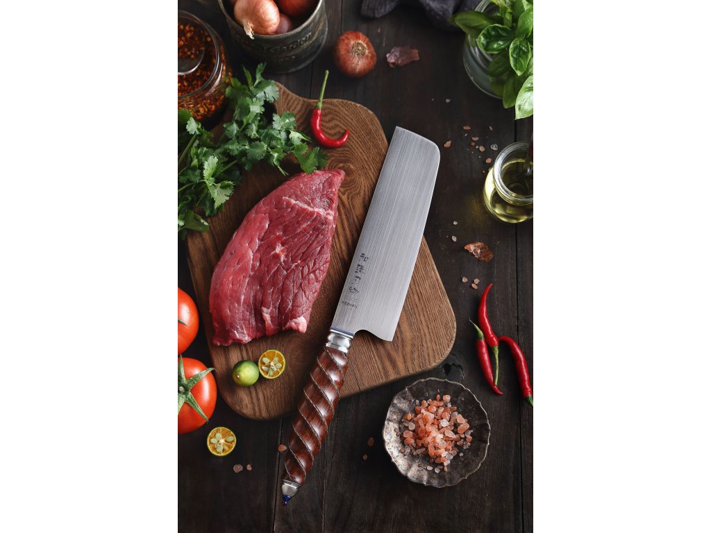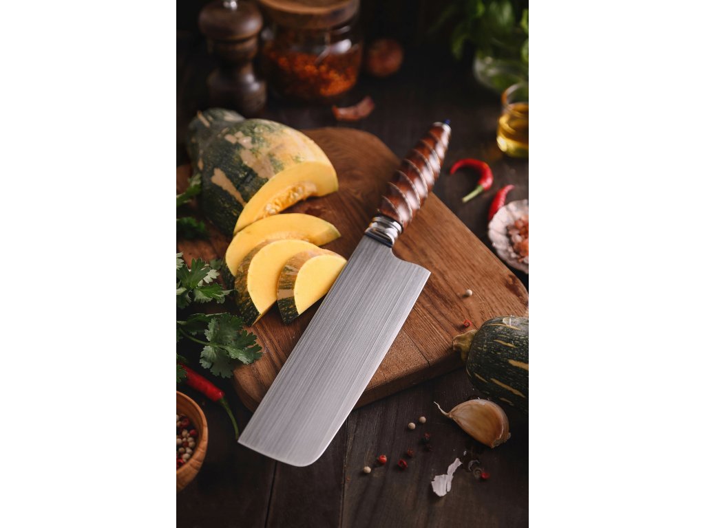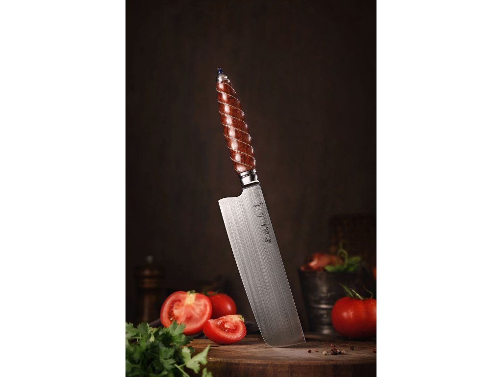 Nakiri Messer HEZHEN F4 mit 19-cm-Klinge aus hochwertigem, pulverbeschichtetem Stahl des österreichischen Herstellers BÖHLER mit einzigartigem Dreh-Design und Premium-Holzgriff.