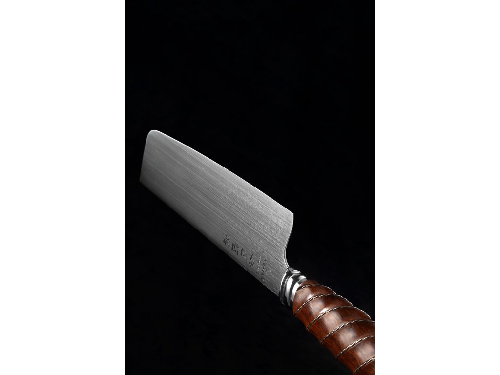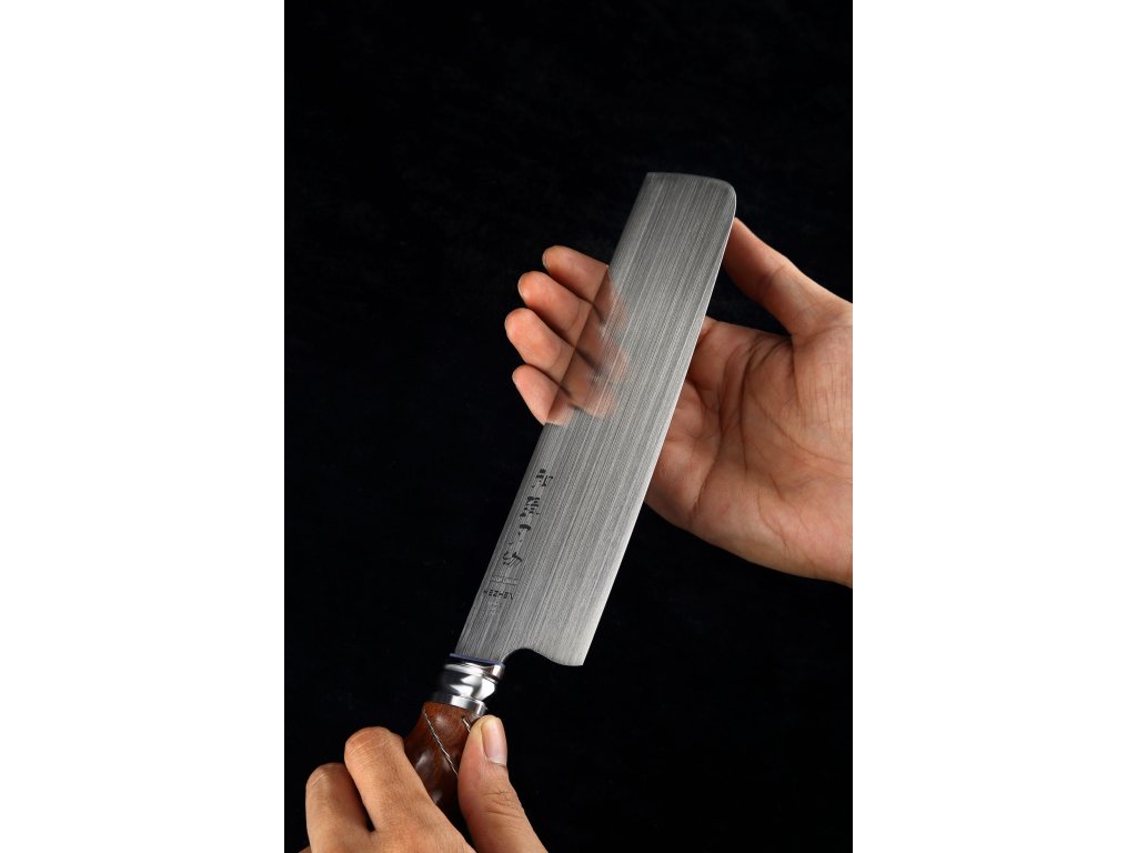 Die Oberfläche der Klinge ist korrosionsbeständig und fein bearbeitet, um ihre hohe Haltbarkeit und leichte Reparierbarkeit zu gewährleisten. Die Klinge wird von Messerschmieden in Yangjiang nach japanischer Art in einem Winkel von 15° auf beiden Seiten von Hand geschliffen. Der hochwertige Stahl sowie eine Kombination aus traditionellen und modernen Fertigungstechniken sorgen für eine lange Lebensdauer des Messers. Die Oberfläche des Messers bietet beim Schneiden Komfort, ohne dass es reibt oder dass die Zutaten an die Klinge pappen.