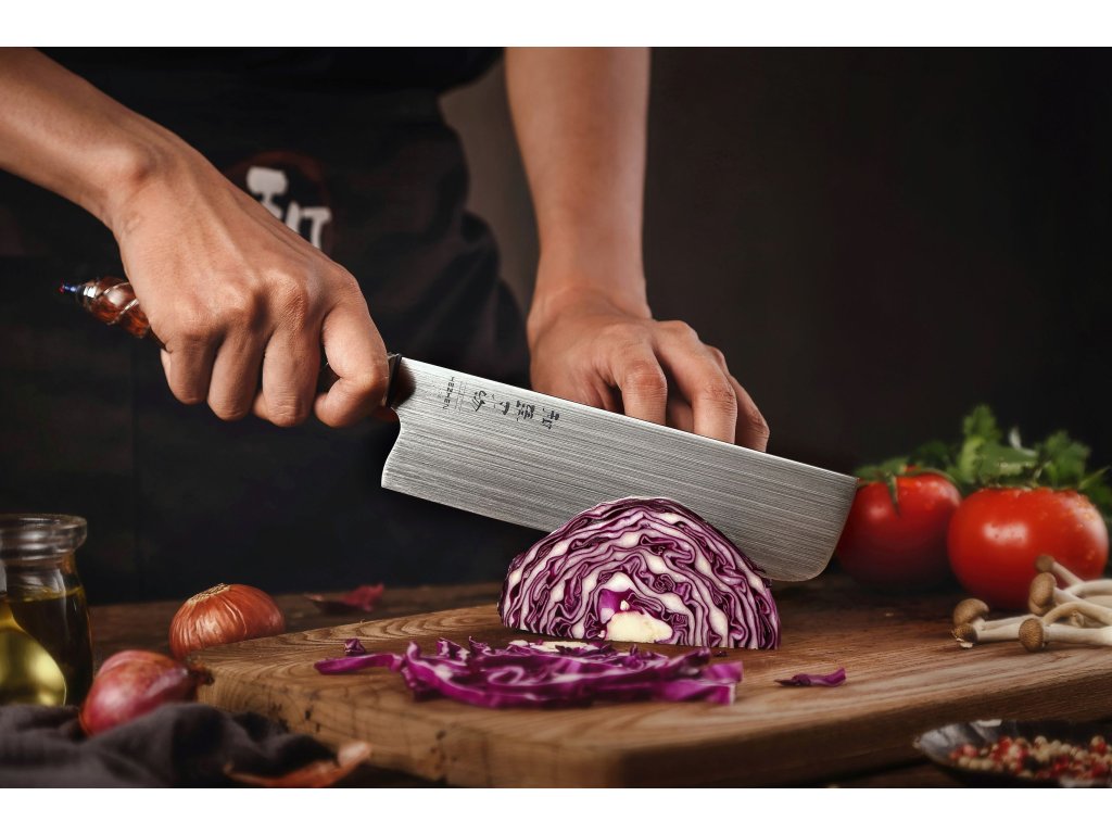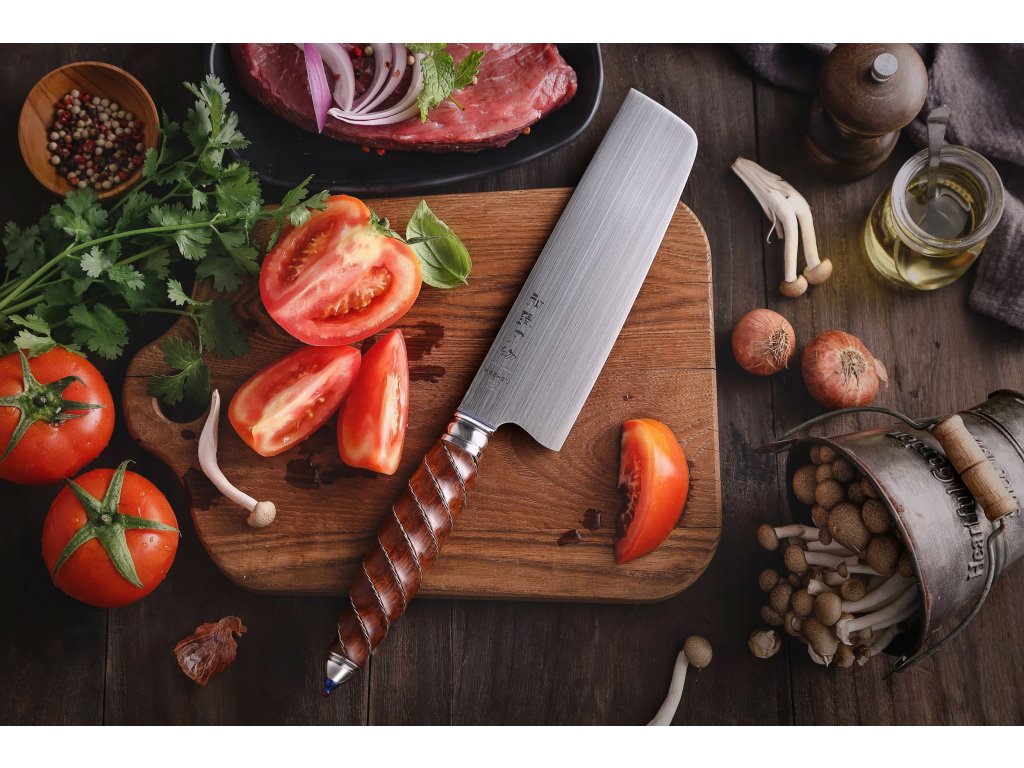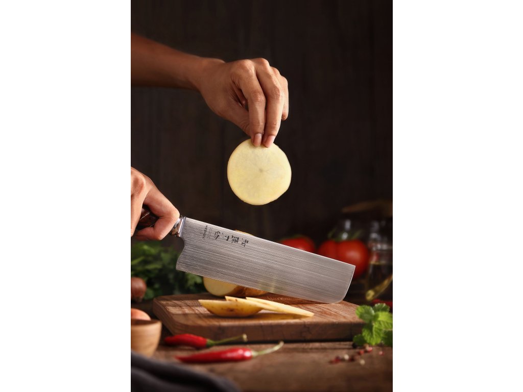 Nakiri Messer - Gemüse-Schneiden wie ein Profi. Das Nakiri ist ein traditionelles japanisches Messer, das speziell für das präzise und effiziente Schneiden von Gemüse entworfen wurde. Die einzigartige Klingenform ermöglicht eine sanfte Wiegebewegung, mit der sich selbst hartes Wurzelgemüse mühelos zerkleinern lässt. Mit seiner perfekt scharfen Klinge schneidet es Gemüse in hauchdünne Scheiben oder feine Streifen – genau so, wie man es aus asiatischen Restaurants kennt. Mit der breiten Klinge lassen sich die zerkleinerten Zutaten außerdem leicht direkt in den Topf oder die Pfanne schieben. Es ist eine gute Wahl für alle, die gerne präzise schneiden und die Zubereitung von Gemüse wie ein Profikoch genießen möchten.