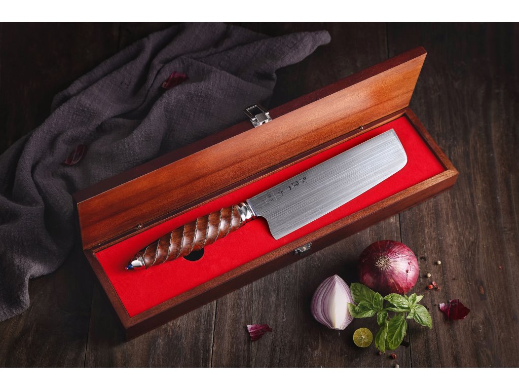 Das Nakiri Messer HEZHEN F4 ist in einer luxuriösen Holzbox verpackt, die seine Einzigartigkeit unterstreicht. Dank der Geschenkbox gilt es nicht nur als ein ideales praktisches Geschenk nicht nur für den Haushalt zu verschiedensten Anlässen, sondern auch als praktisches luxuriöses Geschenk für Geschäftspartner. Das luxuriöse Design der Holzbox und das hochwertige Messer wird jedem Beschenkten Freude machen.