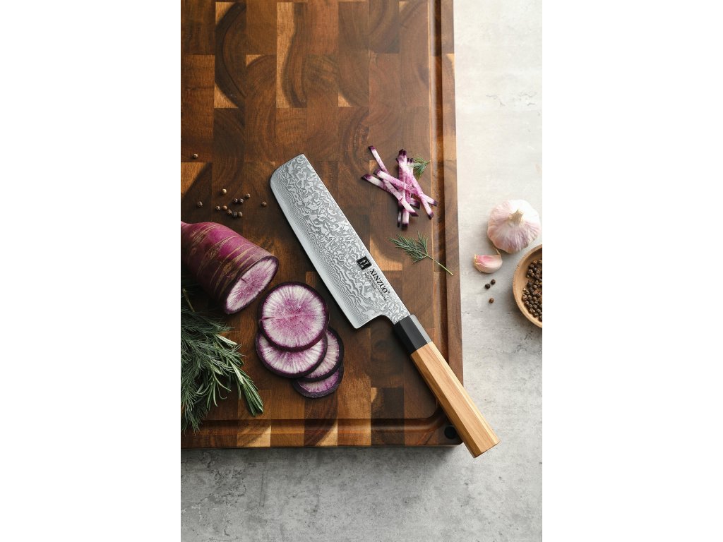 Der Messergriff ist im Geiste der traditionellen japanischen Achteckgriffe gestaltet, deren Form sich seit Jahrhunderten bewährt hat. Acht Kanten am Griff sorgen für einen festen und zuverlässigen Halt auch mit nassen Händen. Gleichzeitig müssen Sie nicht befürchten, dass der Griff beim Schneiden in der Hand verrutscht.