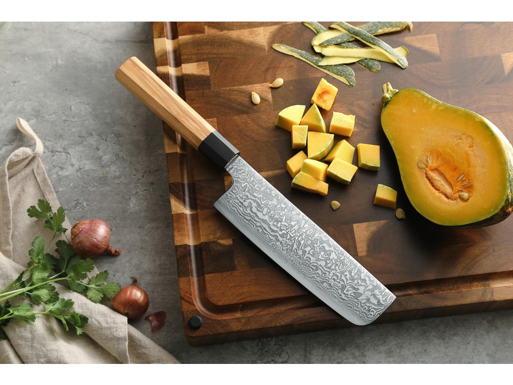 Dieses Nakiri-Messer ist aus hochwertigem Damaszener Stahl gefertigt, der für die Herstellung der besten Messer verwendet wird. Die Messerklinge mit einer Härte von 60±2 Rockwell besteht aus 67 Lagen. Hochwertiger Stahl in einer Kombination von traditioneller Herstellung garantiert eine lange Lebensdauer des Messers. Die Oberfläche des Messers bietet beim Schneiden Komfort, ohne dass es reibt oder dass die Zutaten an die Klinge pappen. Der Farbton des Musters auf der Klinge kann unterschiedlich sein, da jedes Messer durch das Stahlschichten einzigartig ist.