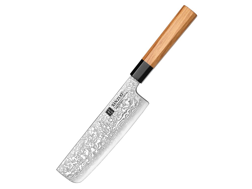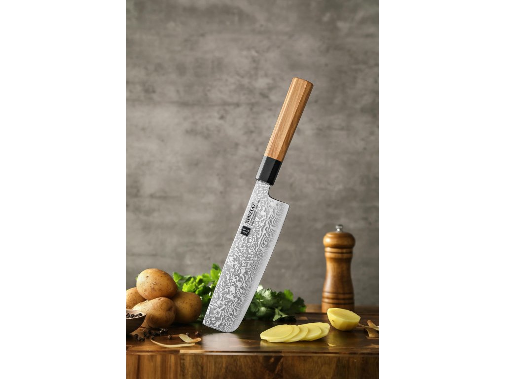 Elegantes Nakiri Messer XinZuo Zhen PM8O 18 cm mit Klinge aus Damaszener Stahl und achteckigem Griff aus Olivenholz und Büffelhorn im japanischen Stil.