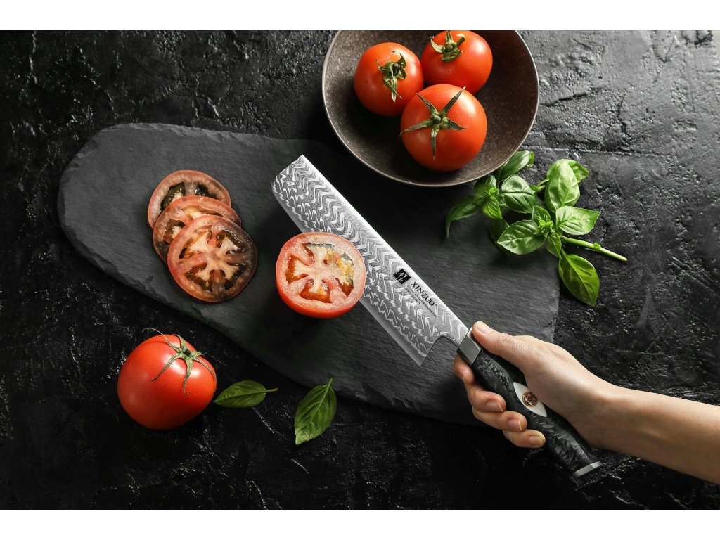 Merkwürdigkeit: Als ein führender Innovator in der Herstellung von Küchenmessern kombiniert XinZuo traditionelle und modernste Fertigungstechniken. Dank der hochmodernen Vakuum-Wärmebehandlungsmethode haben XinZuo Küchenmesser eine höhere Härte und Schärfe sowie eine längere Lebensdauer als Messer, die nur durch herkömmliche Wärmebehandlung hergestellt werden. Gepaart mit dem traditionellen letzten Schleifen der Messer von Hand durch Messermachermeister, deren über Generationen weitergegebenes Können von keiner Maschine übertroffen wird, haben XinZuo Küchenmesser eine erstklassige Schärfe, die maschinell geschliffene Messer nie erreichen können.