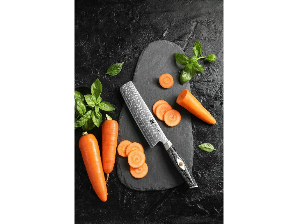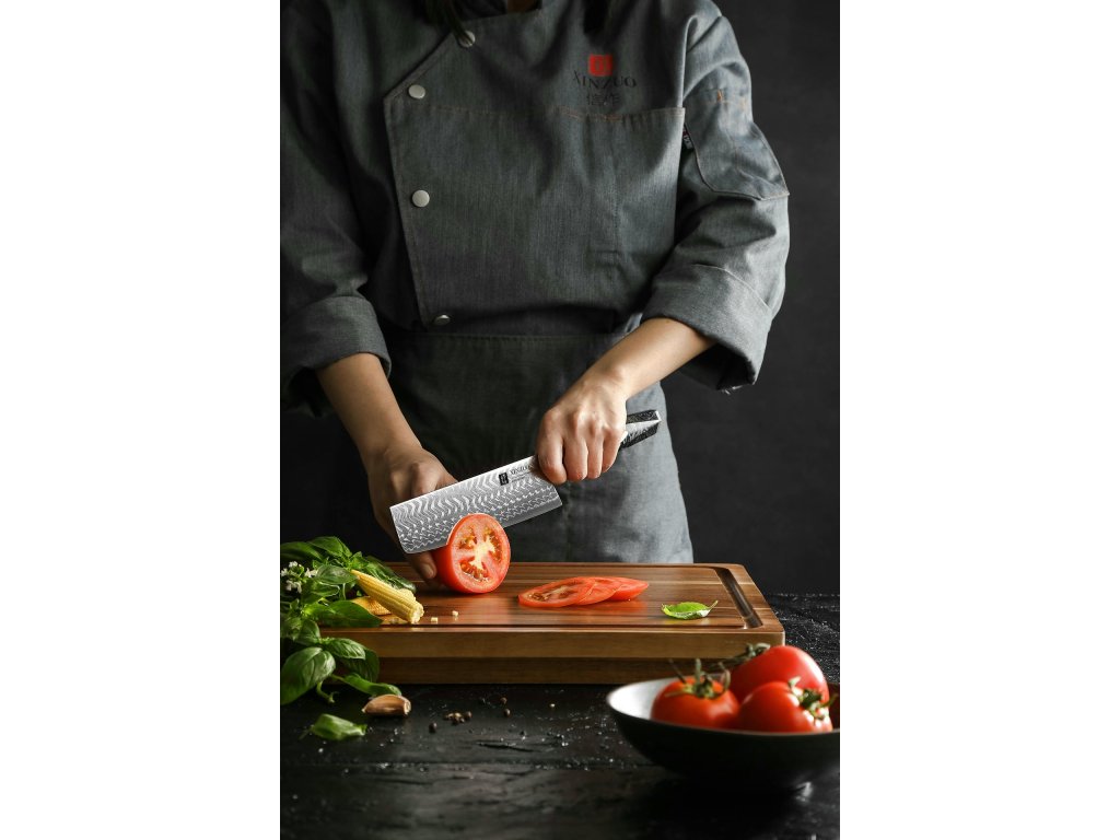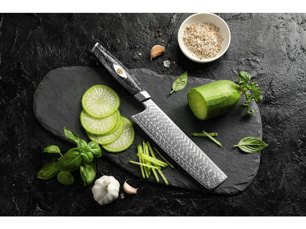 Nakiri Messer - Gemüse-Schneiden wie ein Profi. Das Nakiri ist ein traditionelles japanisches Messer, das speziell für das präzise und effiziente Schneiden von Gemüse entworfen wurde. Die einzigartige Klingenform ermöglicht eine sanfte Wiegebewegung, mit der sich selbst hartes Wurzelgemüse mühelos zerkleinern lässt. Mit seiner perfekt scharfen Klinge schneidet es Gemüse in hauchdünne Scheiben oder feine Streifen – genau so, wie man es aus asiatischen Restaurants kennt. Mit der breiten Klinge lassen sich die zerkleinerten Zutaten außerdem leicht direkt in den Topf oder die Pfanne schieben. Es ist eine gute Wahl für alle, die gerne präzise schneiden und die Zubereitung von Gemüse wie ein Profikoch genießen möchten.