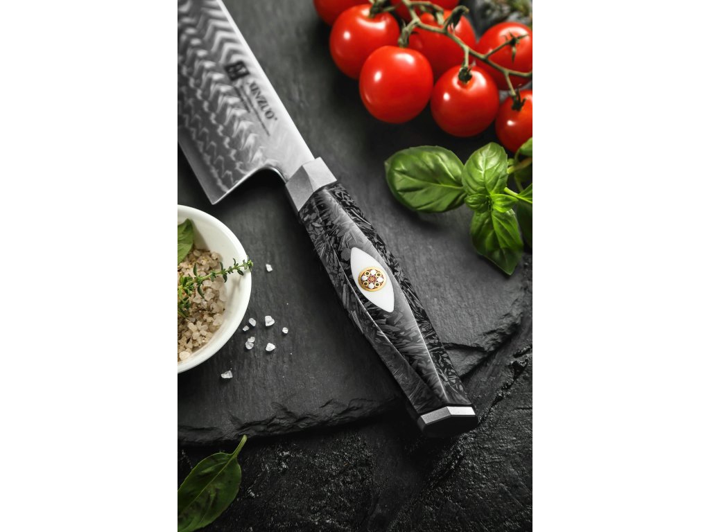 Der Messergriff wird aus einer edlen Kombination von Karbonfasern und Harz gefertigt – für maximale Widerstandskraft gegen äußere Einflüsse wie Feuchtigkeit und die damit verbundene Rissbildung. Dennoch ist er außergewöhnlich leicht und liegt dank seiner ergonomischen Form perfekt in der Hand. Der Carbon-Look des Griffs wird durch elegante Mosaikeinsätze ergänzt, die das moderne Design betonen und ihn zu einer idealen Wahl für zeitgenössische Küchen machen.