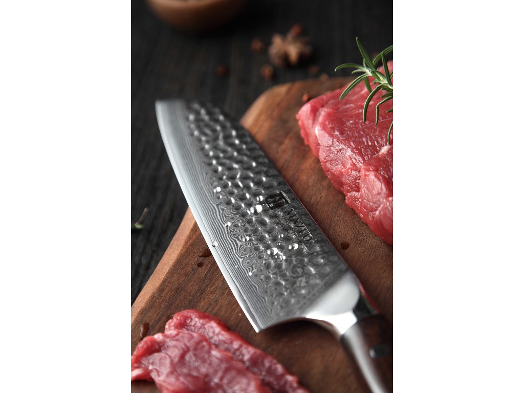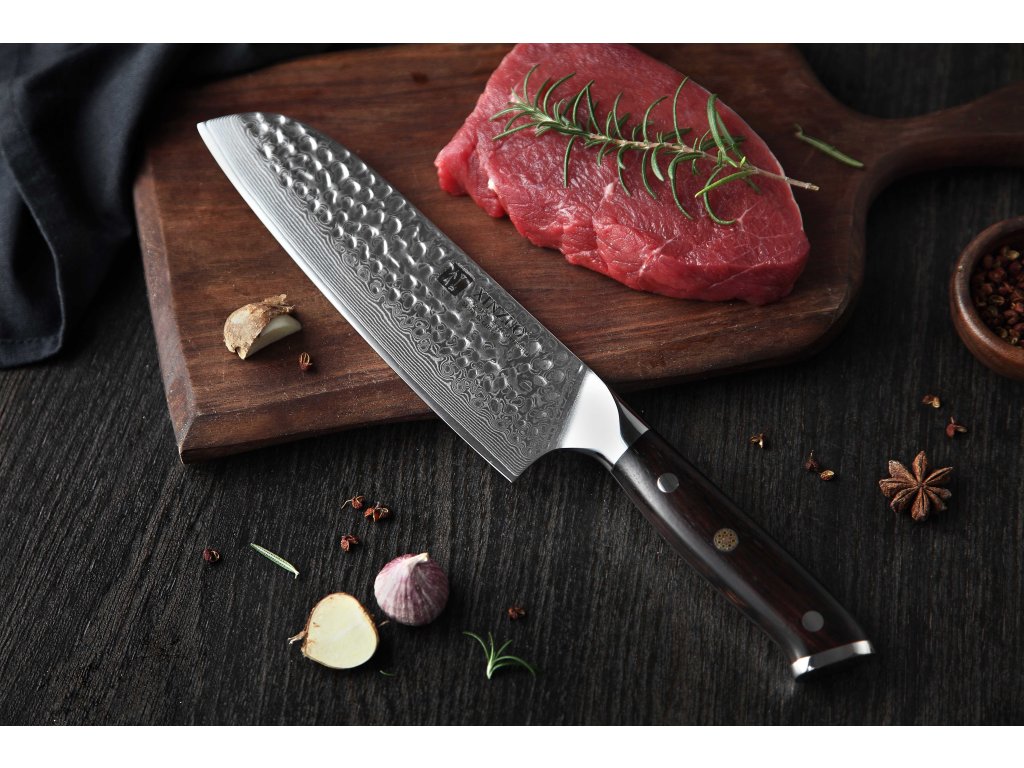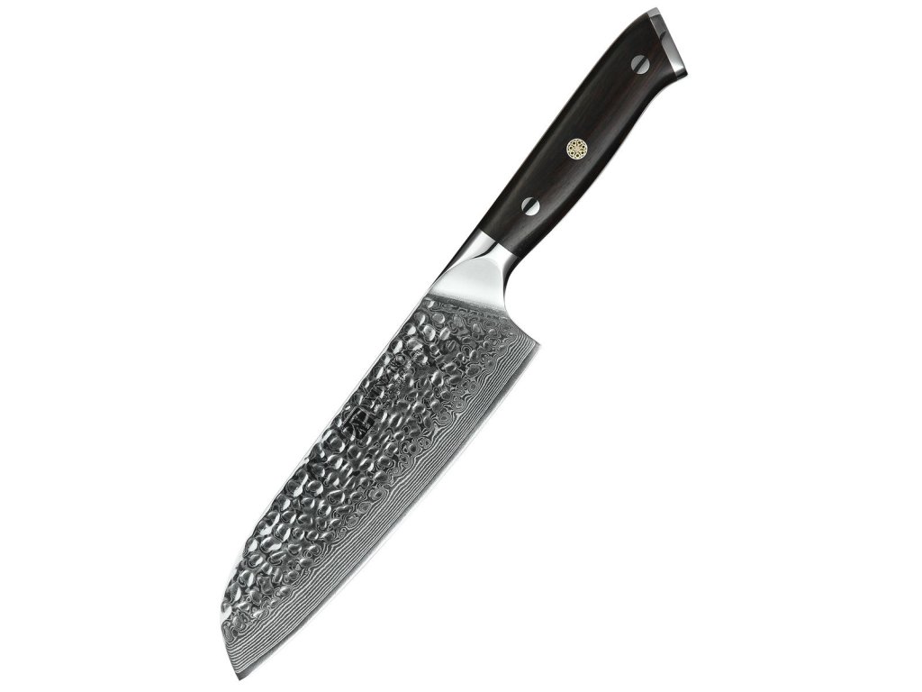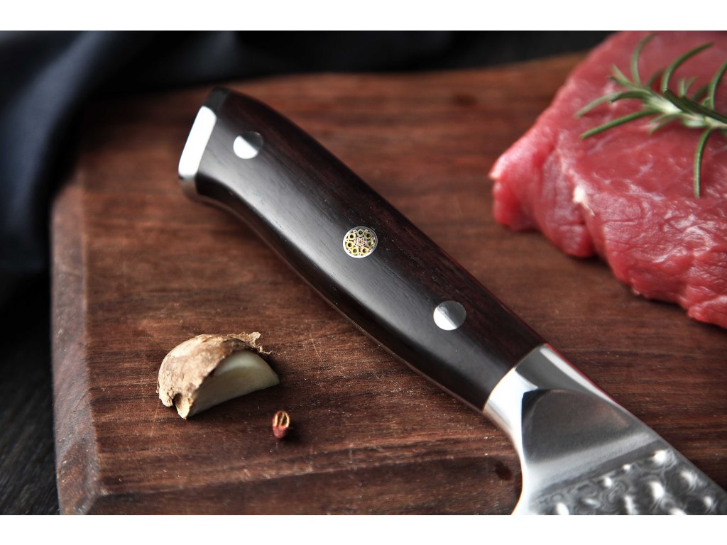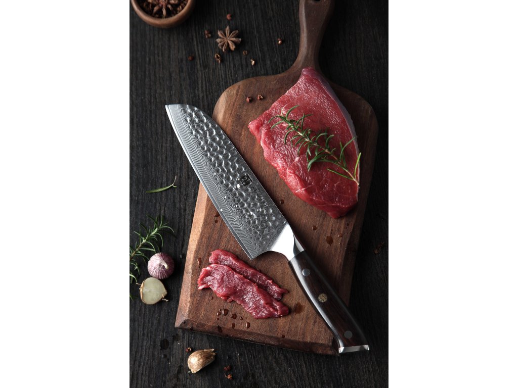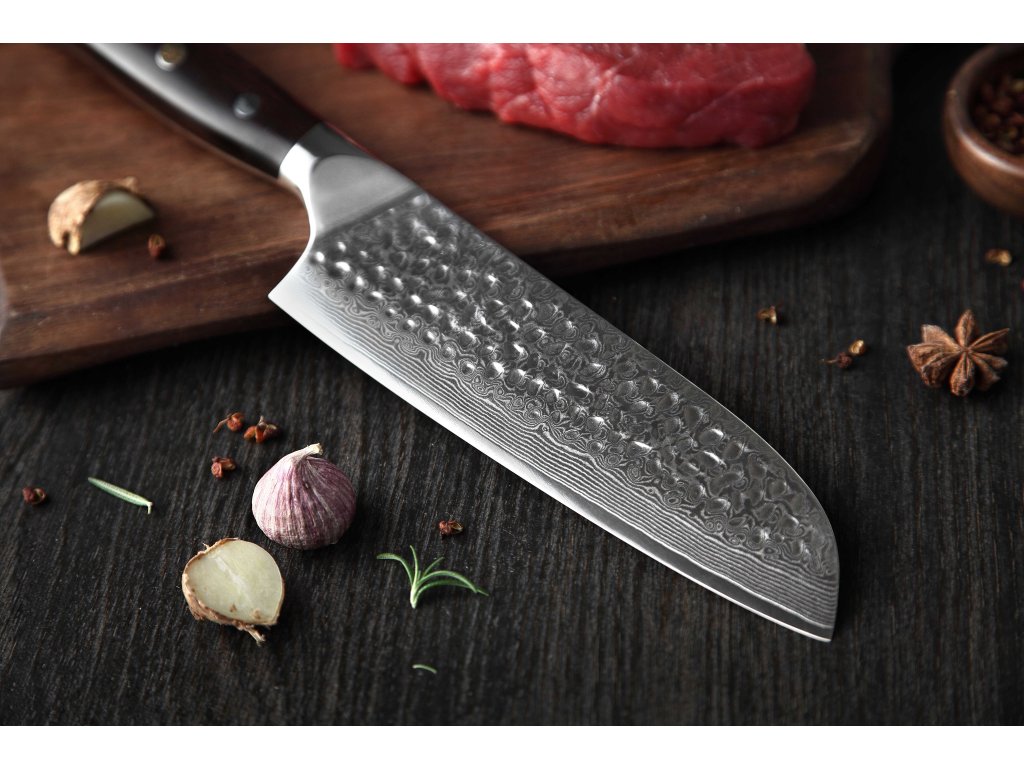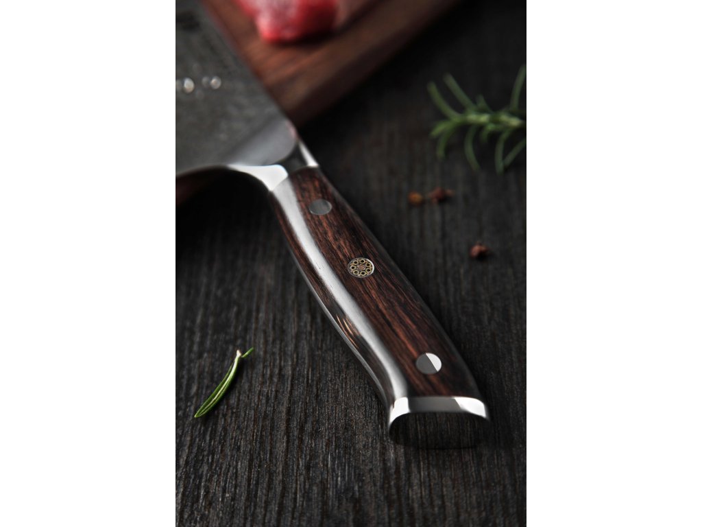 Dieses Santokumesser ist aus hochwertigem Damaszener Stahl gefertigt, der für die Herstellung der besten Messer verwendet wird. Die Messerklinge mit einer Härte von 60±2 Rockwell besteht aus 67 Lagen. Hochwertiger Stahl in einer Kombination von traditioneller Herstellung garantiert eine lange Lebensdauer des Messers. Die Oberfläche des Messers bietet beim Schneiden Komfort, ohne dass es reibt oder dass die Zutaten an die Klinge pappen. Der Griff des Messers ist aus Ebenholz gefertigt, das mit der Zeit weder weicher wird noch einen Geruch annimmt. Dank seiner perfekten Form und Länge wird das Schneiden zum Vergnügen und außerdem liegt das Messer gut in der Hand. Aufgrund des natürlichen Griff-Designs kann die Farbe und das Design leicht von den Produktbildern abweichen, da der Griff aus einem anderen Holzstück gefertigt wurde oder da das Alter des Holzes unterschiedlich ist. Der Farbton des Musters auf der Klinge kann unterschiedlich sein, da jedes Messer durch das Stahlschichten einzigartig ist.