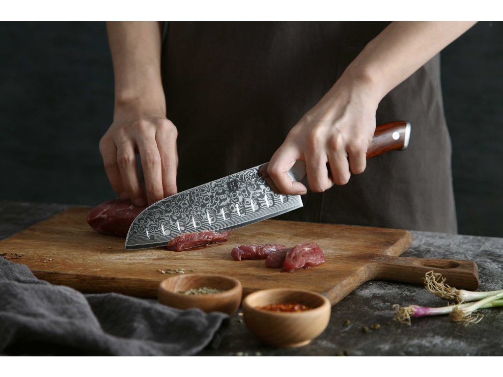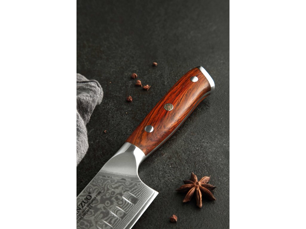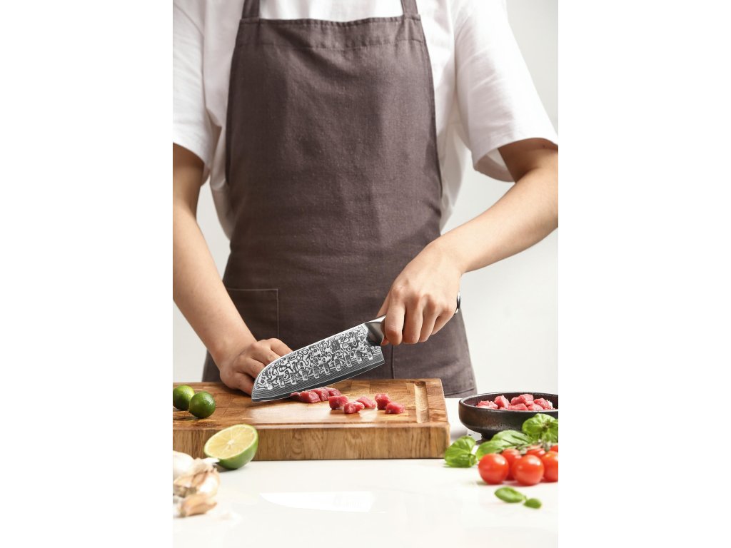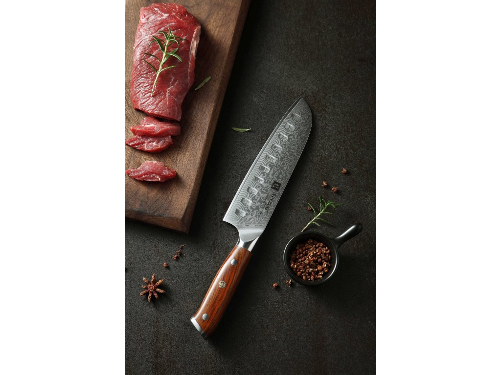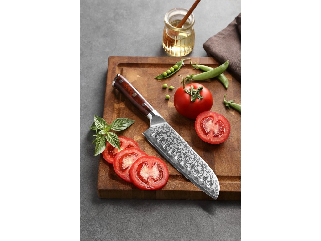 Dieses Santoku Messer ist aus hochwertigem Damaszener Stahl gefertigt, der für die Herstellung der besten Messer verwendet wird. Die Messerklinge mit einer Härte von 60±2 Rockwell besteht aus 67 Lagen. Hochwertiger Stahl in einer Kombination von traditioneller Herstellung garantiert eine lange Lebensdauer des Messers. Die Oberfläche des Messers bietet beim Schneiden Komfort, ohne dass es reibt oder dass die Zutaten an die Klinge pappen. Der Griff des Messers ist aus Palisanderholz gefertigt, das mit der Zeit weder weicher wird noch einen Geruch annimmt. Dank seiner perfekten Form und Länge wird das Schneiden zum Vergnügen und außerdem liegt das Messer gut in der Hand. Aufgrund des natürlichen Griff-Designs kann die Farbe und das Design leicht von den Produktbildern abweichen, da der Griff aus einem anderen Holzstück gefertigt wurde oder da das Alter des Holzes unterschiedlich ist. Der Farbton des Musters auf der Klinge kann unterschiedlich sein, da jedes Messer durch das Stahlschichten einzigartig ist.