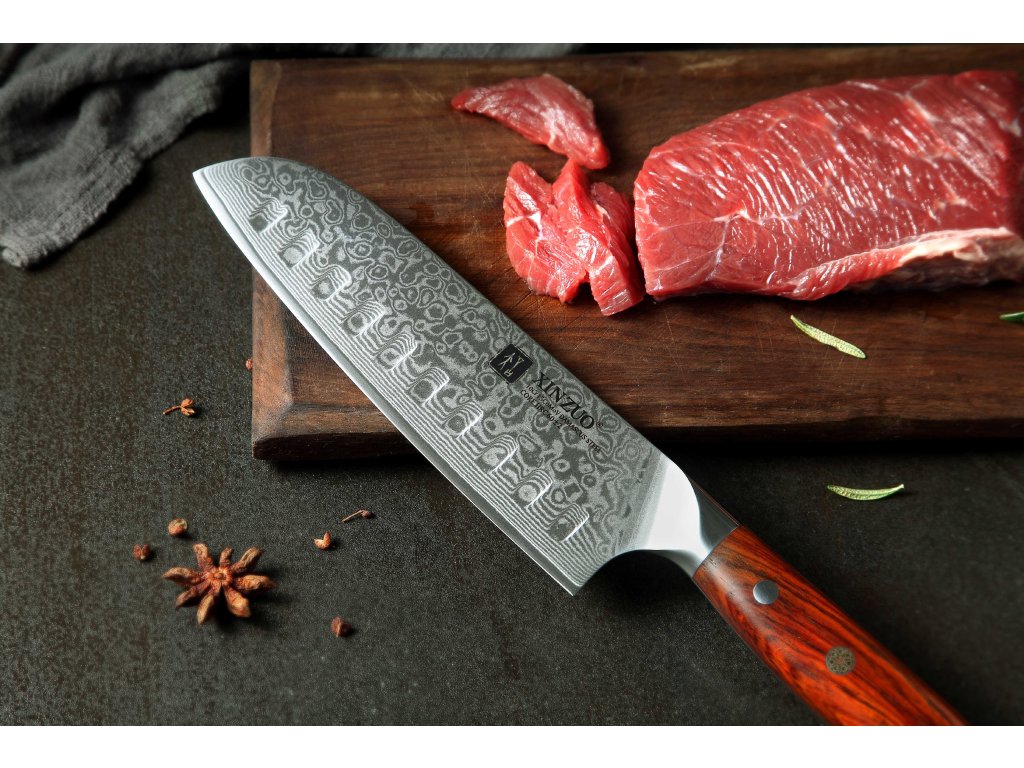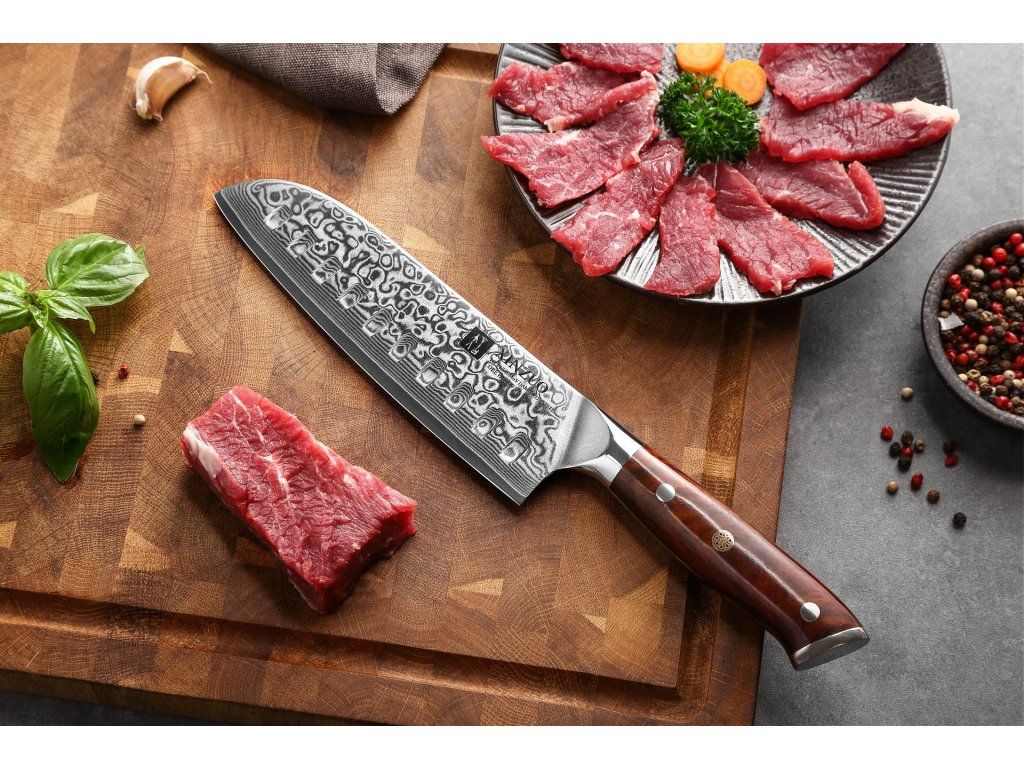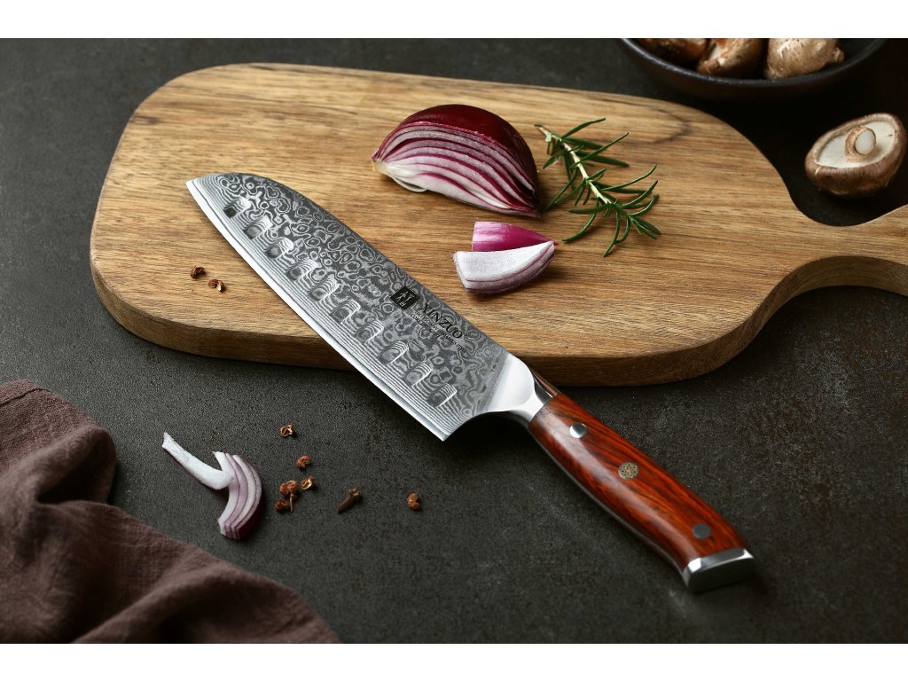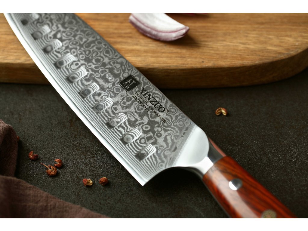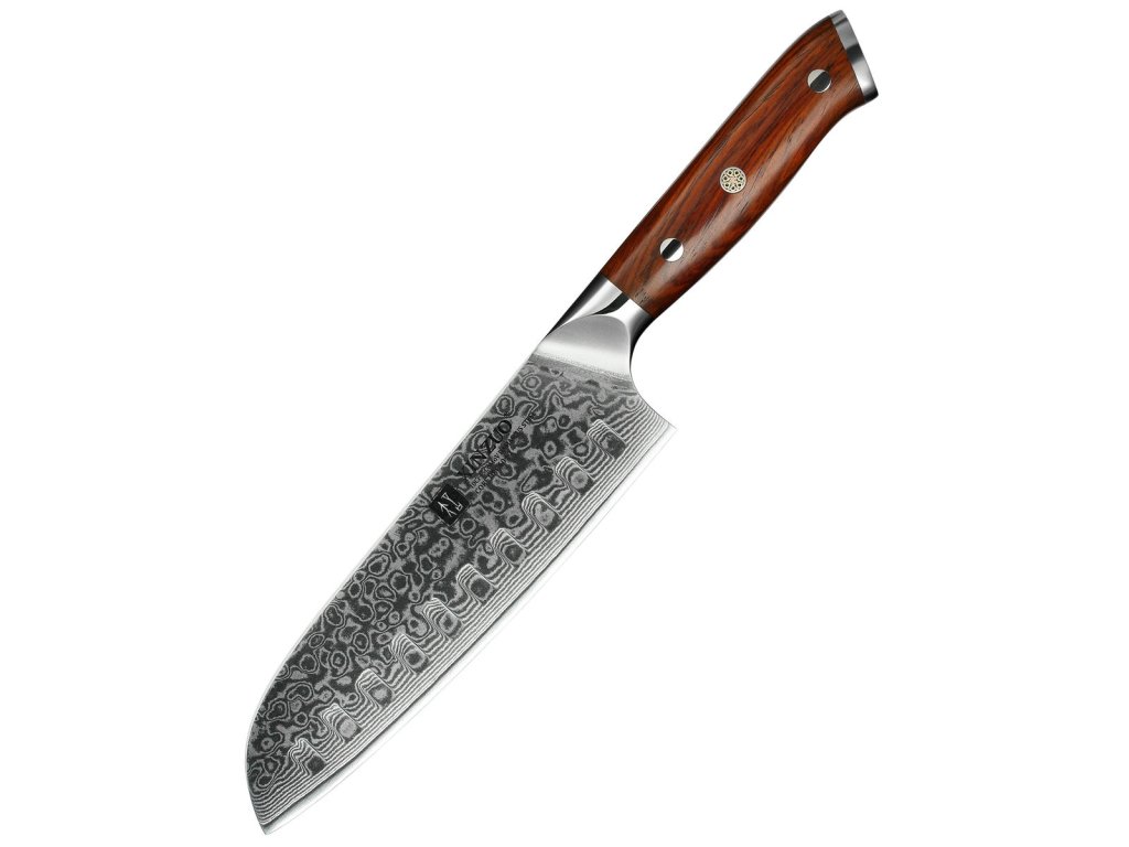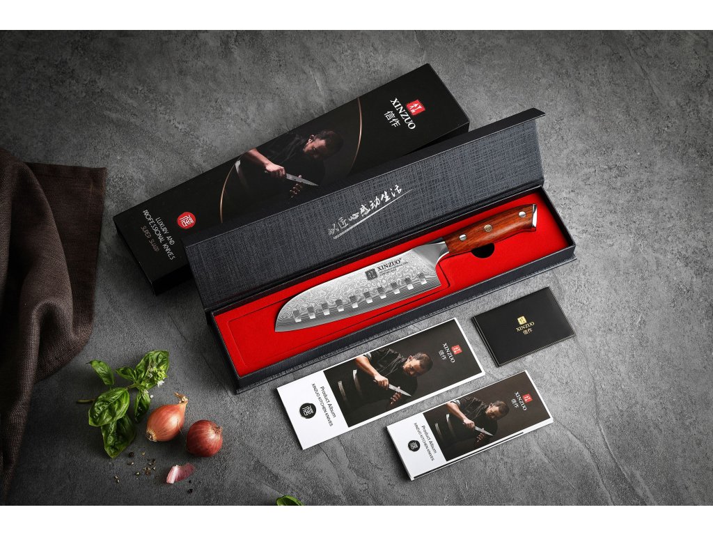 Dieses Santoku Messer ist aus hochwertigem Damaszener Stahl gefertigt, der für die Herstellung der besten Messer verwendet wird. Die Messerklinge mit einer Härte von 60±2 Rockwell besteht aus 67 Lagen. Hochwertiger Stahl in einer Kombination von traditioneller Herstellung garantiert eine lange Lebensdauer des Messers. Die Oberfläche des Messers bietet beim Schneiden Komfort, ohne dass es reibt oder dass die Zutaten an die Klinge pappen. Der Griff des Messers ist aus Palisanderholz gefertigt, das mit der Zeit weder weicher wird noch einen Geruch annimmt. Dank seiner perfekten Form und Länge wird das Schneiden zum Vergnügen und außerdem liegt das Messer gut in der Hand. Aufgrund des natürlichen Griff-Designs kann die Farbe und das Design leicht von den Produktbildern abweichen, da der Griff aus einem anderen Holzstück gefertigt wurde oder da das Alter des Holzes unterschiedlich ist. Der Farbton des Musters auf der Klinge kann unterschiedlich sein, da jedes Messer durch das Stahlschichten einzigartig ist.