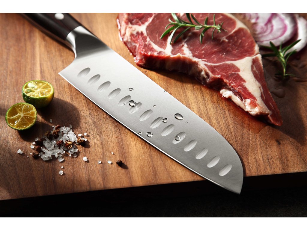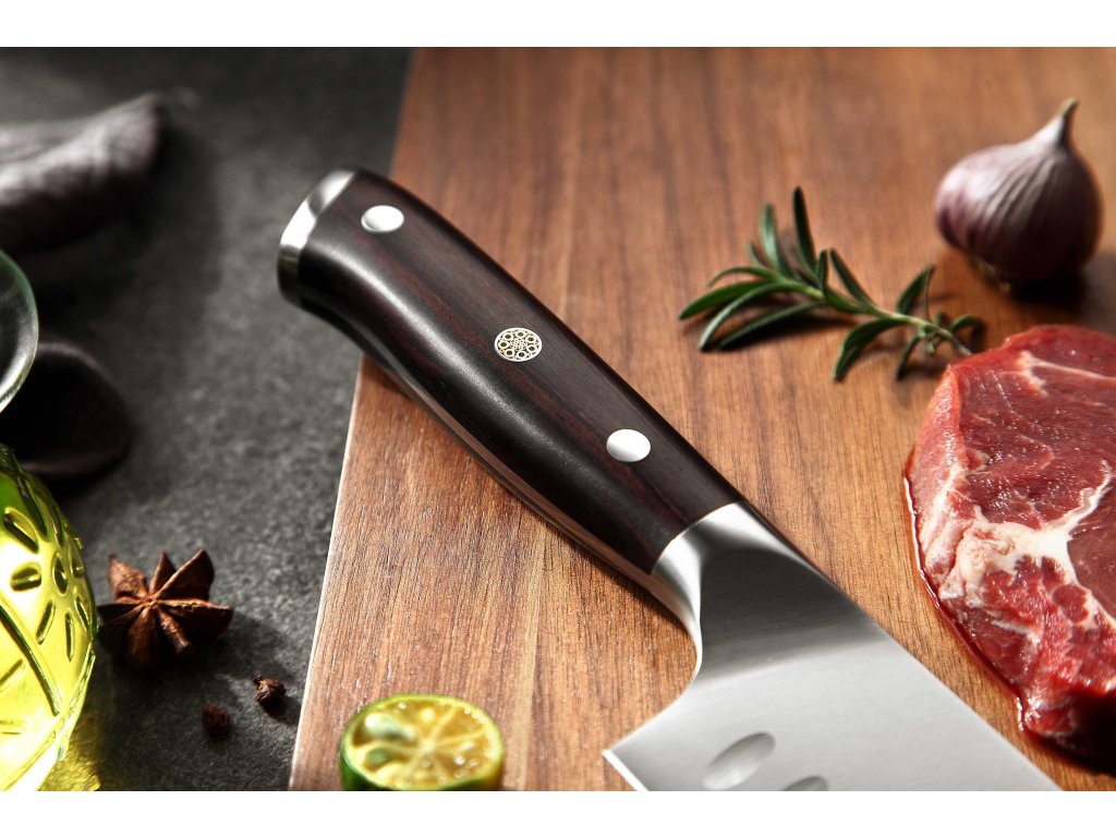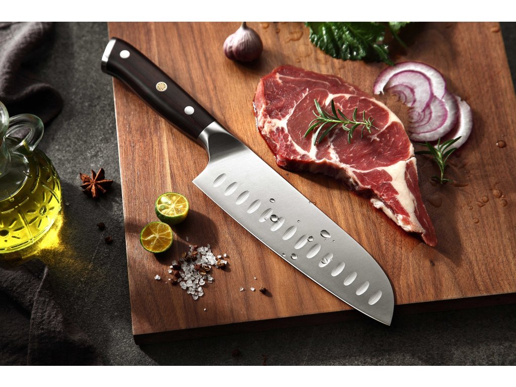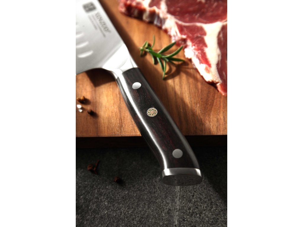 Dieses Santoku Messer ist aus hochwertigem deutschem Stahl gefertigt, der für die Herstellung von hochwertigen Messern verwendet wird. Seine Klinge ist eben aus diesem Stahl mit einer Härte von 56-58 Rockwell gefertigt. Hochwertiger Stahl in einer Kombination von traditioneller Herstellung garantiert eine lange Lebensdauer des Messers. Die Oberfläche des Messers bietet beim Schneiden Komfort, ohne dass es reibt oder dass die Zutaten an die Klinge pappen. Der Messergriff ist aus hochwertigem Ebenholz gefertigt, das mit der Zeit weder weicher wird noch einen Geruch annimmt. Dank seiner perfekten Form und Länge wird das Schneiden zum Vergnügen und außerdem liegt das Messer gut in der Hand. Aufgrund des natürlichen Griff-Designs kann die Farbe und das Design leicht von den Produktbildern abweichen, da der Griff aus einem anderen Holzstück gefertigt wurde oder da das Alter des Holzes unterschiedlich ist.