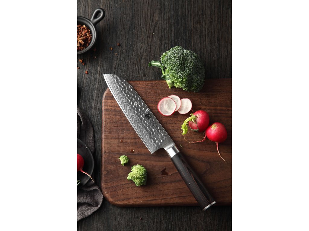 Santokumesser - japanische Präzision bei jedem Schnitt. Das Santokumesser gehört dank seiner Vielseitigkeit und seines kultigen Designs zu den beliebtesten japanischen Messern. Dank der breiten Klinge und dem präzisen Schliff lassen sich Obst, Gemüse und Fleisch mit maximaler Kontrolle und Präzision schneiden. Die Klingengröße des Santokumessers ermöglicht Ihnen die gehackten Zutaten direkt in den Topf oder die Pfanne zu schieben. Eine gute Wahl für alle, die ein vielseitiges Messer mit japanischer Eleganz für ihre Küche suchen.
