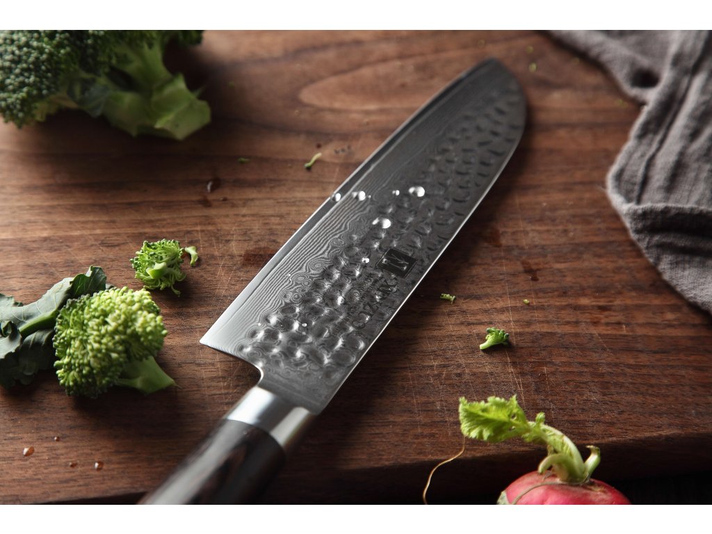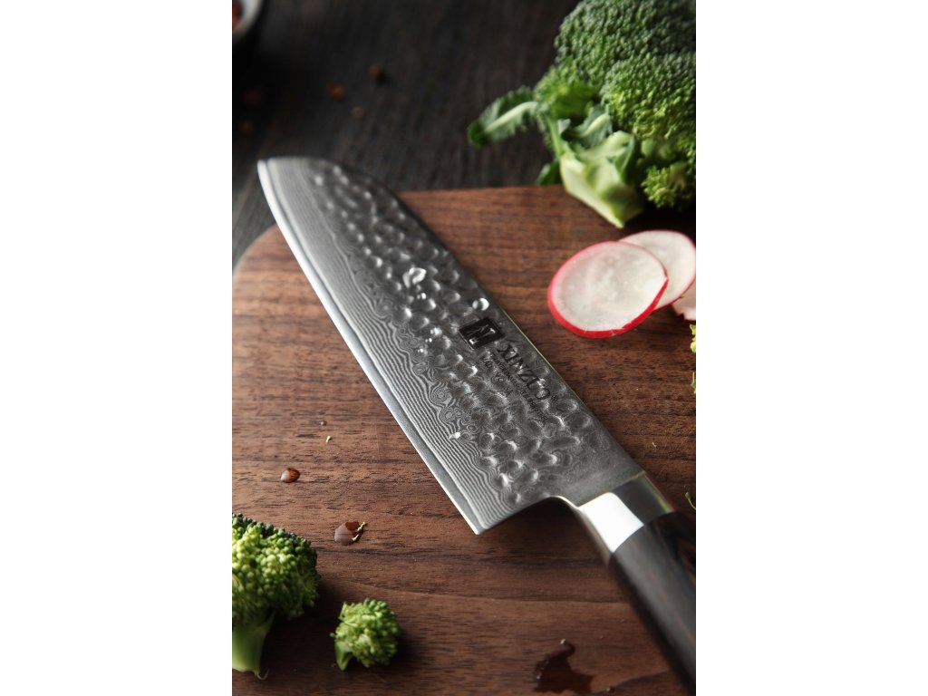 Santokumesser XinZuo He B1H 18 cm mit Klinge aus Damaststahl und handgefertigt für perfekte Schärfe.