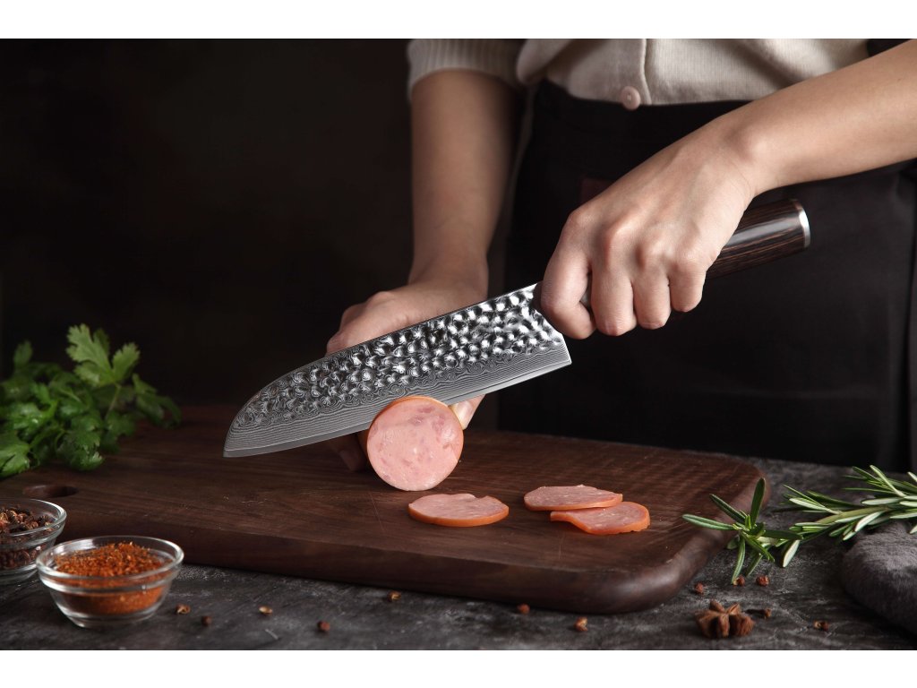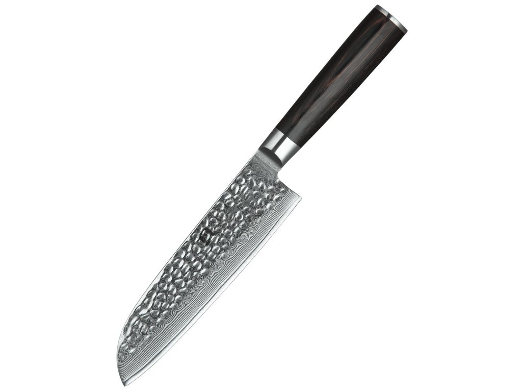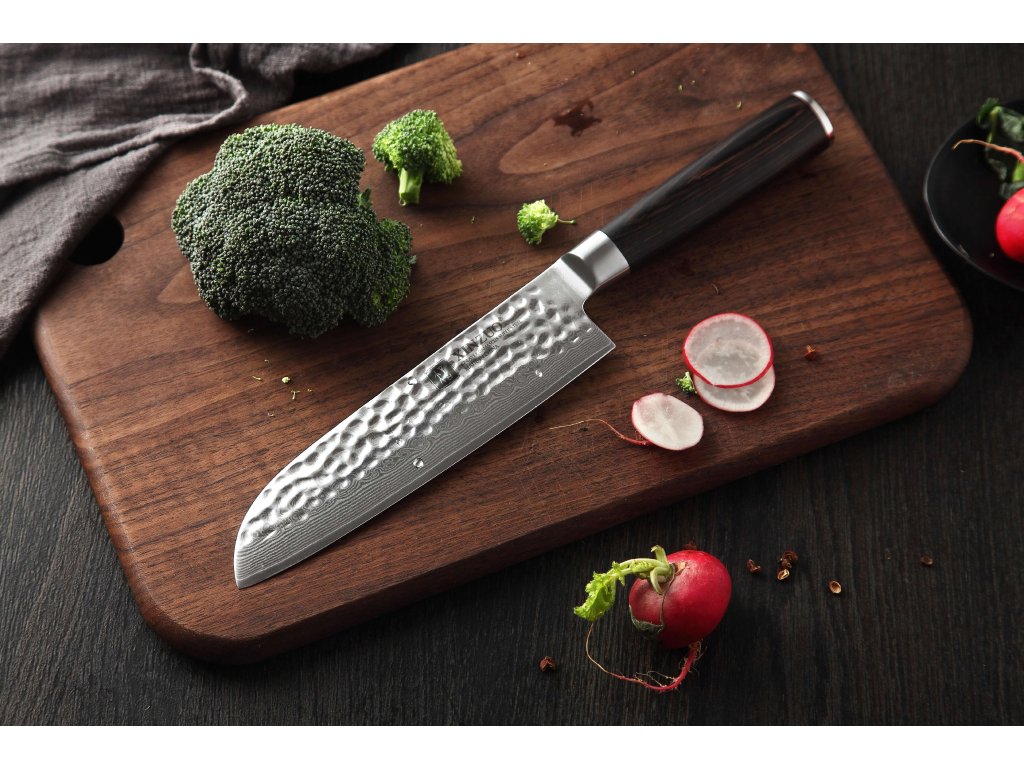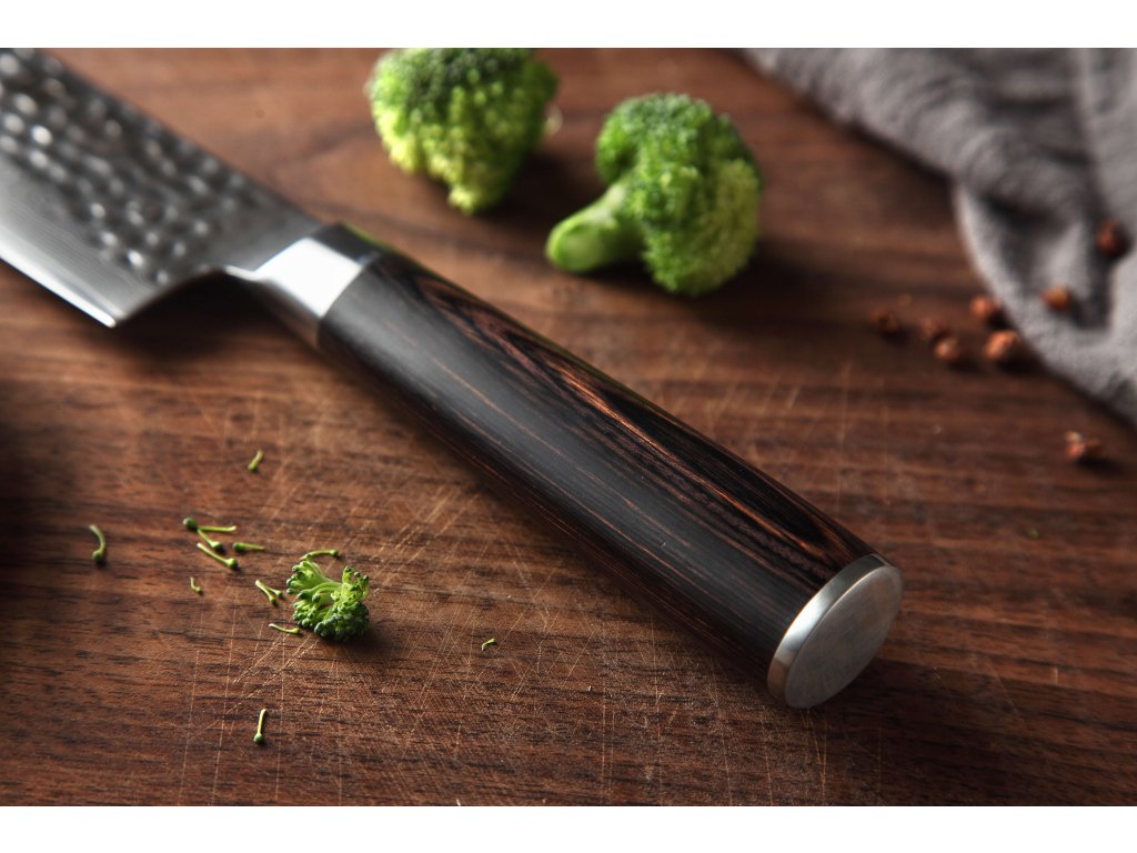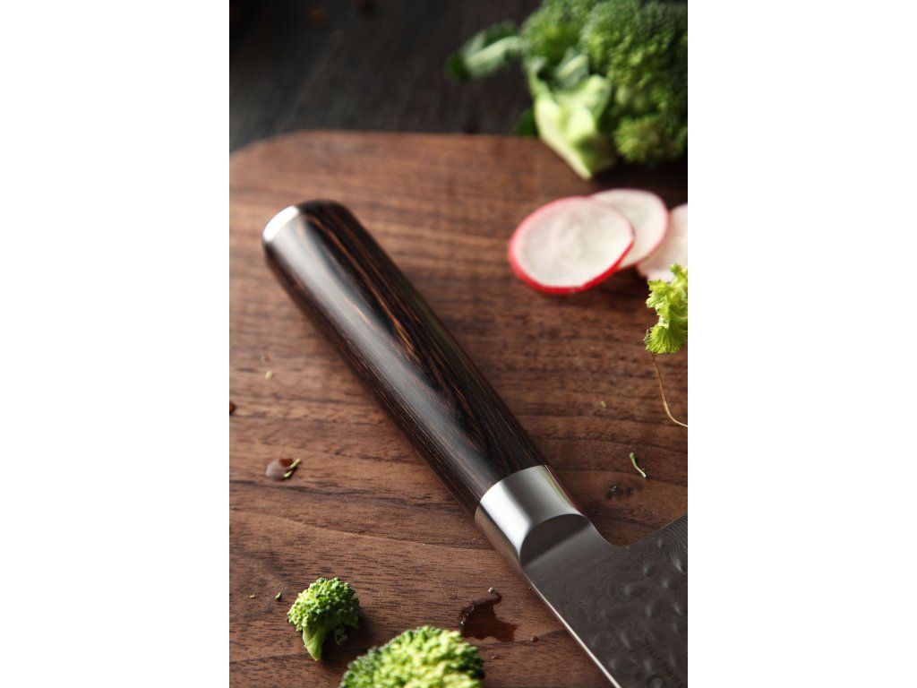 Dieses Santokumesser ist aus hochwertigem Damaszener Stahl gefertigt, der für die Herstellung der besten Messer verwendet wird. Die Messerklinge mit einer Härte von 60±2 Rockwell besteht aus 67 Lagen. Hochwertiger Stahl in einer Kombination von traditioneller Herstellung garantiert eine lange Lebensdauer des Messers. Die Oberfläche des Messers bietet beim Schneiden Komfort, ohne dass es reibt oder dass die Zutaten an die Klinge pappen. Der Messergriff besteht aus Pakkaholz, das mit der Zeit weder weicher wird noch Geruch annimmt. Dank seiner perfekten Form und Länge wird das Schneiden zum Vergnügen und außerdem liegt das Messer gut in der Hand. Aufgrund des natürlichen Griff-Designs kann die Farbe und das Design leicht von den Produktbildern abweichen, da der Griff aus einem anderen Holzstück gefertigt wurde oder da das Alter des Holzes unterschiedlich ist. Der Farbton des Musters auf der Klinge kann unterschiedlich sein, da jedes Messer durch das Stahlschichten einzigartig ist.