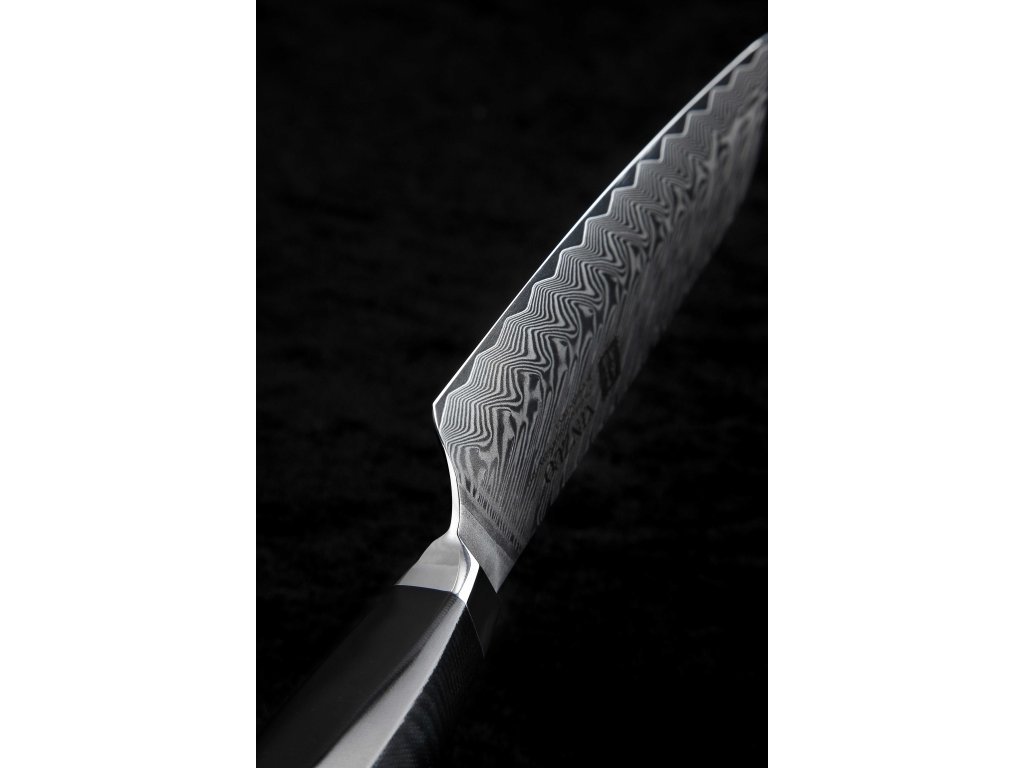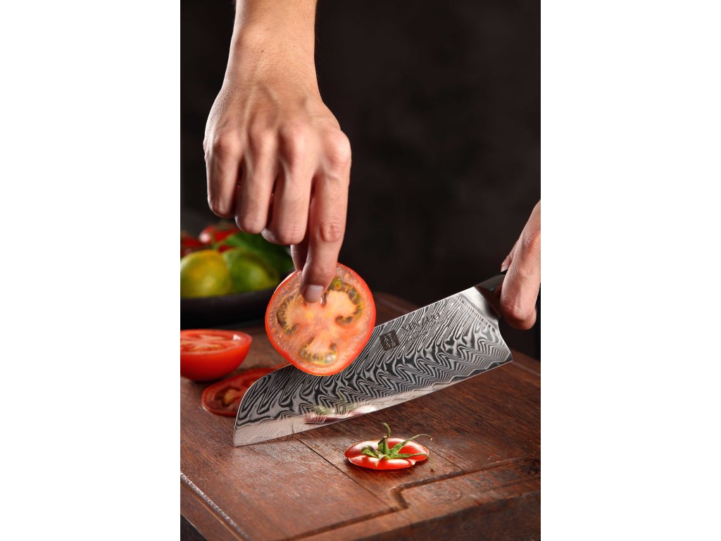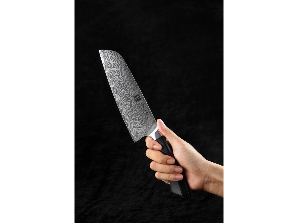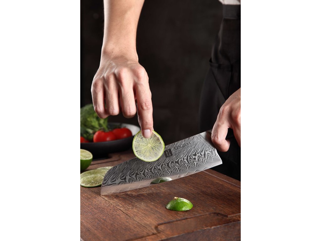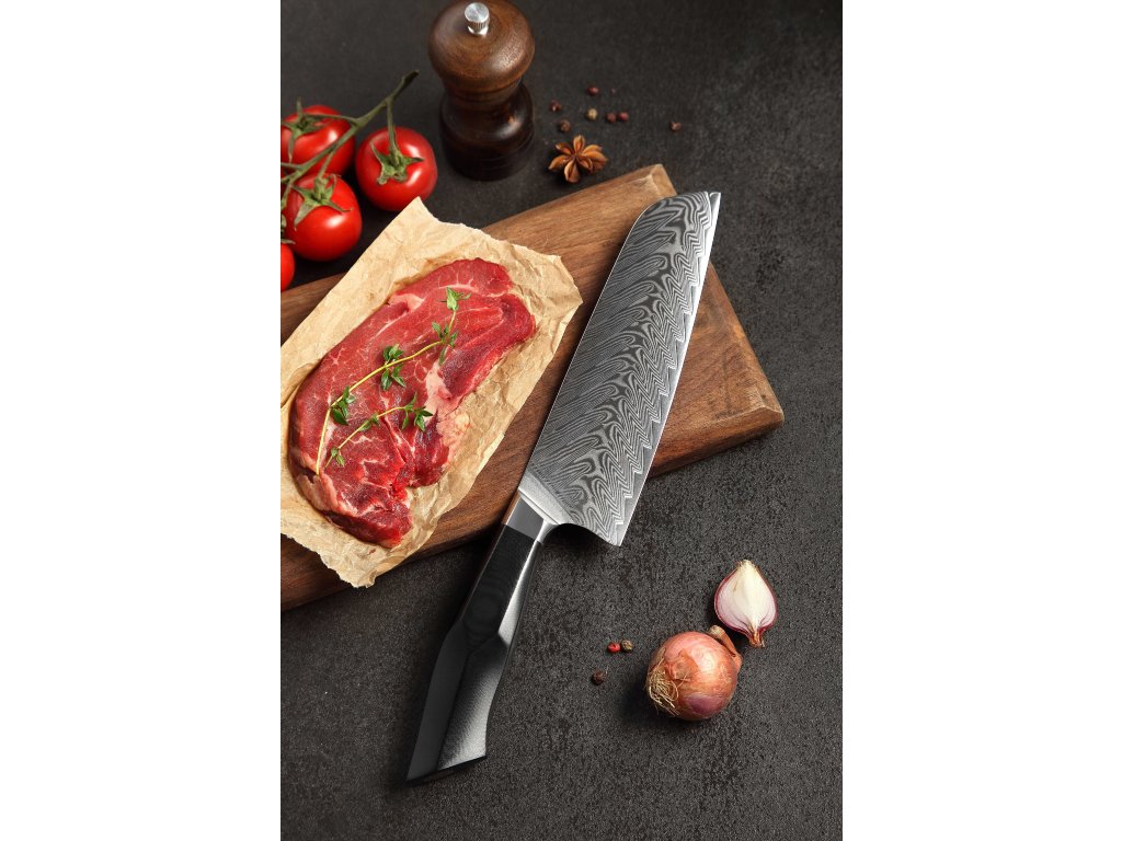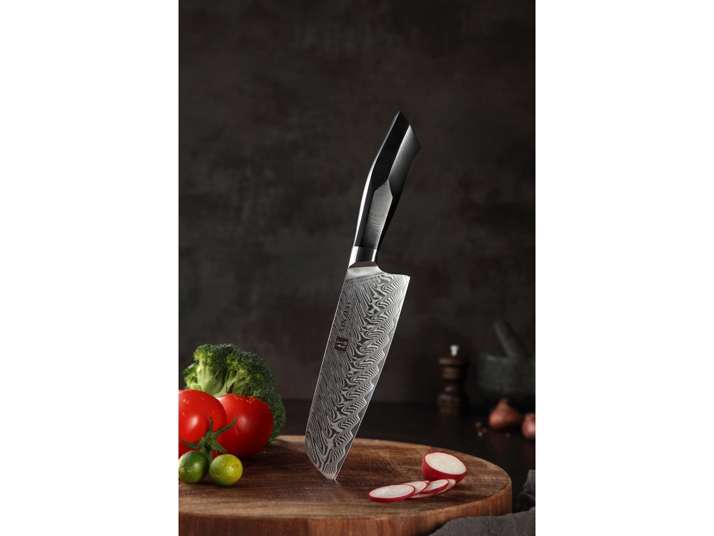 Dieses Santokumesser ist aus hochwertigem Damaszener Stahl gefertigt, der für die Herstellung der besten Messer verwendet wird. Die Messerklinge mit einer Härte von 60±2 Rockwell besteht aus 67 Lagen. Hochwertiger Stahl in einer Kombination von traditioneller Herstellung garantiert eine lange Lebensdauer des Messers. Die Oberfläche des Messers bietet beim Schneiden Komfort, ohne dass es reibt oder dass die Zutaten an die Klinge pappen. Der Messergriff besteht aus dem Verbundmaterial G10, das mit der Zeit weder weicher wird noch Geruch annimmt. Dank seiner perfekten Form und Länge wird das Schneiden zum Vergnügen und außerdem liegt das Messer gut in der Hand. Der Farbton des Musters auf der Klinge kann unterschiedlich sein, da jedes Messer durch das Stahlschichten einzigartig ist.