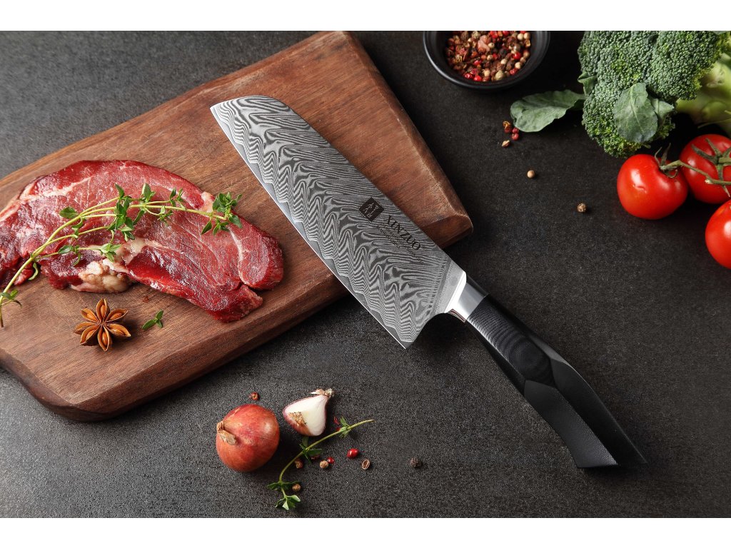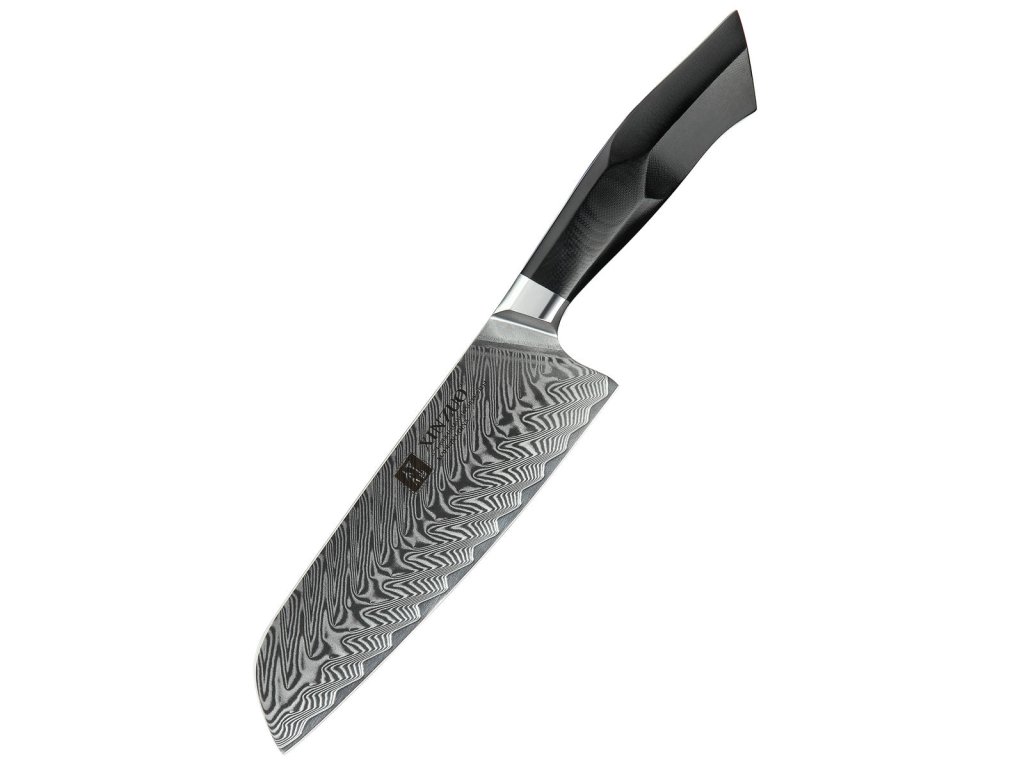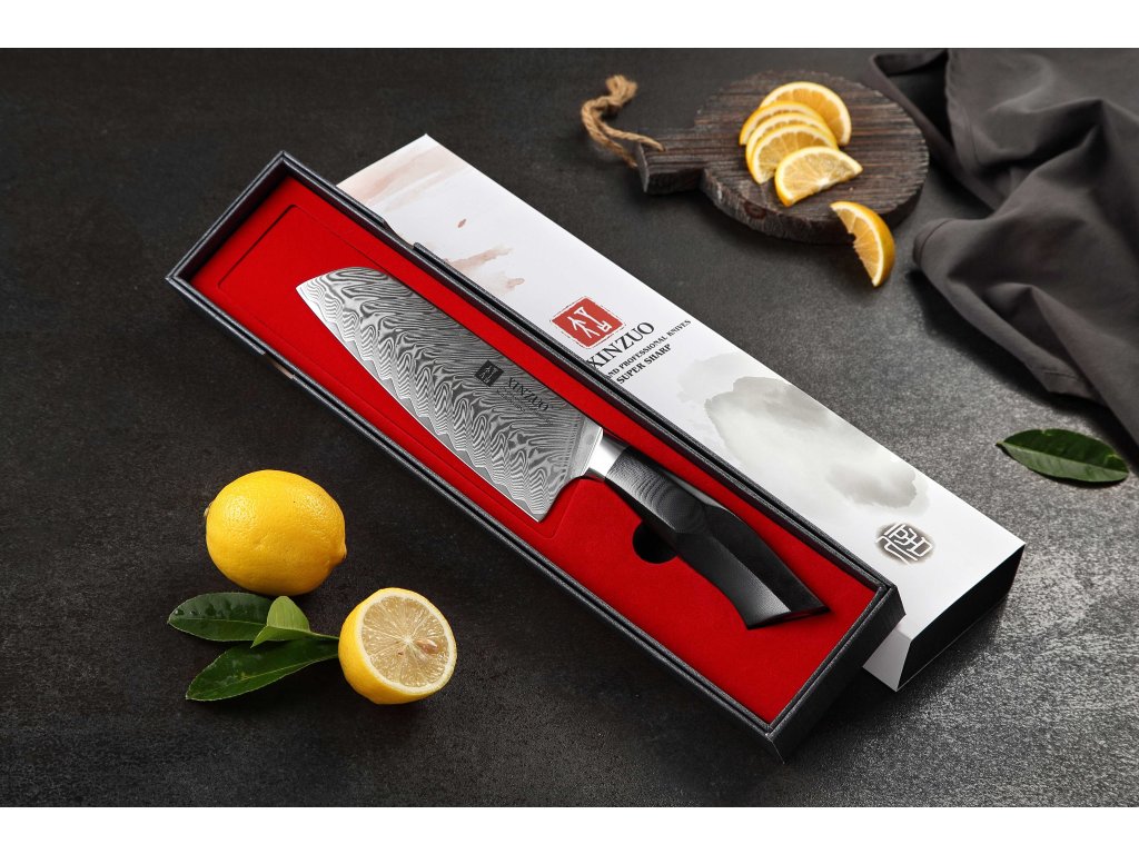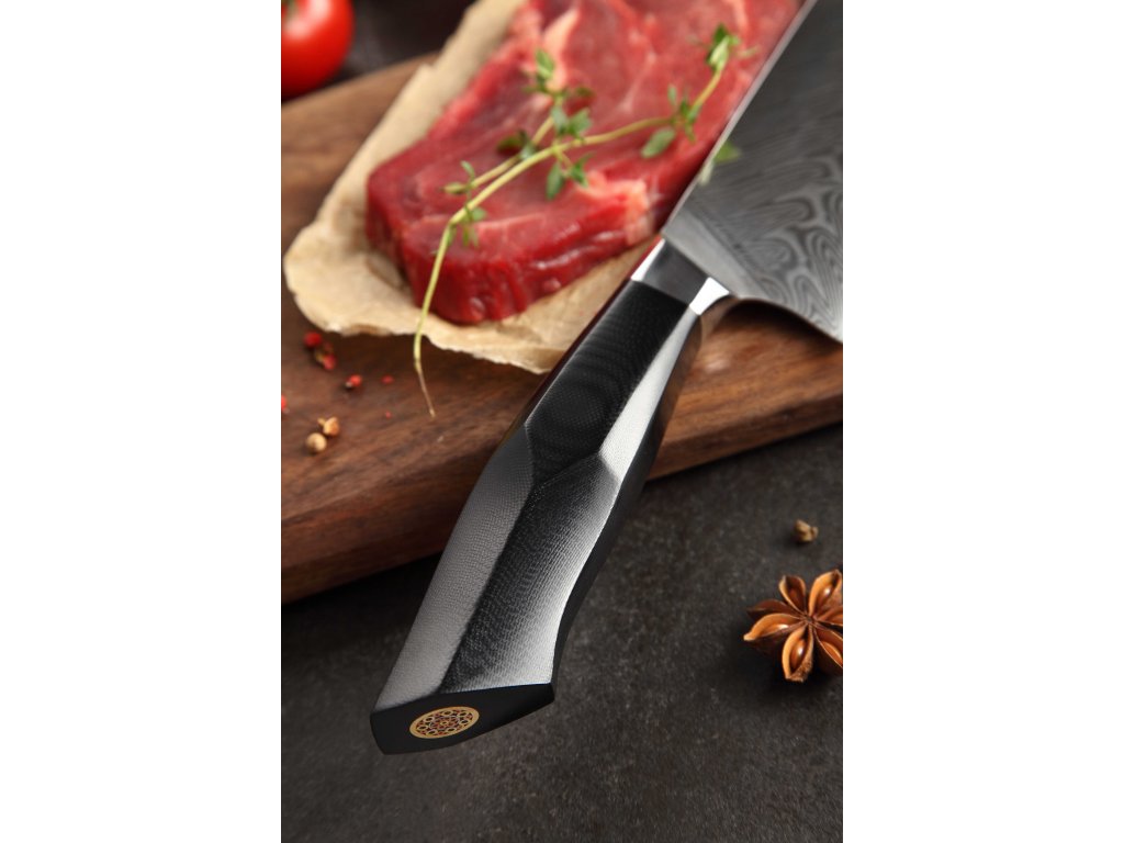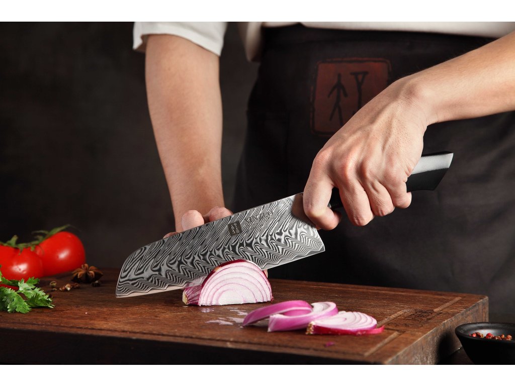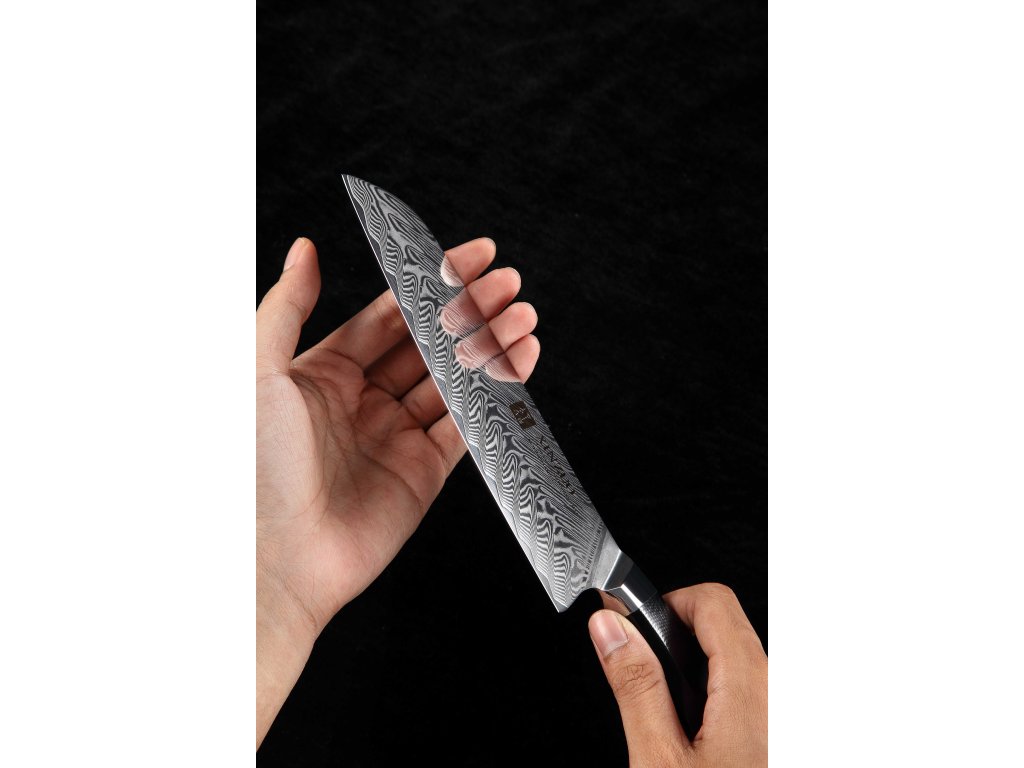 Dieses Santokumesser ist aus hochwertigem Damaszener Stahl gefertigt, der für die Herstellung der besten Messer verwendet wird. Die Messerklinge mit einer Härte von 60±2 Rockwell besteht aus 67 Lagen. Hochwertiger Stahl in einer Kombination von traditioneller Herstellung garantiert eine lange Lebensdauer des Messers. Die Oberfläche des Messers bietet beim Schneiden Komfort, ohne dass es reibt oder dass die Zutaten an die Klinge pappen. Der Messergriff besteht aus dem Verbundmaterial G10, das mit der Zeit weder weicher wird noch Geruch annimmt. Dank seiner perfekten Form und Länge wird das Schneiden zum Vergnügen und außerdem liegt das Messer gut in der Hand. Der Farbton des Musters auf der Klinge kann unterschiedlich sein, da jedes Messer durch das Stahlschichten einzigartig ist.