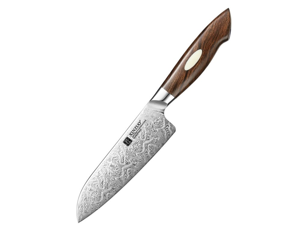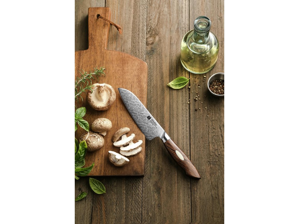 Handgefertigtes kleines Santokumesser XinZuo 14 cm der Serie B46D mit einzigartiger Klinge aus zwei verschiedenen Damaststählen und Hartholzgriff in einer Geschenkbox.