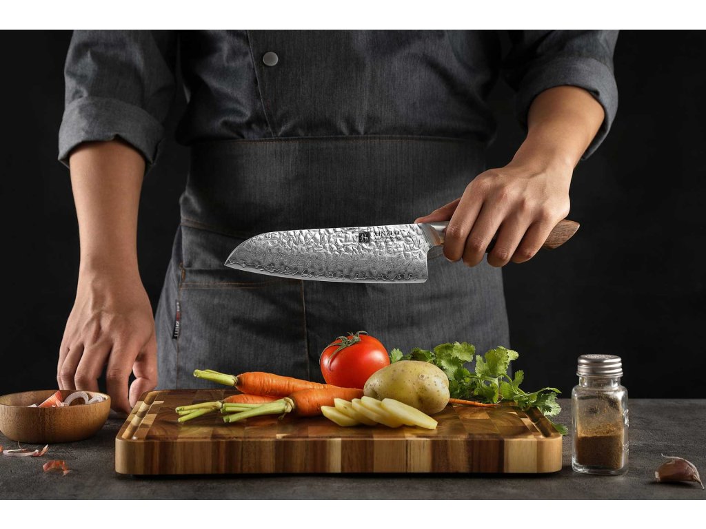 Santokumesser - japanische Präzision bei jedem Schnitt. Das Santokumesser gehört dank seiner Vielseitigkeit und seines kultigen Designs zu den beliebtesten japanischen Messern. Dank der breiten Klinge und dem präzisen Schliff lassen sich Obst, Gemüse und Fleisch mit maximaler Kontrolle und Präzision schneiden. Die Klingengröße des Santokumessers ermöglicht Ihnen die gehackten Zutaten direkt in den Topf oder die Pfanne zu schieben. Eine gute Wahl für alle, die ein vielseitiges Messer mit japanischer Eleganz für ihre Küche suchen.