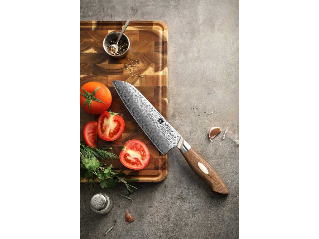 Dieses Santokumesser ist aus hochwertigem AUS10-Damaststahl gefertigt, der von der renommierten Firma Aichi Steel in Japan hergestellt wird. Dieser innovative japanische Stahl zeichnet sich durch seine hohe Schärfe und Haltbarkeit aus. Er hat einen hohen Gehalt von Kohlenstoff (1,10 %) und Chrom (14,50 %), dank dessen er korrosionsbeständig ist. Die Klinge des Messers mit einer Härte von 60±2 Rockwell besteht aus 67 Lagen und wurde einer kryogenen Vakuumbehandlung unterzogen. Der Korrosionsschutz wird durch den äußeren Edelstahl SUS430 gewährleistet, in den der Kern des Messers (aus AUS-10) eingebettet ist. Der Farbton des Musters auf der Klinge kann unterschiedlich sein, da jedes Messer durch das Stahlschichten einzigartig ist.