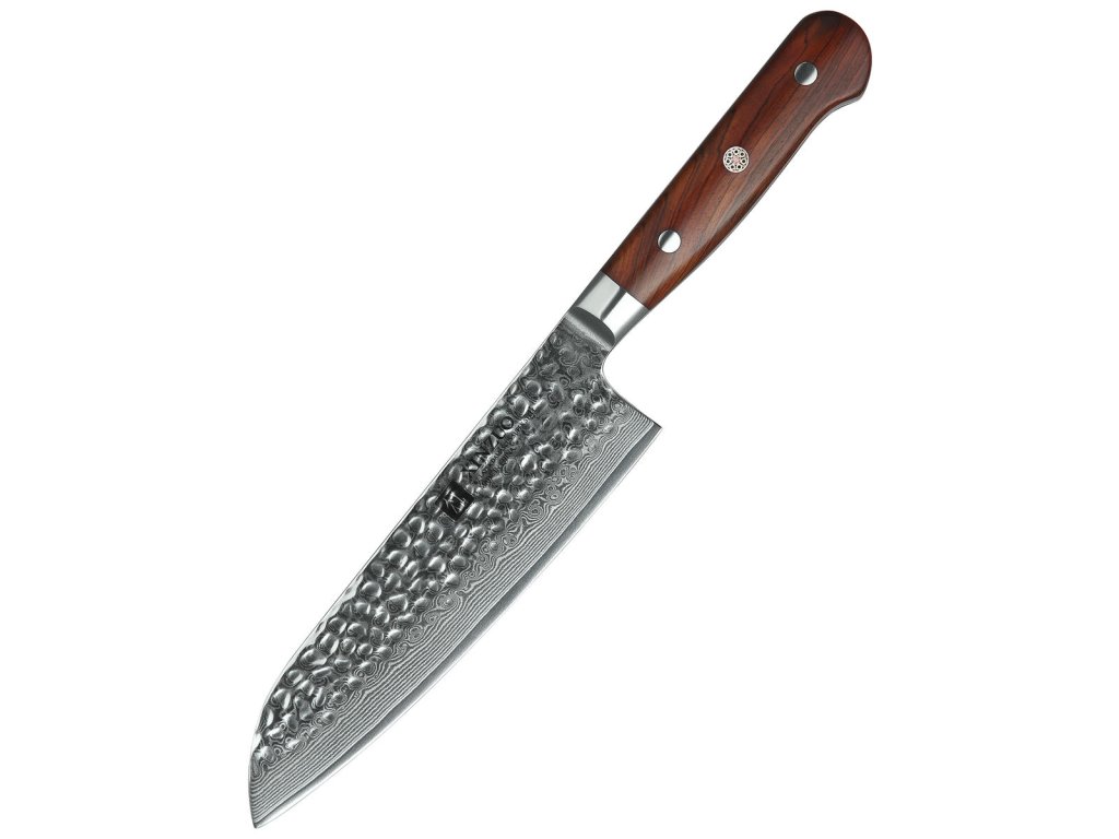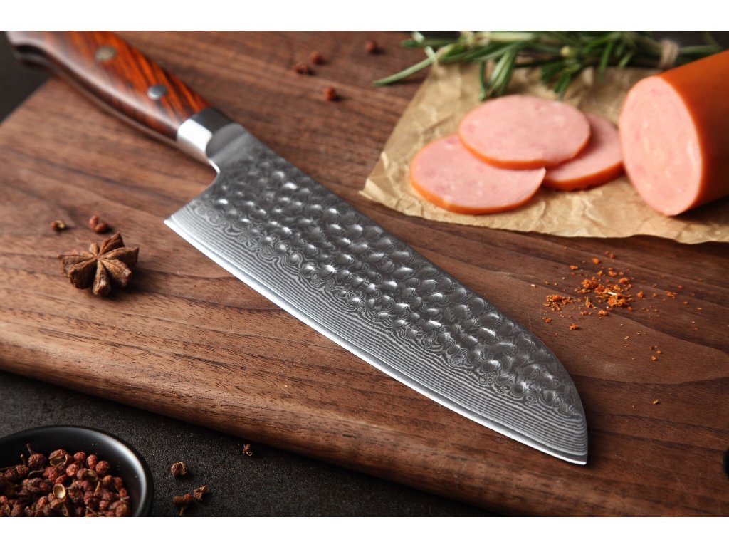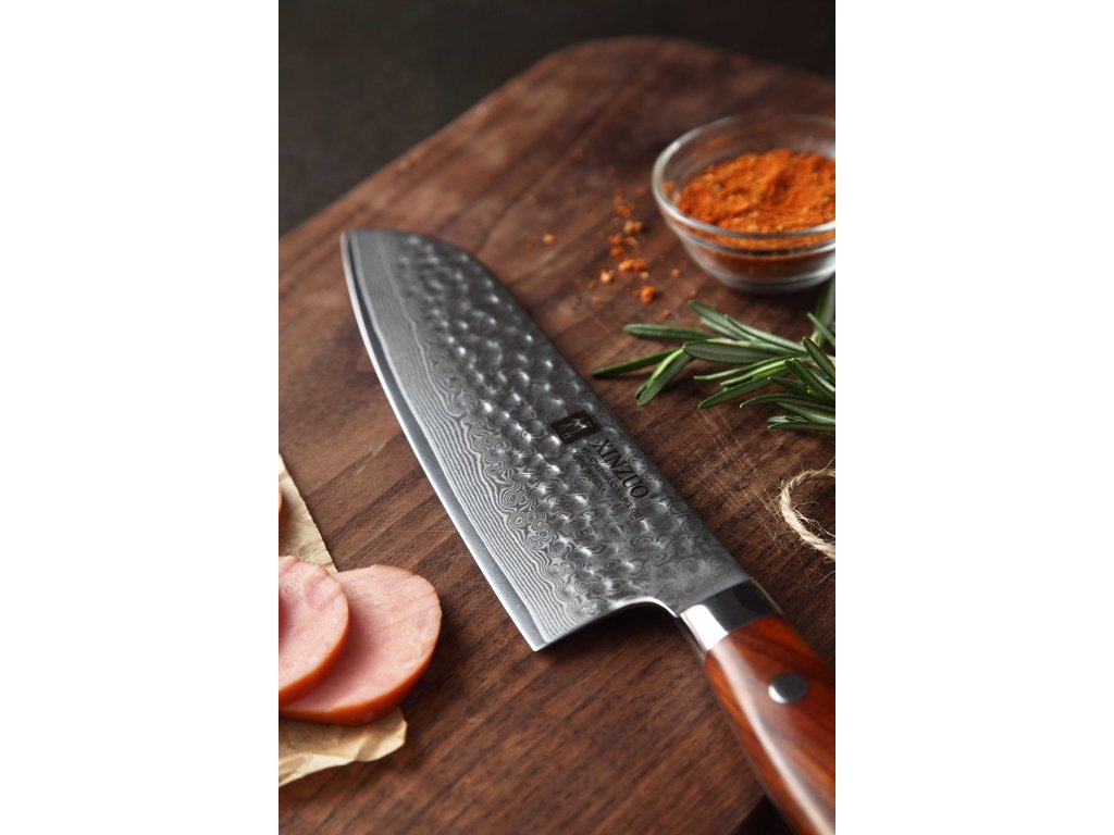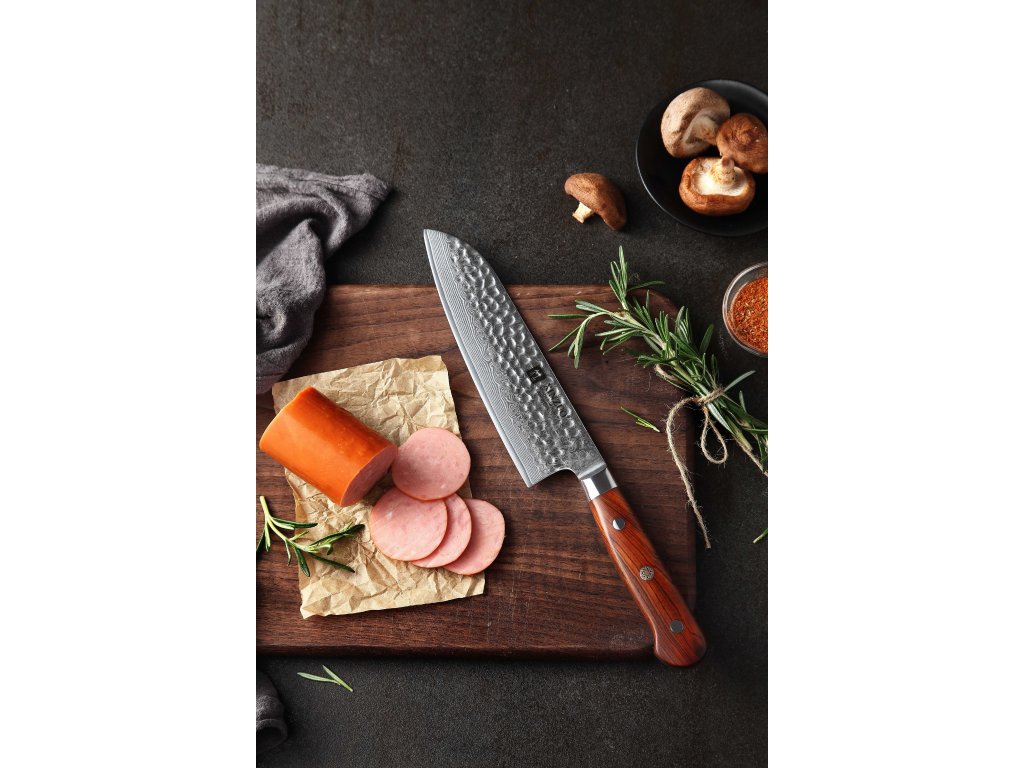Dieses Santokumesser ist aus hochwertigem Damaszener Stahl gefertigt, der für die Herstellung der besten Messer verwendet wird. Die Messerklinge mit einer Härte von 60±2 Rockwell besteht aus 67 Lagen. Hochwertiger Stahl in einer Kombination von traditioneller Herstellung garantiert eine lange Lebensdauer des Messers. Die Oberfläche des Messers bietet beim Schneiden Komfort, ohne dass es reibt oder dass die Zutaten an die Klinge pappen. Der Messergriff besteht aus Palisanderholz, das mit der Zeit weder weicher wird noch Geruch annimmt. Dank seiner perfekten Form und Länge wird das Schneiden zum Vergnügen und außerdem liegt das Messer gut in der Hand. Aufgrund des natürlichen Griff-Designs kann die Farbe und das Design leicht von den Produktbildern abweichen, da der Griff aus einem anderen Holzstück gefertigt wurde oder da das Alter des Holzes unterschiedlich ist. Der Farbton des Musters auf der Klinge kann unterschiedlich sein, da jedes Messer durch das Stahlschichten einzigartig ist.
