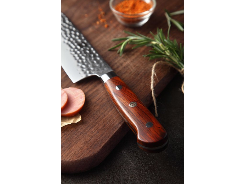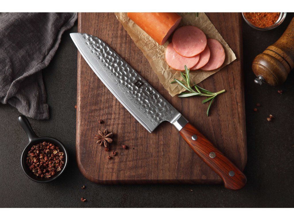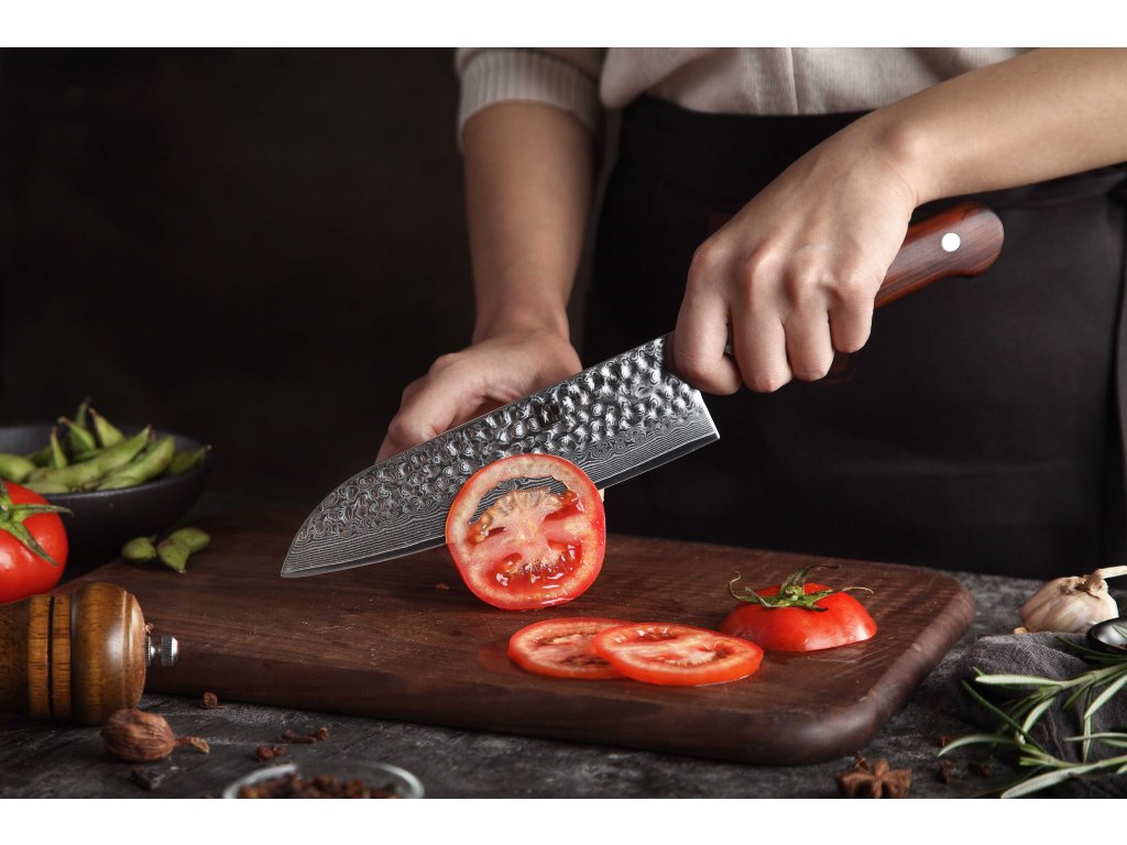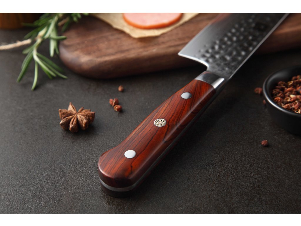 Dieses Santokumesser ist aus hochwertigem Damaszener Stahl gefertigt, der für die Herstellung der besten Messer verwendet wird. Die Messerklinge mit einer Härte von 60±2 Rockwell besteht aus 67 Lagen. Hochwertiger Stahl in einer Kombination von traditioneller Herstellung garantiert eine lange Lebensdauer des Messers. Die Oberfläche des Messers bietet beim Schneiden Komfort, ohne dass es reibt oder dass die Zutaten an die Klinge pappen. Der Messergriff besteht aus Palisanderholz, das mit der Zeit weder weicher wird noch Geruch annimmt. Dank seiner perfekten Form und Länge wird das Schneiden zum Vergnügen und außerdem liegt das Messer gut in der Hand. Aufgrund des natürlichen Griff-Designs kann die Farbe und das Design leicht von den Produktbildern abweichen, da der Griff aus einem anderen Holzstück gefertigt wurde oder da das Alter des Holzes unterschiedlich ist. Der Farbton des Musters auf der Klinge kann unterschiedlich sein, da jedes Messer durch das Stahlschichten einzigartig ist.