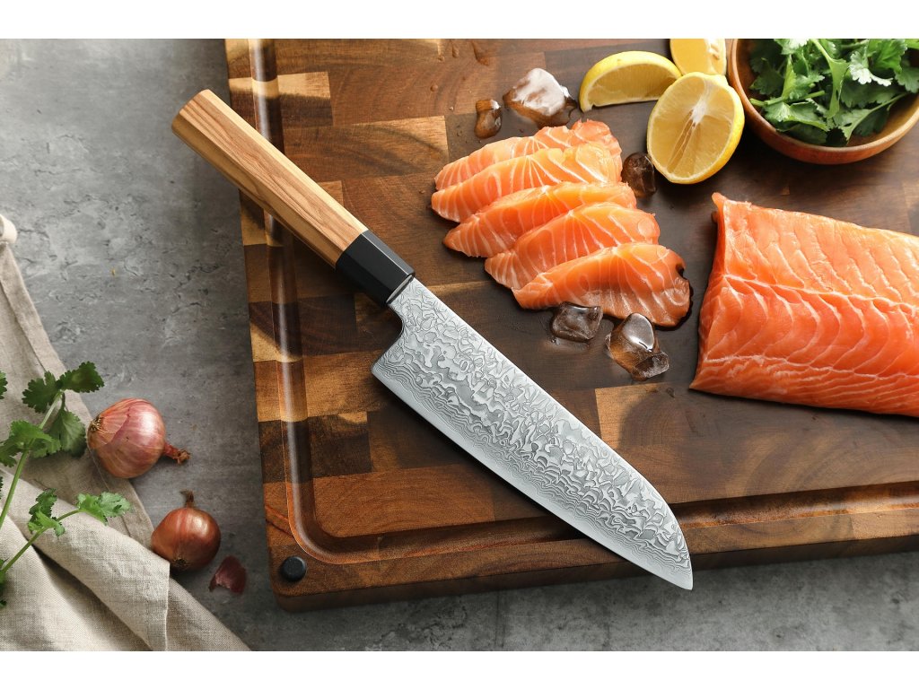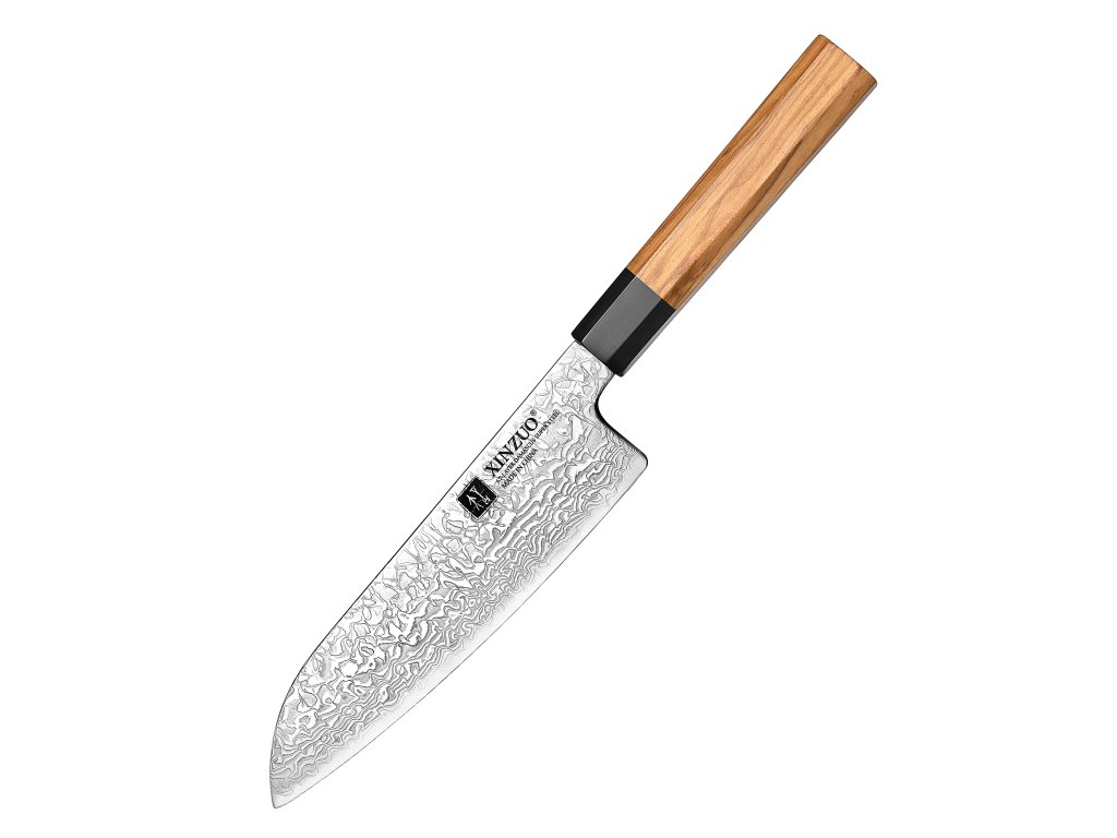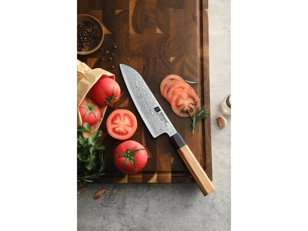 Elegantes Santokumesser XinZuo Zhen PM8O mit 19-cm-Klinge aus Damaszener Stahl und achteckigem Griff aus Olivenholz und Büffelhorn im japanischen Stil.