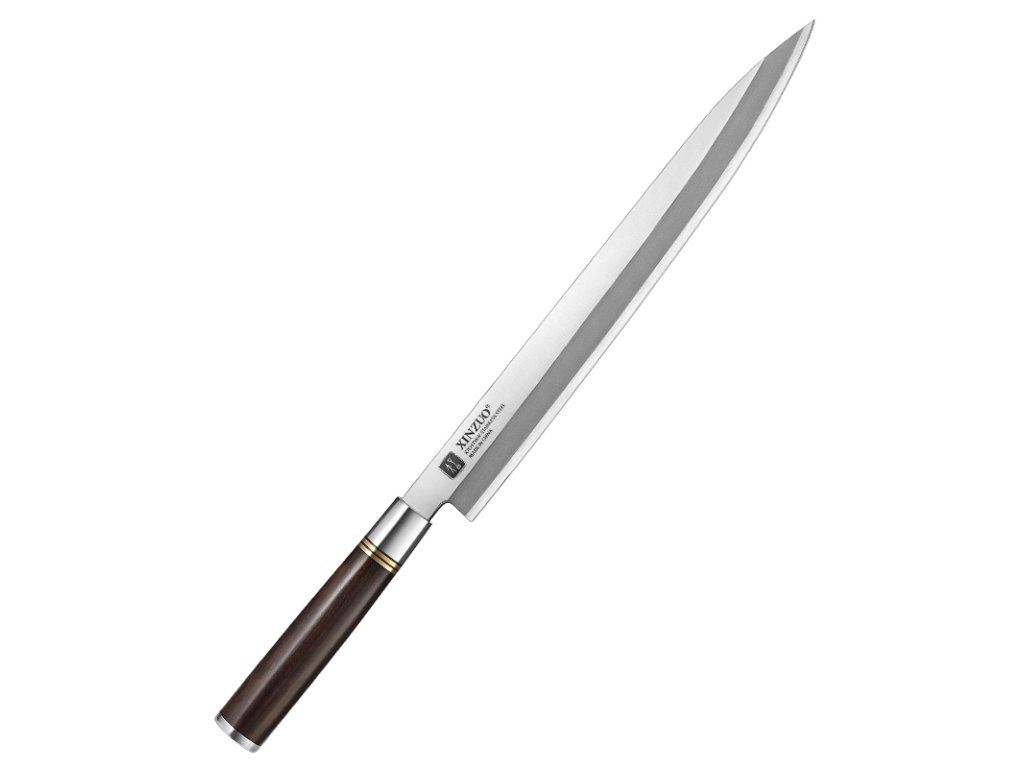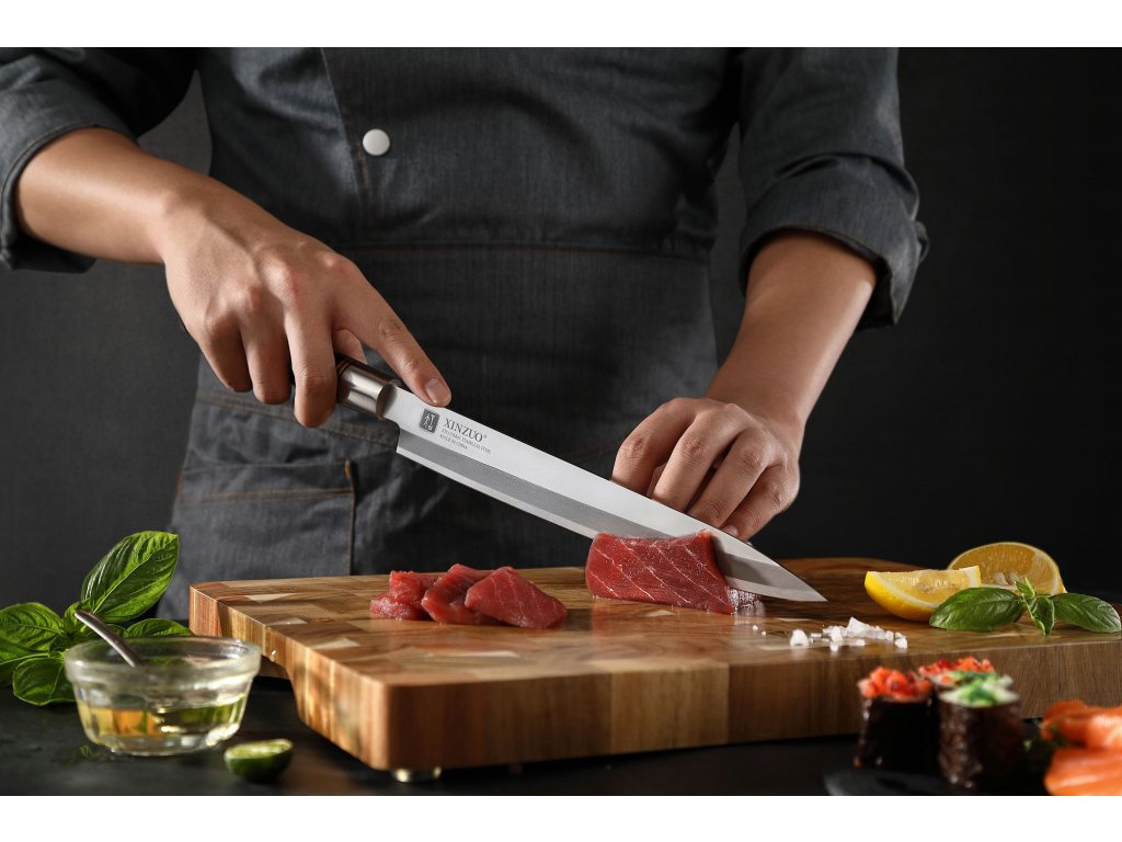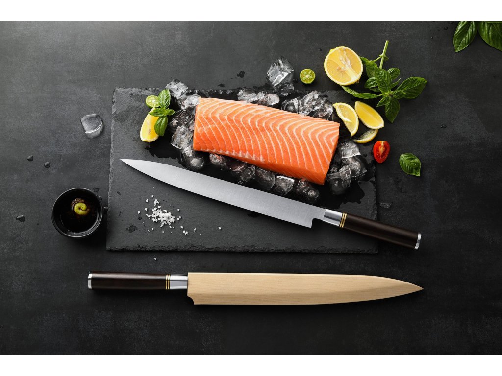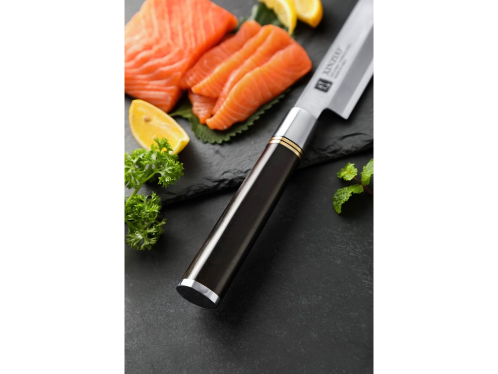 Spezielles Sashimi Messer im japanischen Stil mit 24 cm langer Klinge aus Edelstahl, ideal zum Schneiden perfekter Scheiben von Fischfleisch für Sushi.