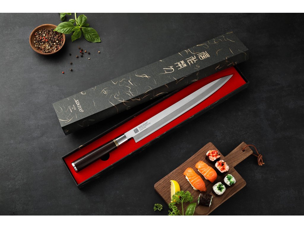 Das Sashimi-Messer XinZuo aus der Serie He mit 300mm Klinge ist in einer luxuriösen Geschenkbox verpackt und eignet sich somit als ein ideales praktisches Geschenk. Das luxuriöse Design der Geschenkbox und das hochwertige XinZuo Messer im Set wird jeden Beschenkten Freude machen.