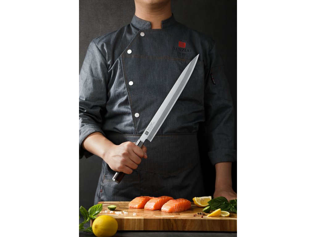 Das Sashimi Messer hat seinen historischen Ursprung in Japan, wo das weltweit beliebte Sushi seine Herkunft hat. Der Name dieses japanischen Messers wird mit Sushi in Verbindung gebracht, insbesondere mit dem beliebten Sushi-Sashimi. Das Sashimi Messer hat eine ikonisch lange Klinge mit geringer Höhe. Somit können Sie mit einem Schnitt dünne Scheiben von frischem, rohem Fischfleisch schneiden, ohne dass Sie die Fleischstruktur zerreißen und sie anderes beschädigen. Die Klinge des Messers ist unkonventionell nur auf einer Seite der Klinge geschliffen. Die einseitige Klinge des Sashimi-Messers ist ideal zum Schneiden von Fischfleischscheiben.