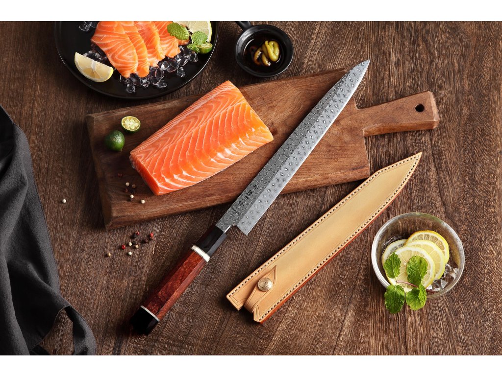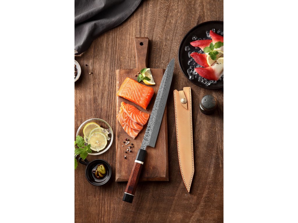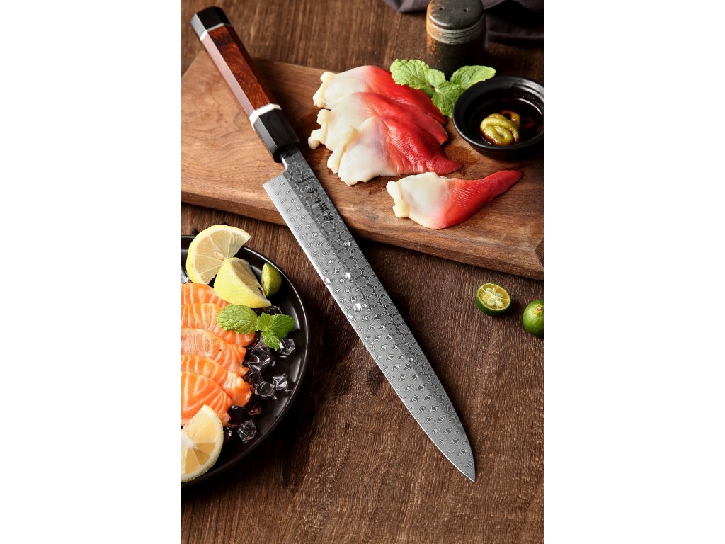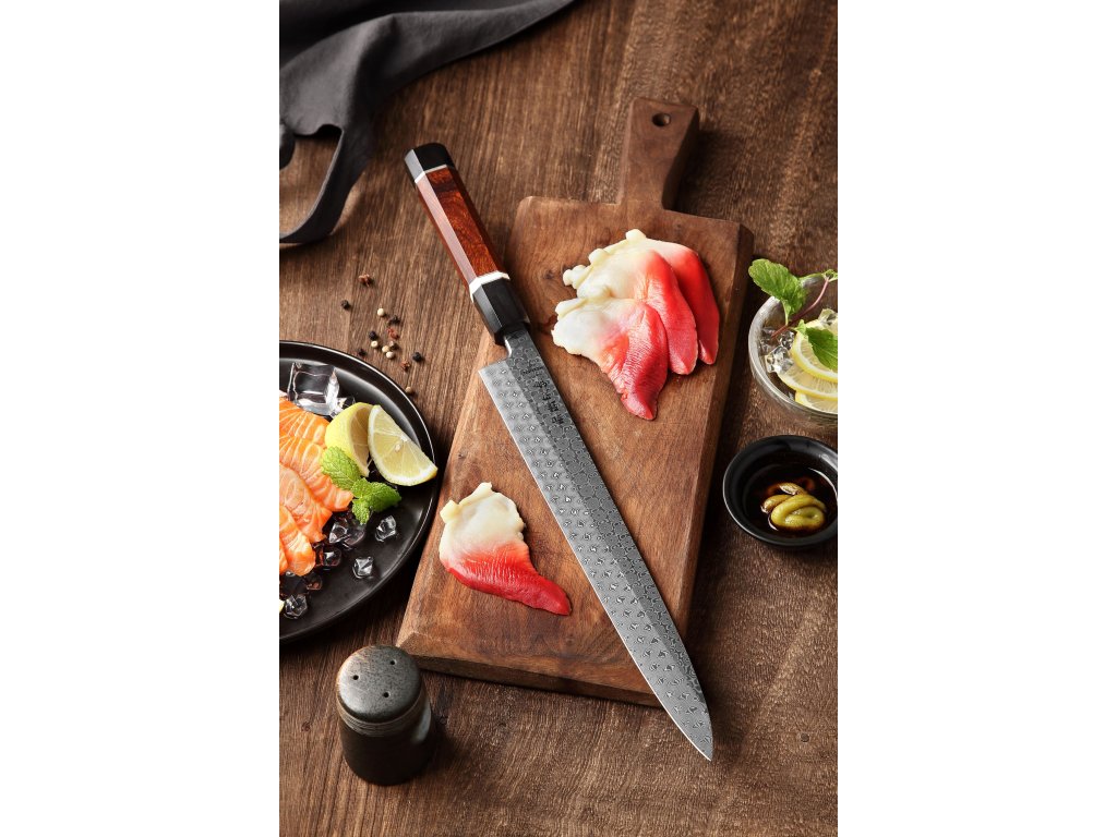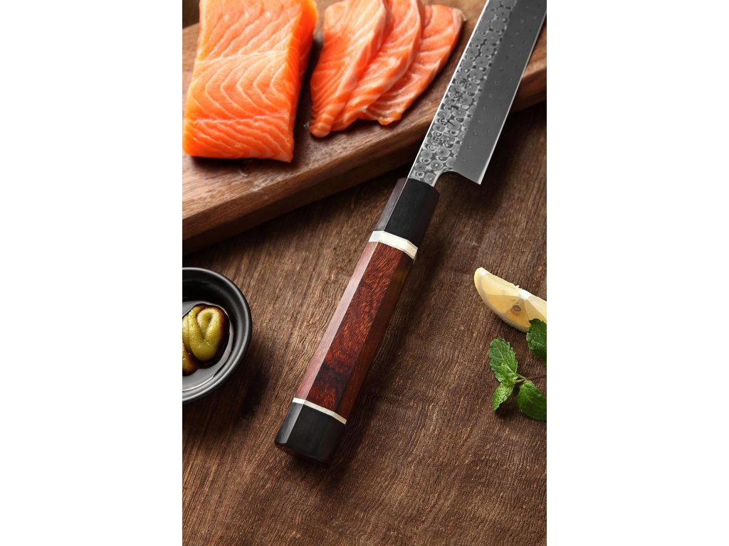 Spezielles Sashimi Messer im japanischen Stil mit 270-mm-Klinge aus hochwertigem Damaststahl, ideal zum Schneiden perfekter Scheiben von Fischfleisch nicht nur für Sushi. Mit traditioneller japanischer achteckiger Griffform.